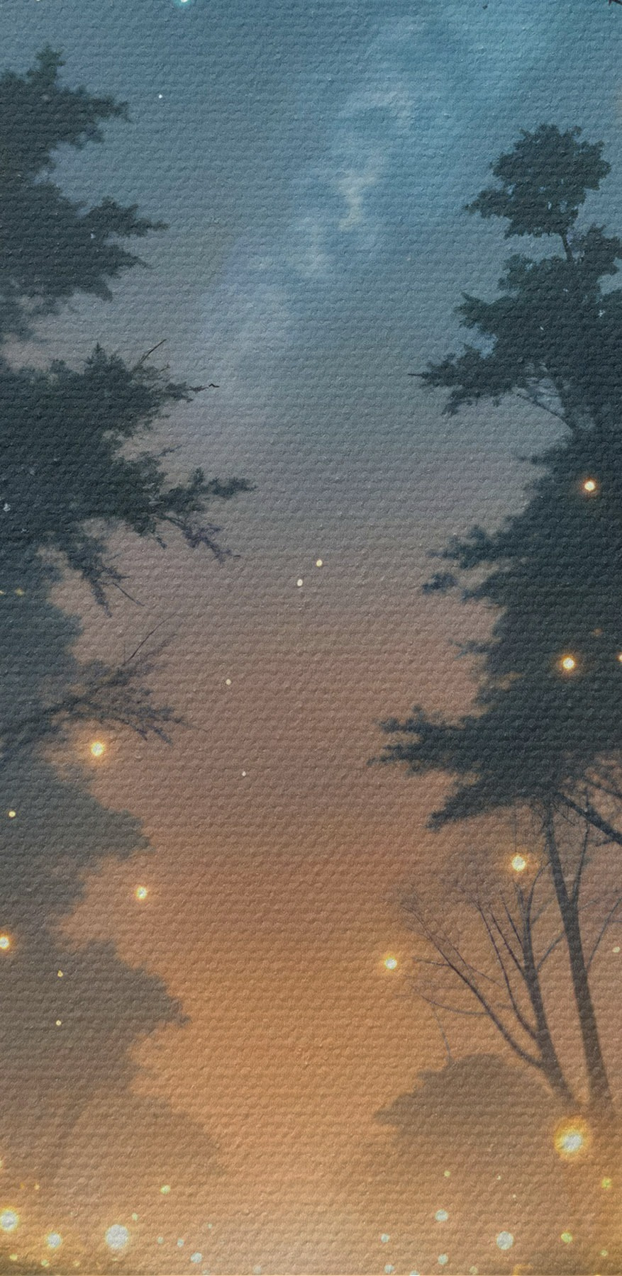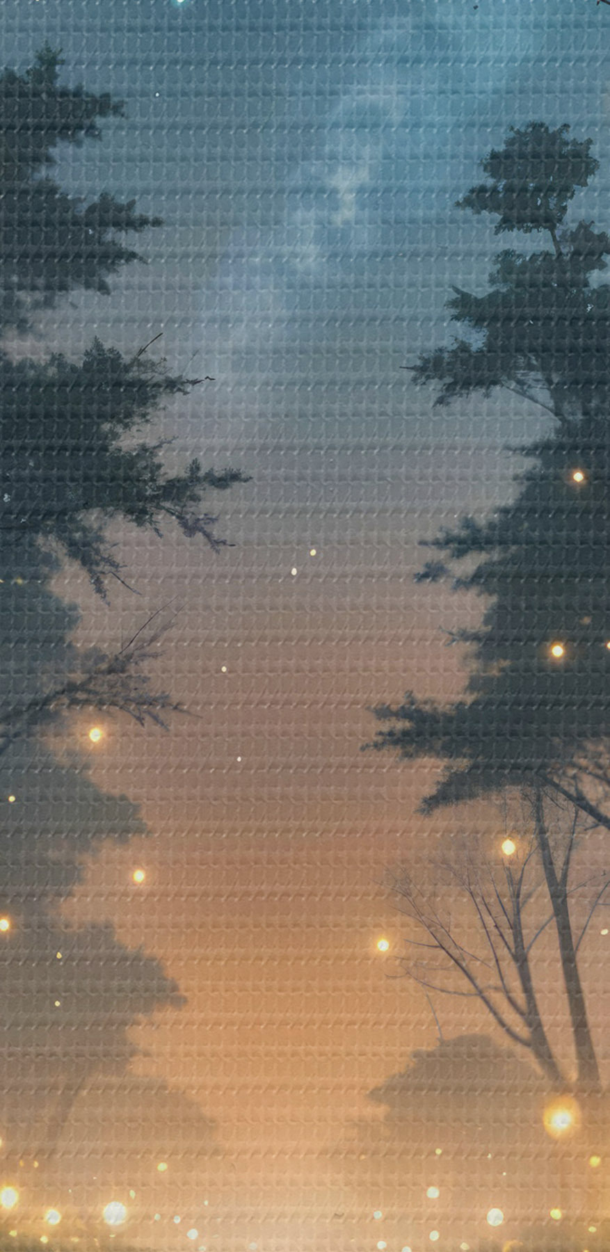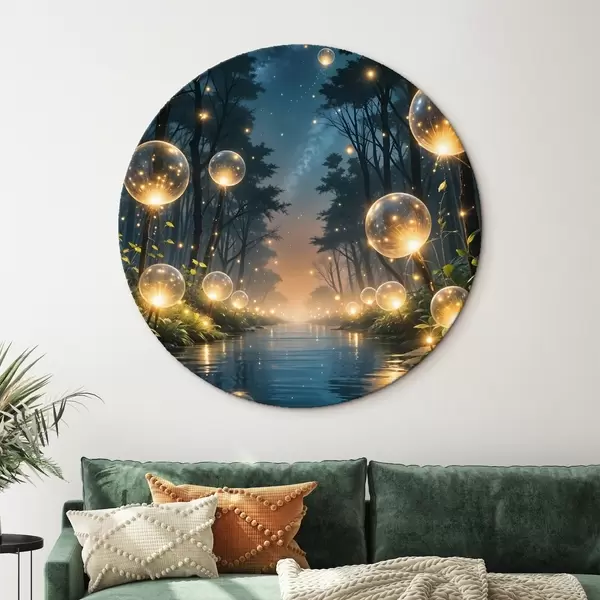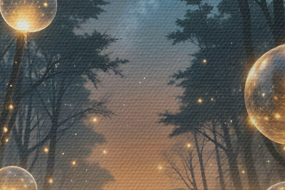 Nuotrauka Magiškas naktinis miškas, kuriame tarp medžių plaukioja geltoni rutuliukai ir švieselės, sukuriančios nuotaikingą atmosferą Nr r41259