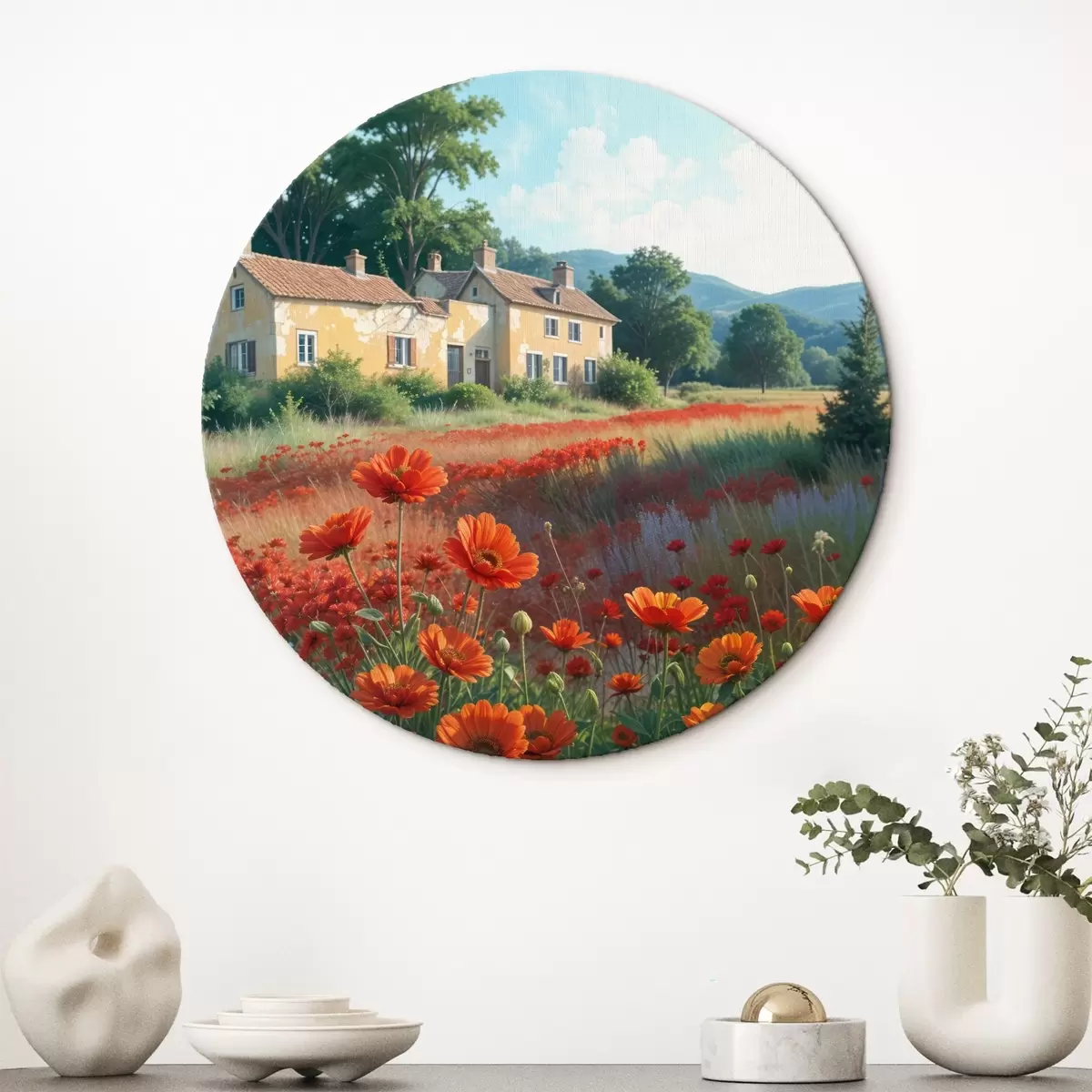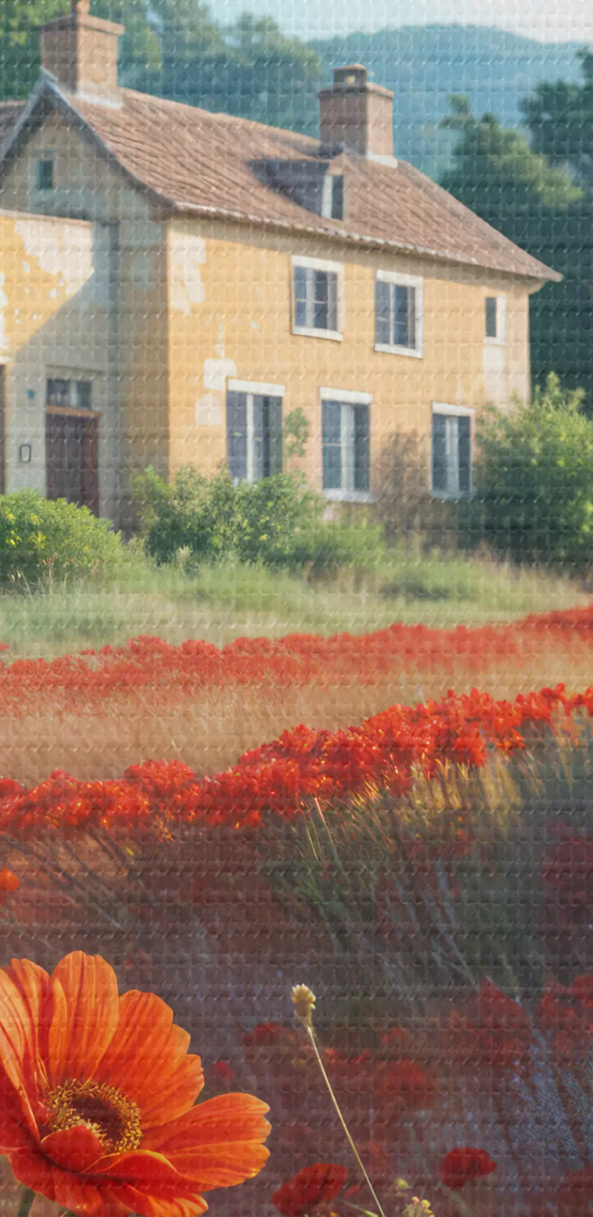 Nuotrauka Ryškiai raudonų aguonų laukas pirmame plane, o fone - žavių geltonų ir baltų namų eilė Nr r41260