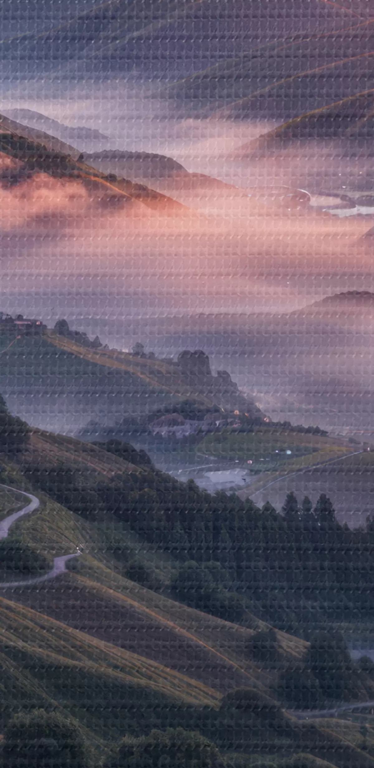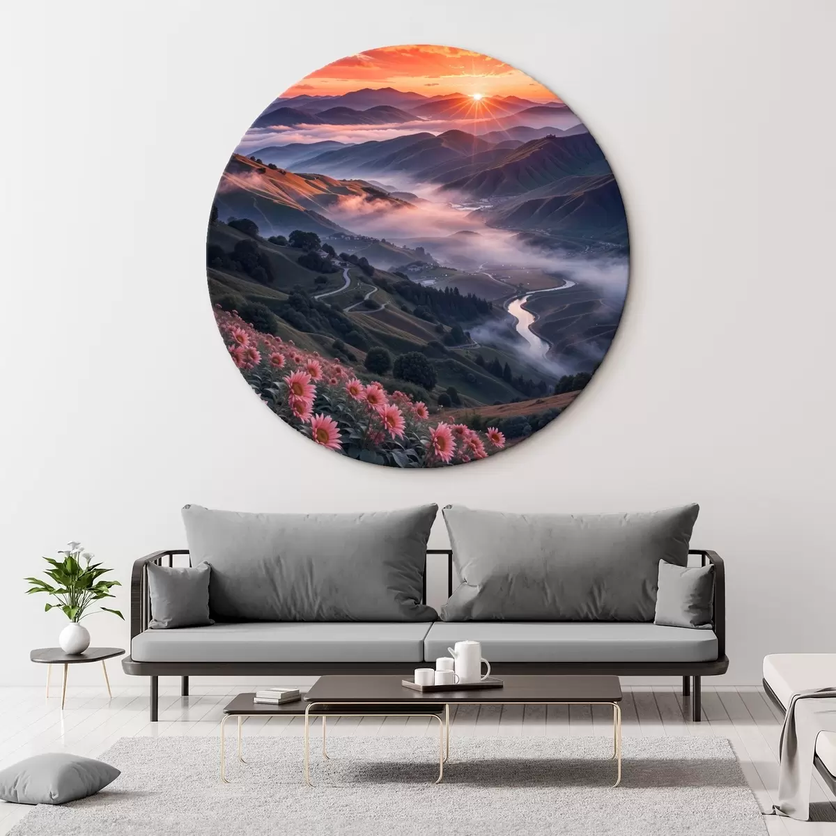 Nuotrauka Kvapą gniaužiantis kraštovaizdis su ryškiu saulėlydžiu virš kalnuoto regiono su rausvų gėlių kekėmis Nr r41263
