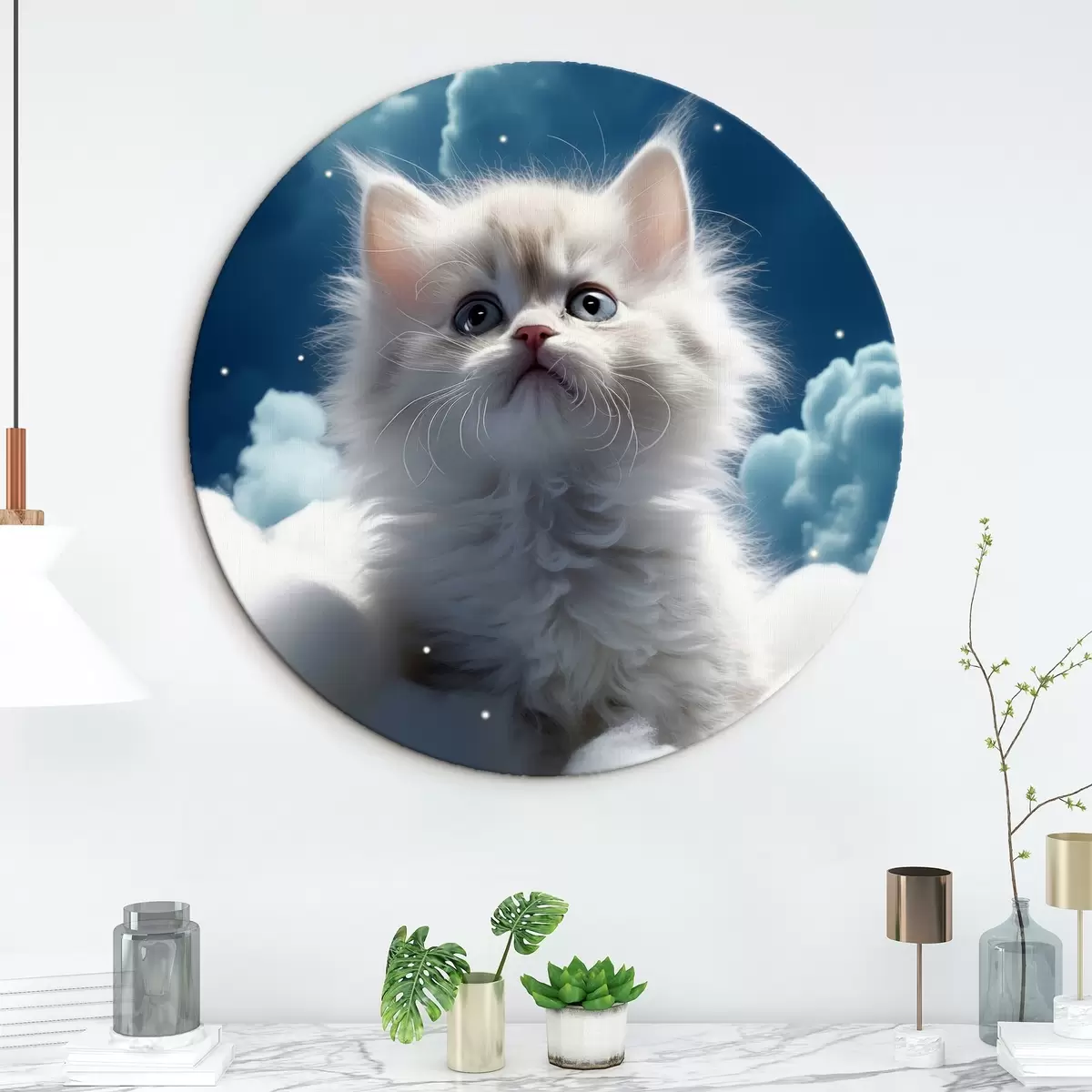 Nuotrauka Baltas pūkuotas kačiukas danguje sėdi ant debesies Nr r41279
