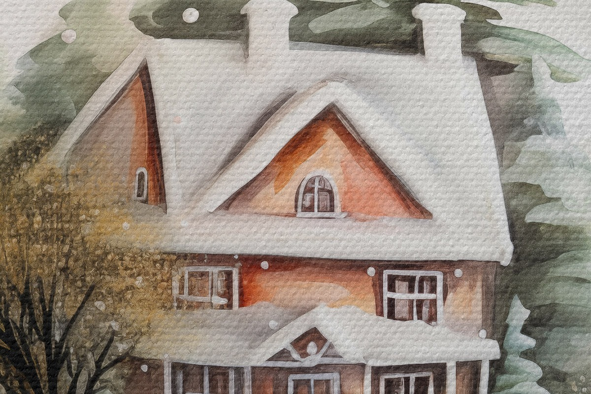 Nuotrauka Krištolinis rutulys su akvareliniu namu ir medžiais sniege Nr r41365