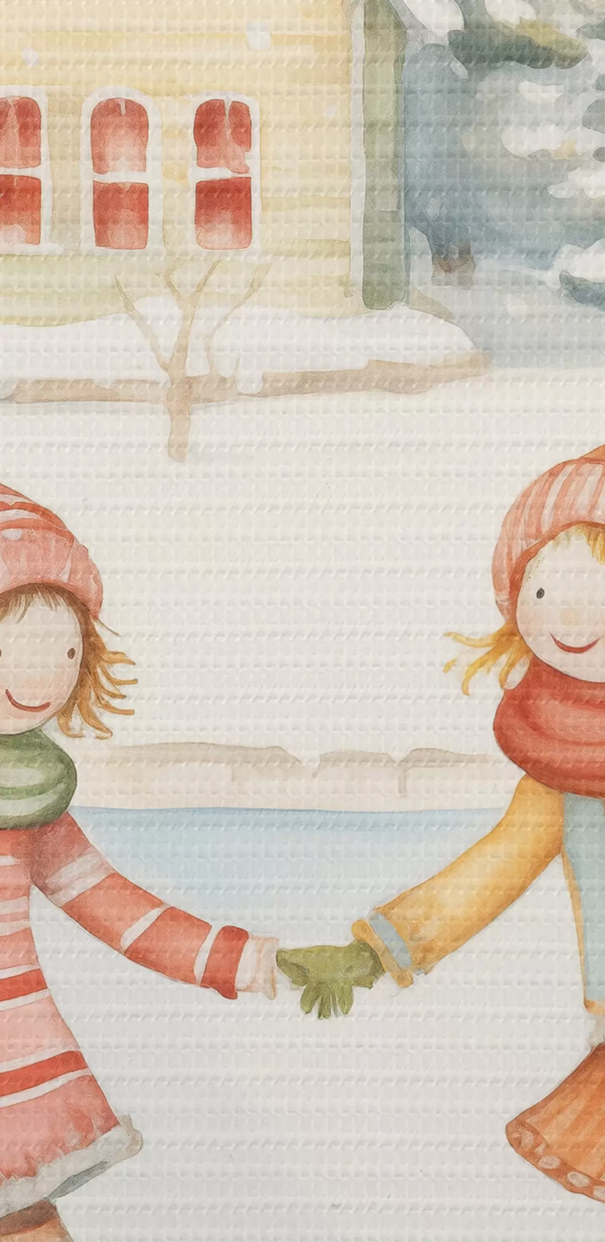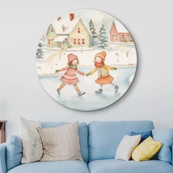 Nuotrauka Žiemos scena su dviem mergaitėmis, čiuožiančiomis slidėmis, žiemos miestas, namai, miškas Nr r41377