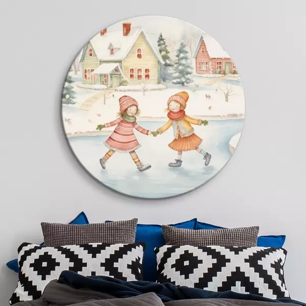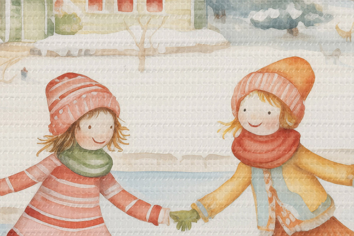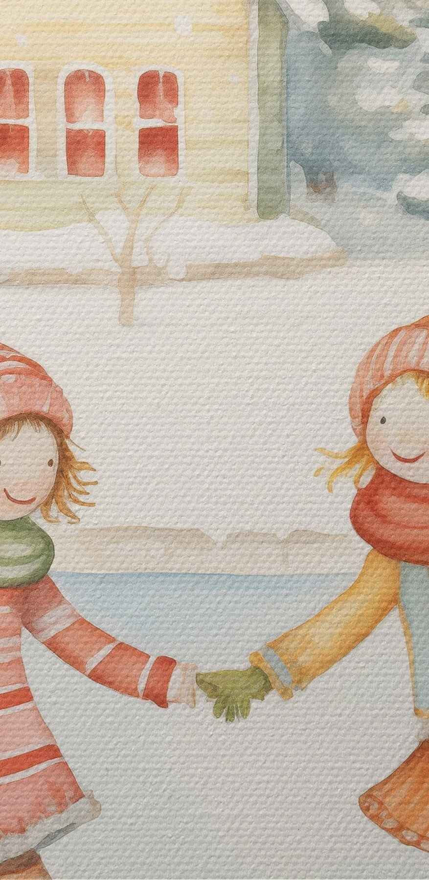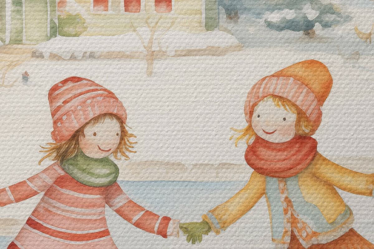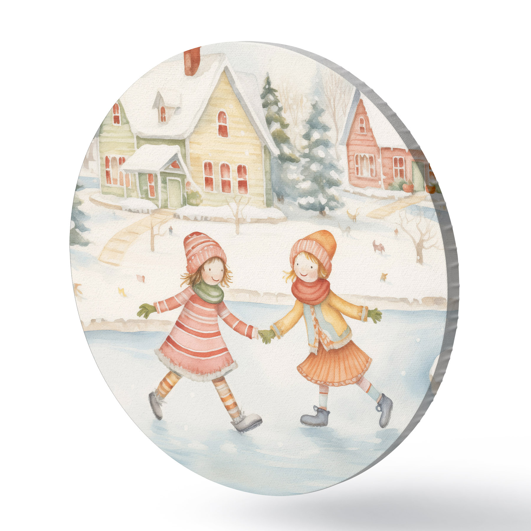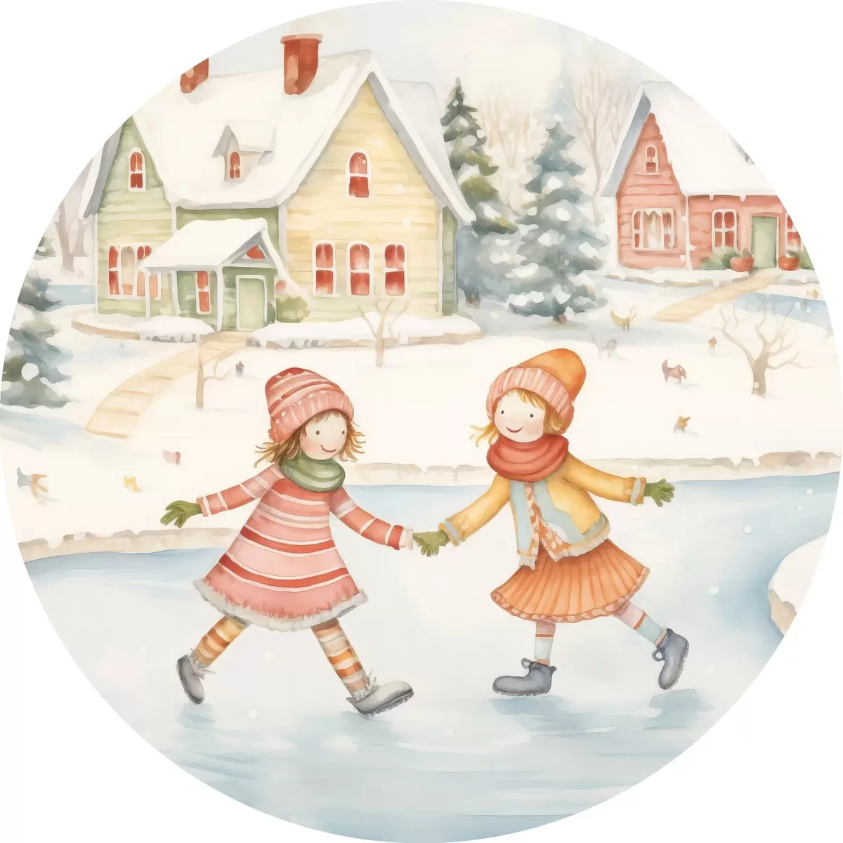 Nuotrauka Žiemos scena su dviem mergaitėmis, čiuožiančiomis slidėmis, žiemos miestas, namai, miškas Nr r41377