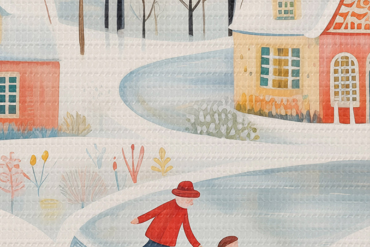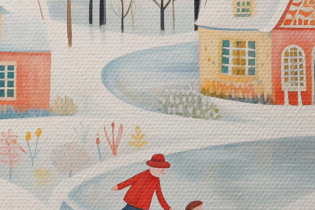 Nuotrauka Žiemos kaimas, miškas, gėlės, čiuožyklos, spalvingi namai Nr r41378