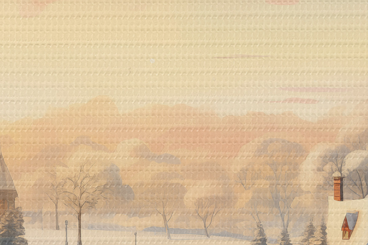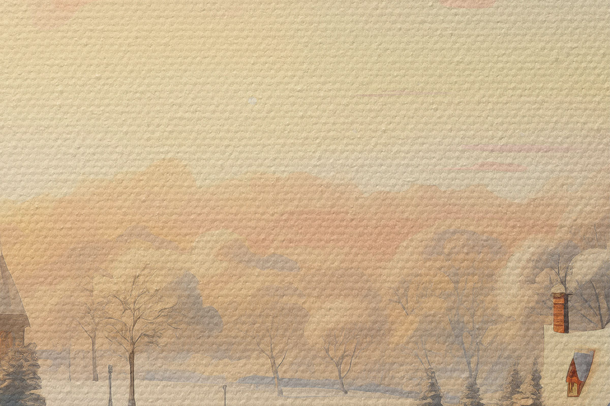 Nuotrauka Žiemos stebuklų šalis, namai, saulėlydžio dangus, medžiai, akvarelė Nr r41383