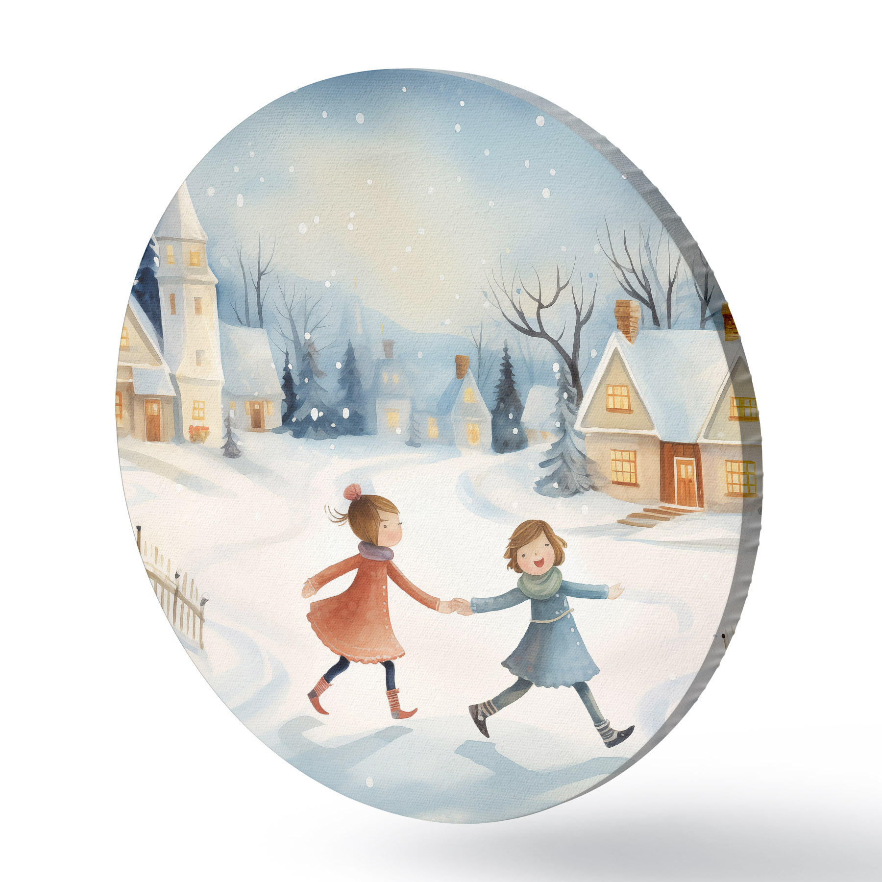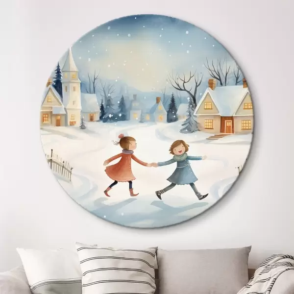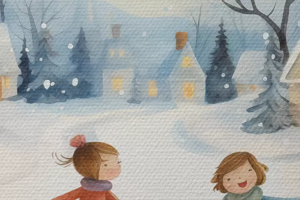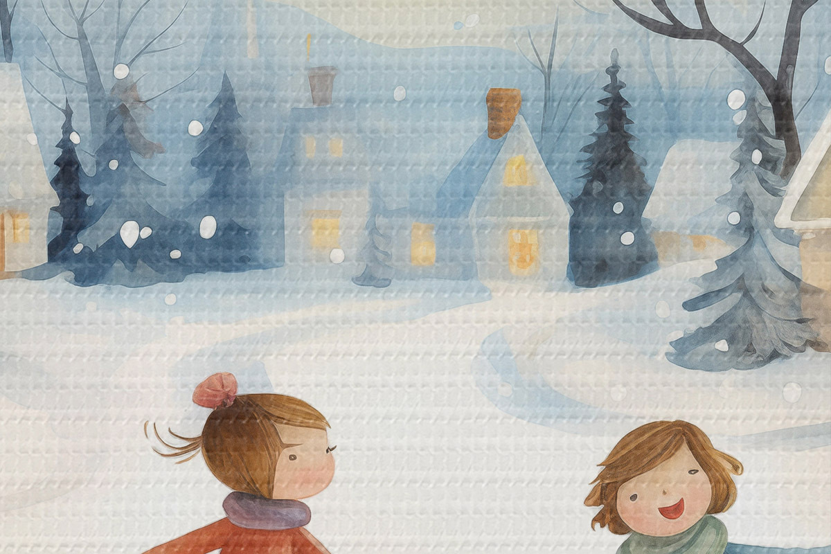 Nuotrauka Mergaitės žiemos kaime, snaigės, akvarelė, namai, miškas Nr r41385