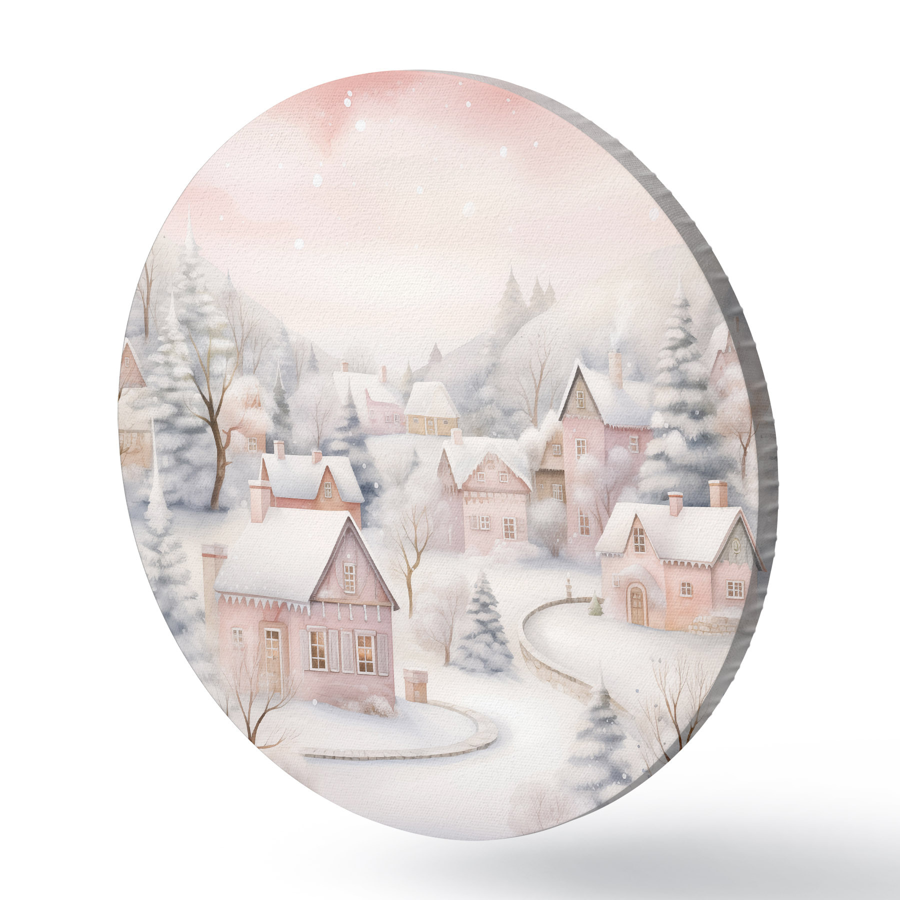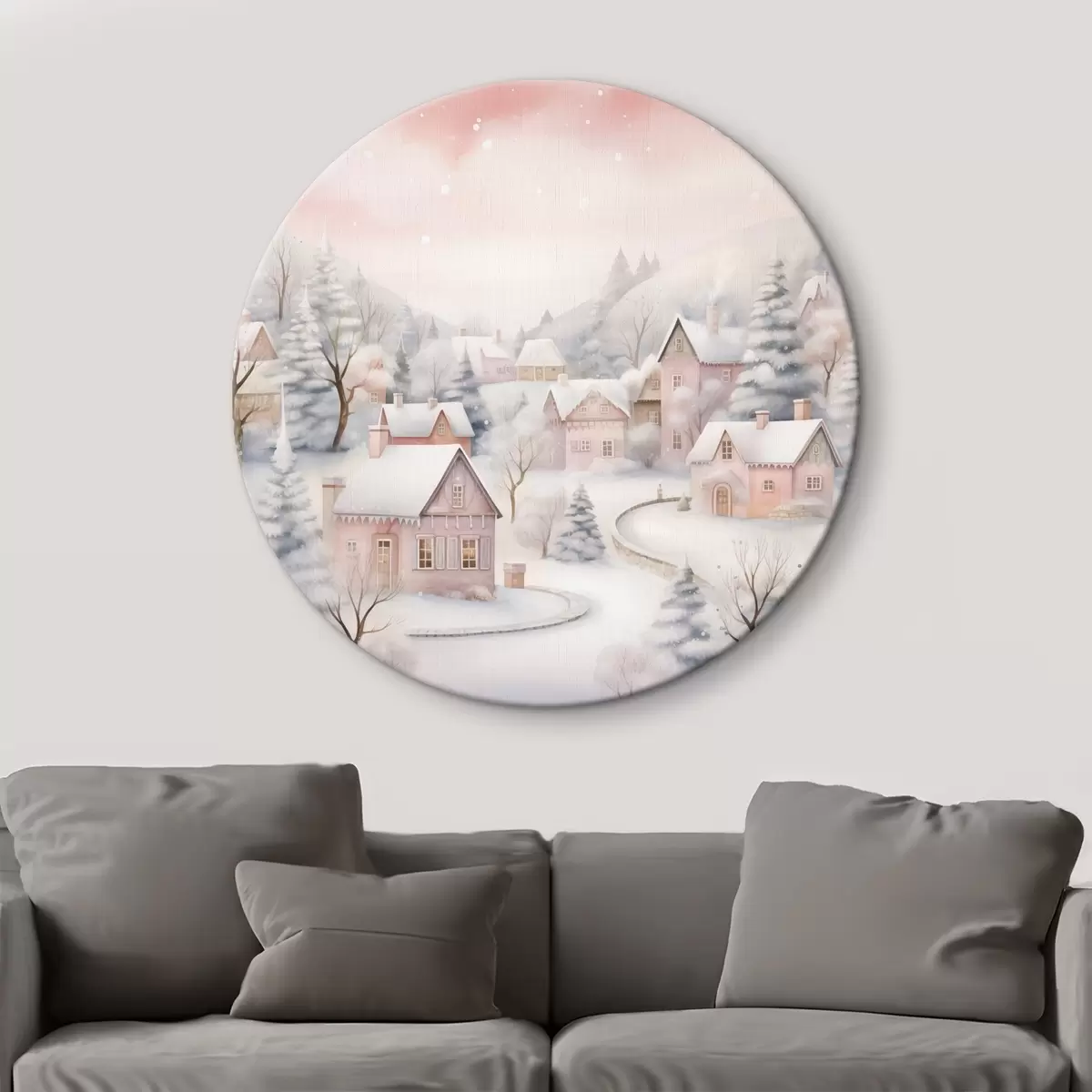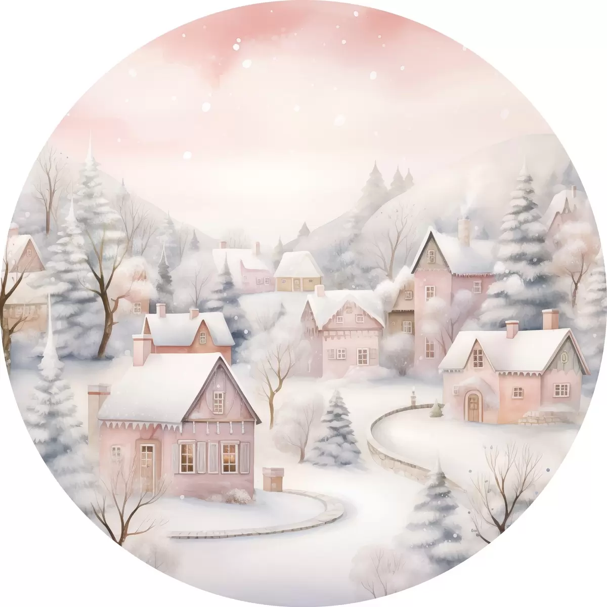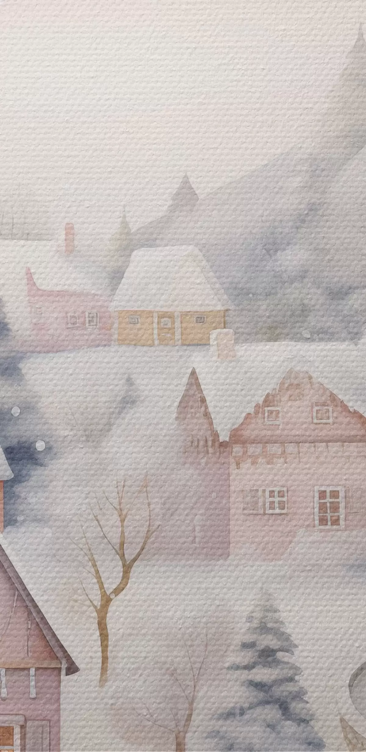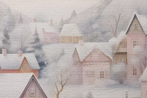 Nuotrauka Akvarelė žiemos kaimas, pušynas, namai, kalnai, švelnios pastelinės spalvos Nr r41388