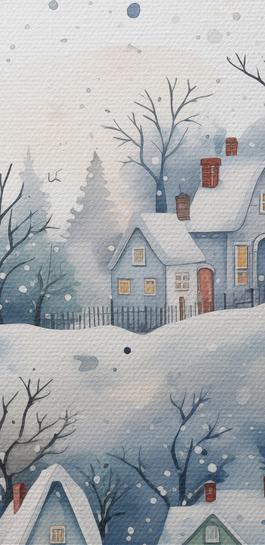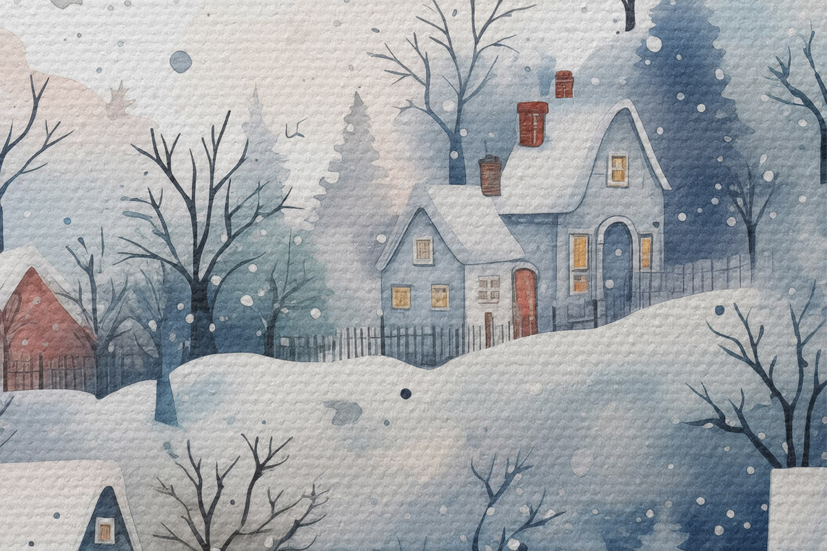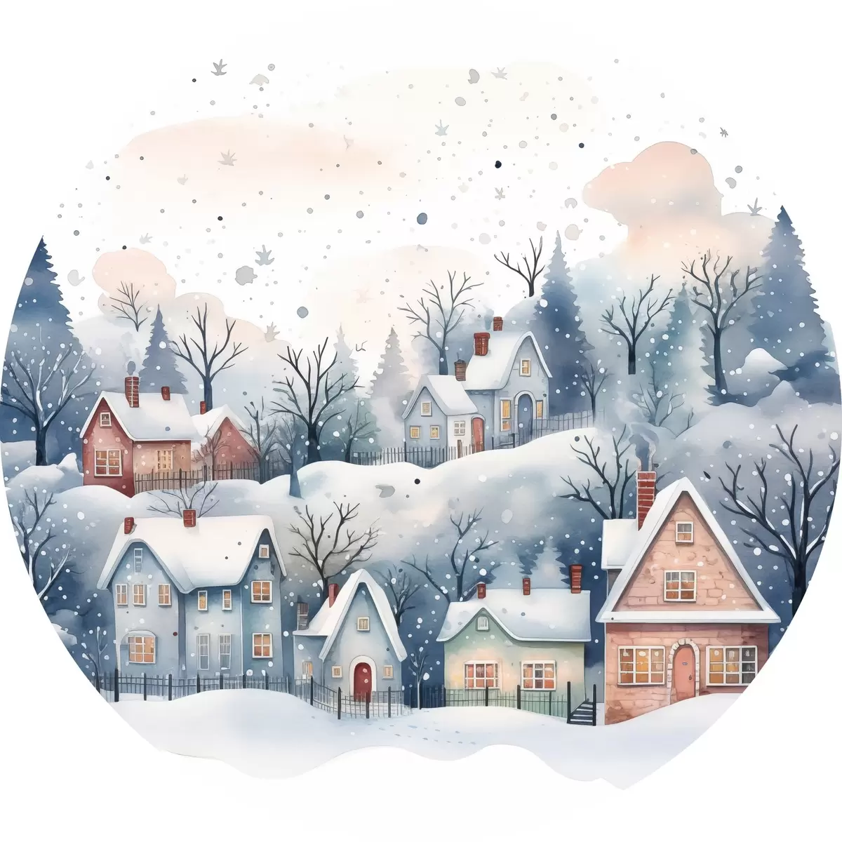 Nuotrauka Akvarelinis žiemos peizažas su namais ir pušynu Nr r41389