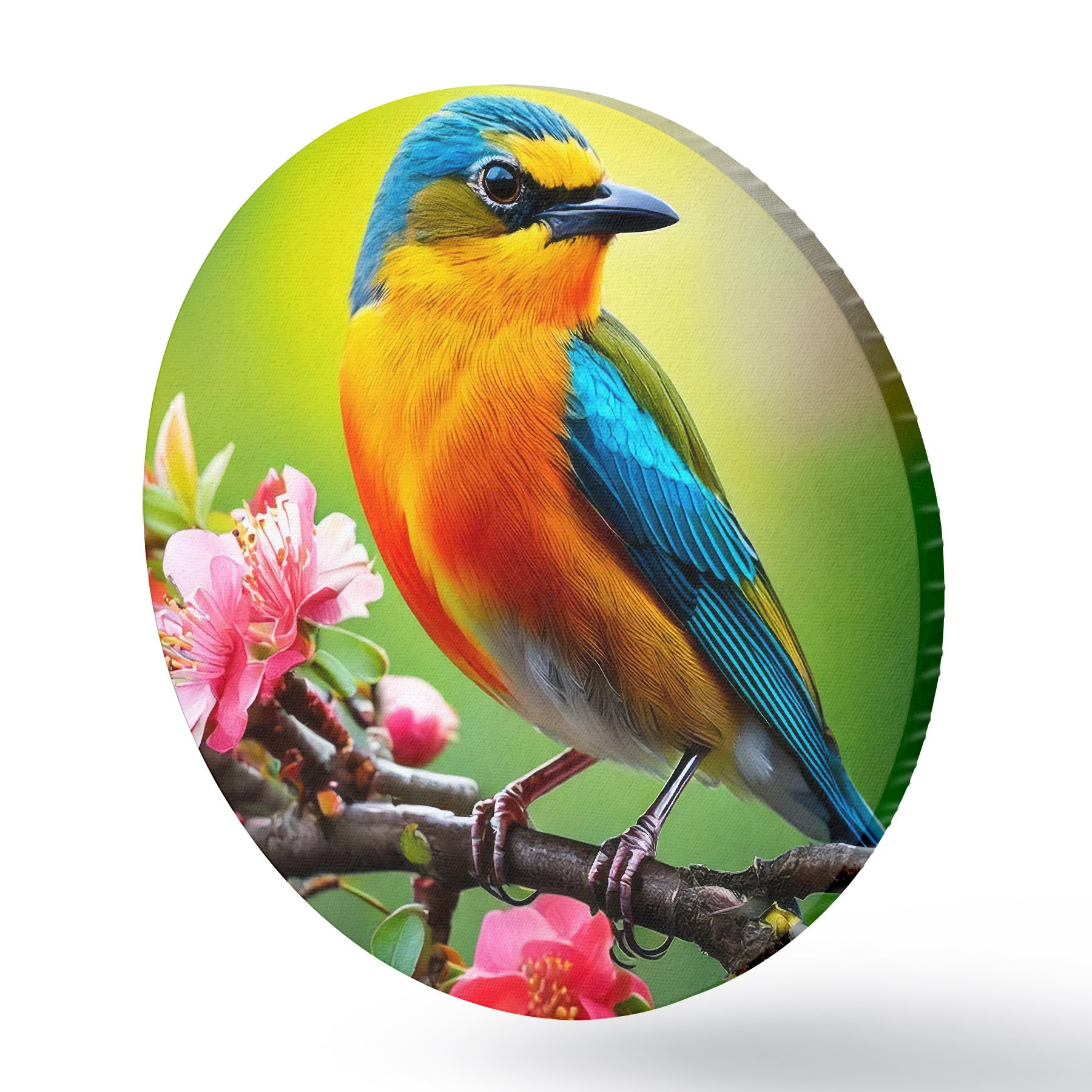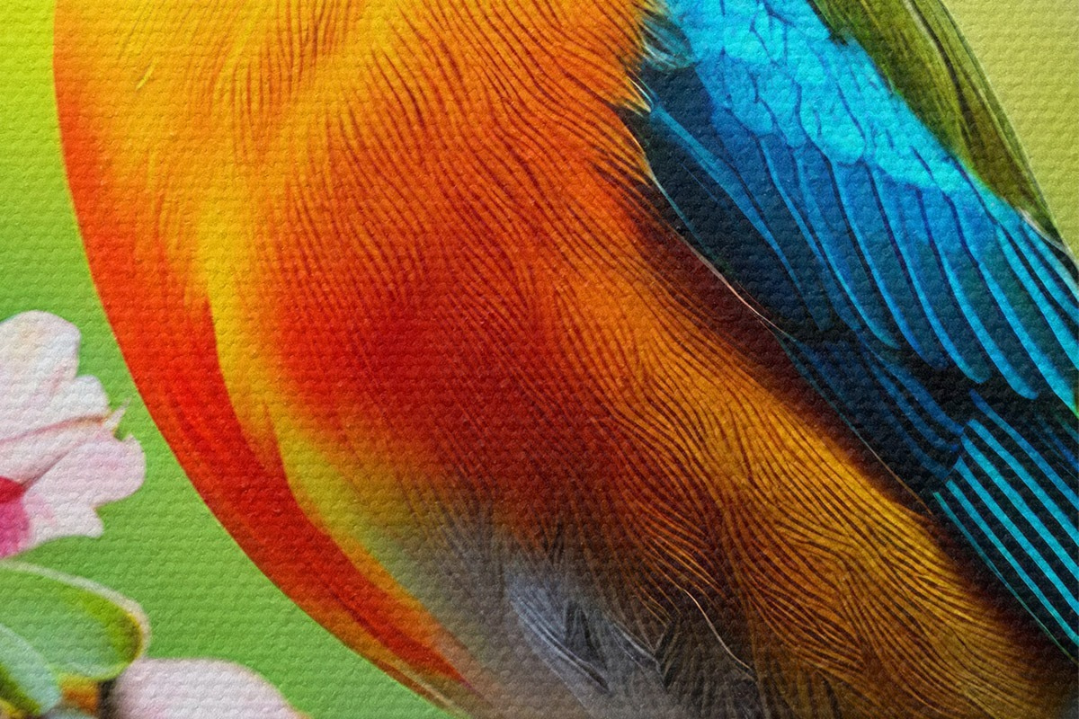 Nuotrauka ryškus paukštis ant šakos su gėlėmis Nr r41412