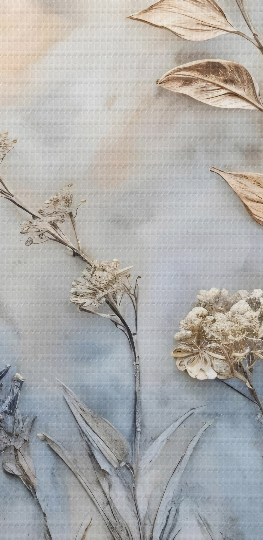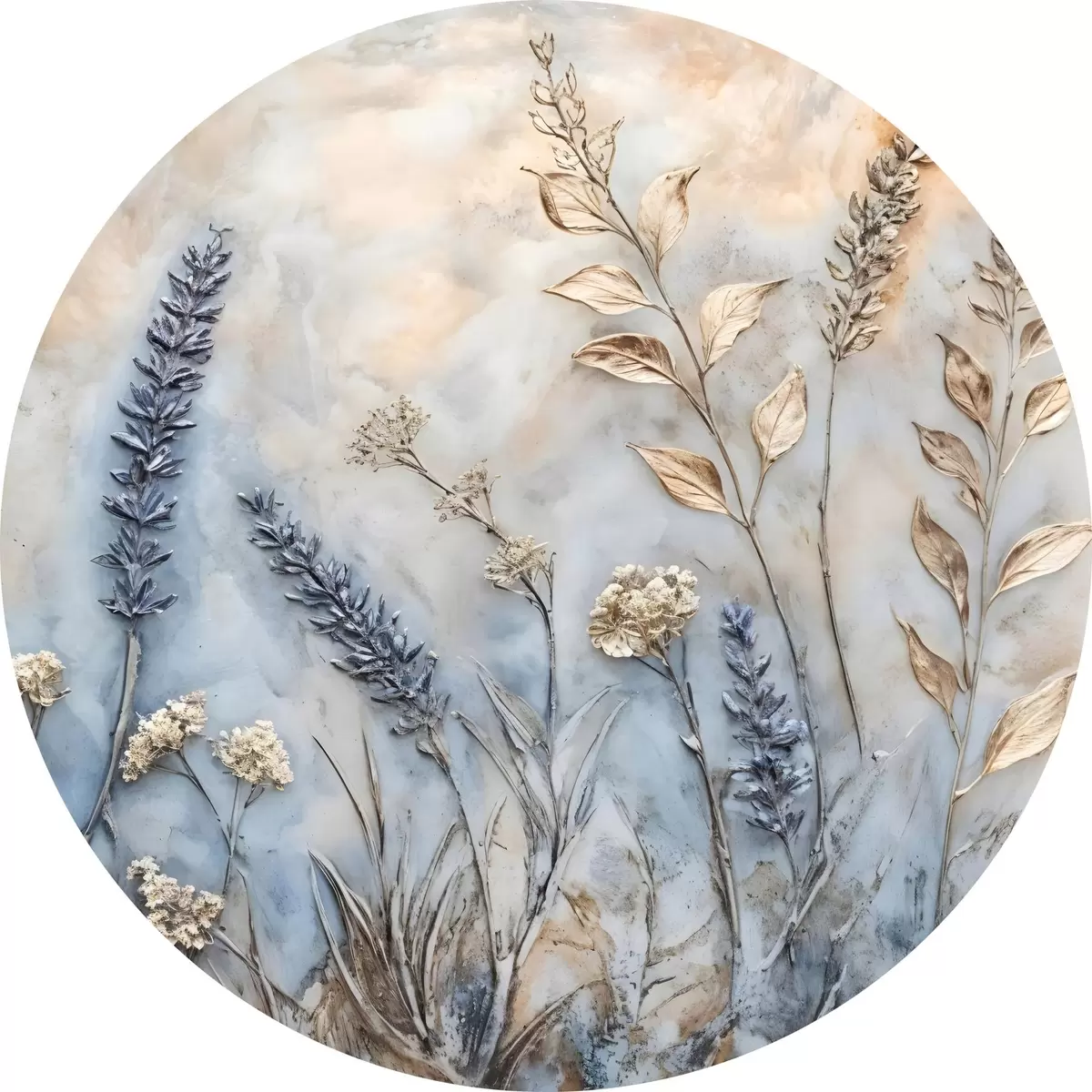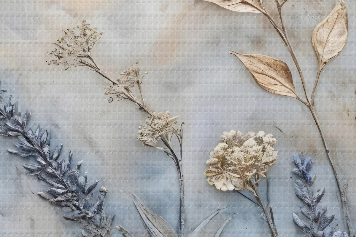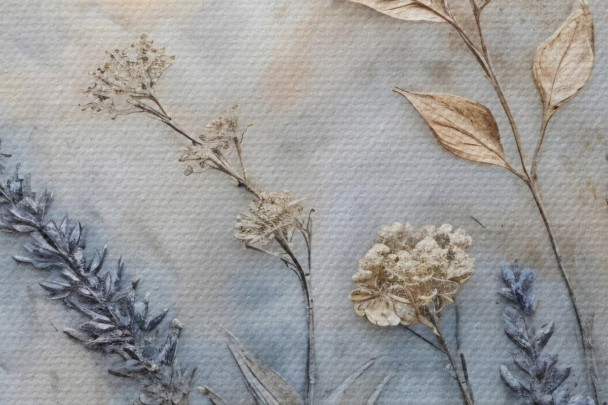Nuotrauka Mėlynos, baltos ir smėlio spalvos įvairių laukinių gėlių ir augalų laukas švelniame, miglotame fone Nr r42214