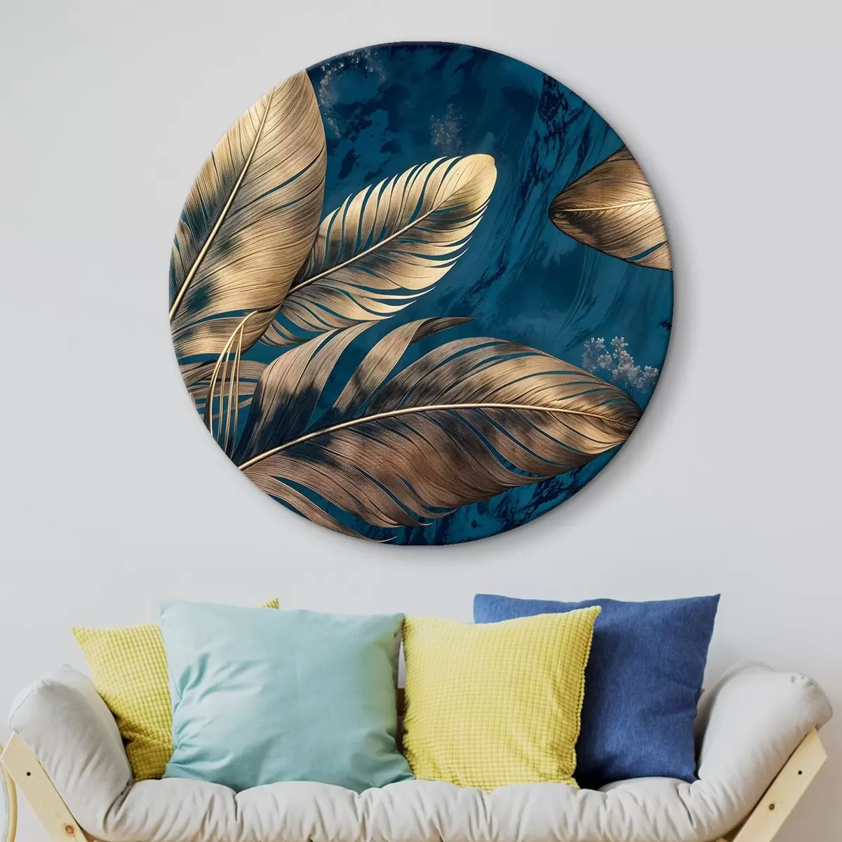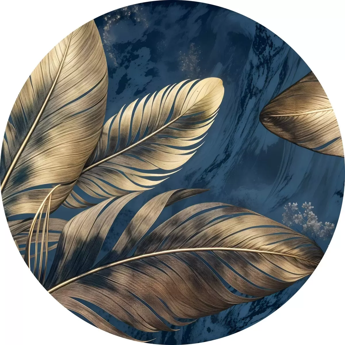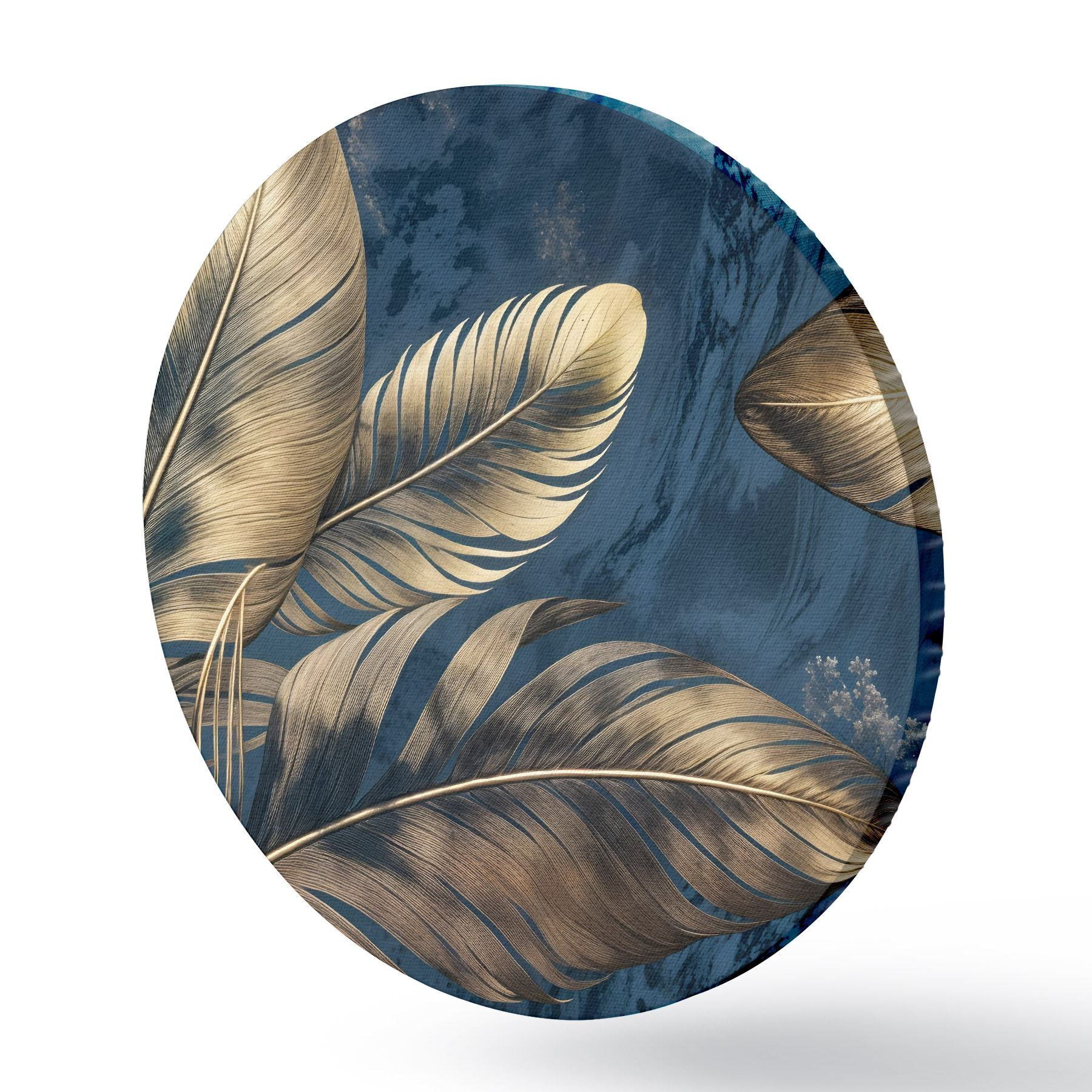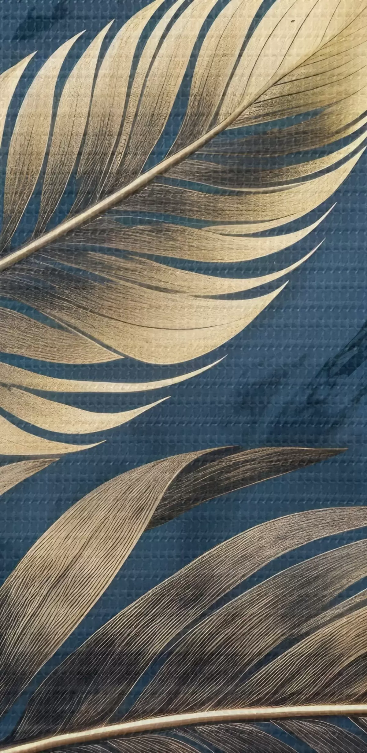 Nuotrauka Geltonos ir smėlio spalvos abstrakčios dekoratyvinės plunksnos, plūduriuojančios tamsiai mėlyname tekstūriniame fone Nr r42218