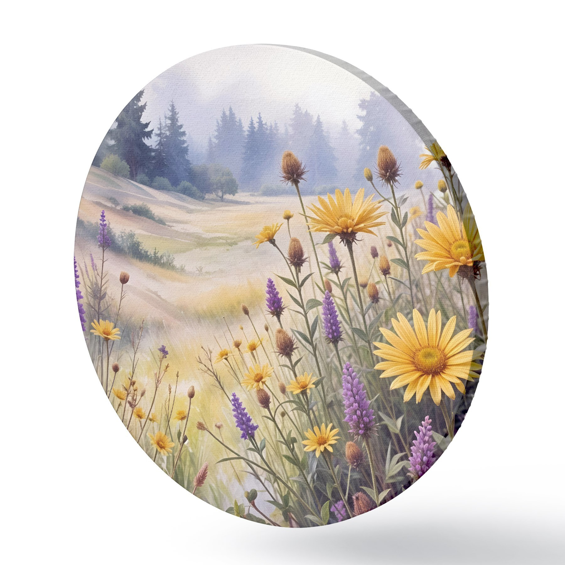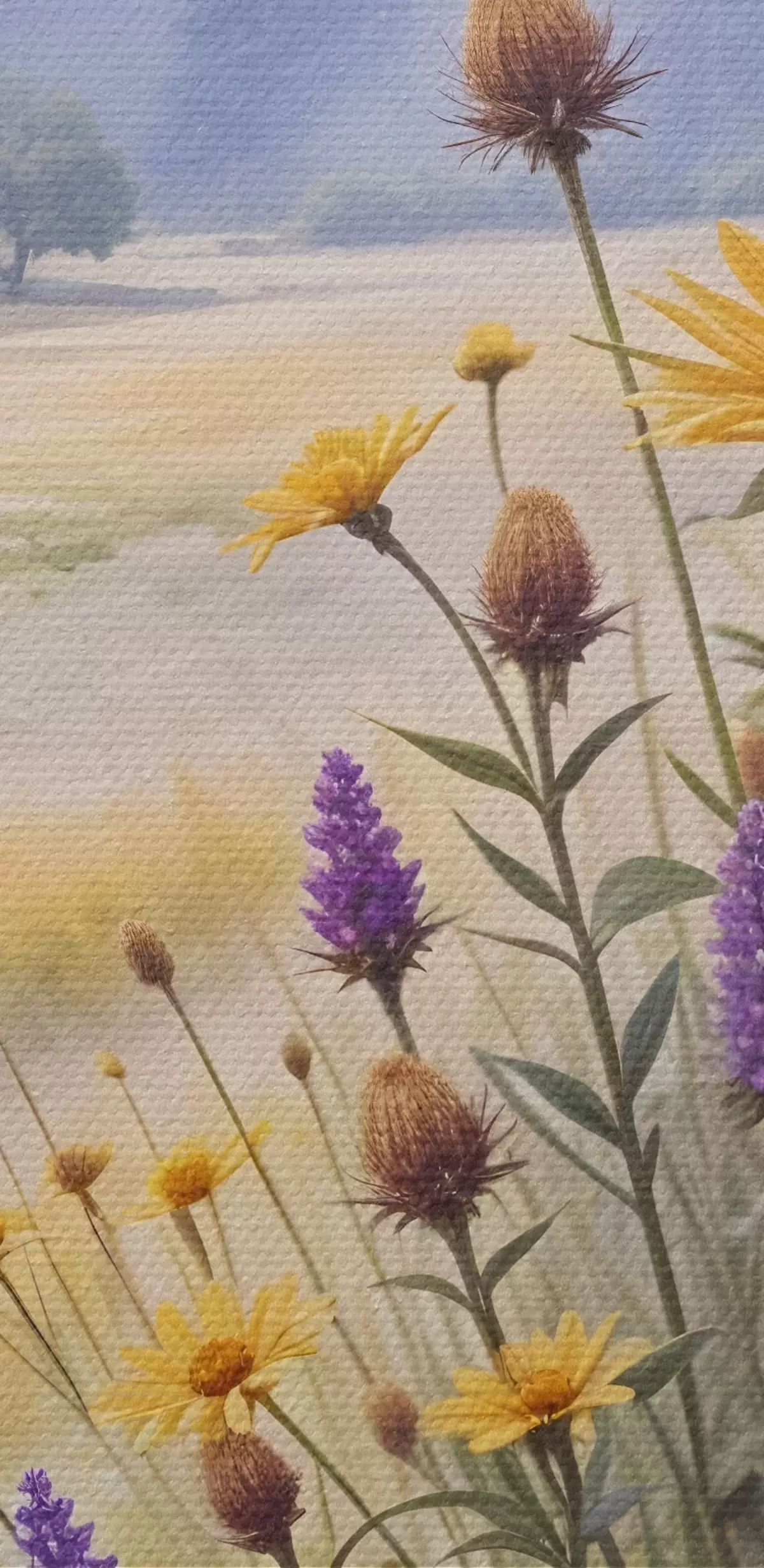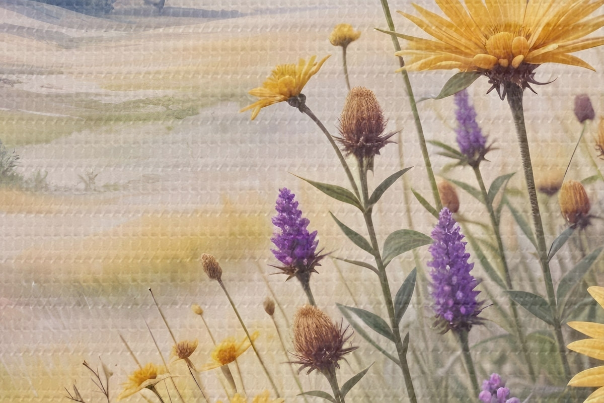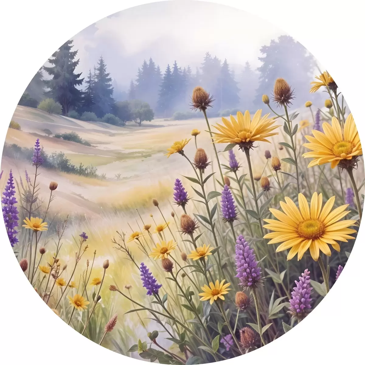 Nuotrauka Geltonų saulėgrąžų ir violetinių laukinių gėlių laukas miglotame miško kraštovaizdyje su pušimis fone Nr r42223