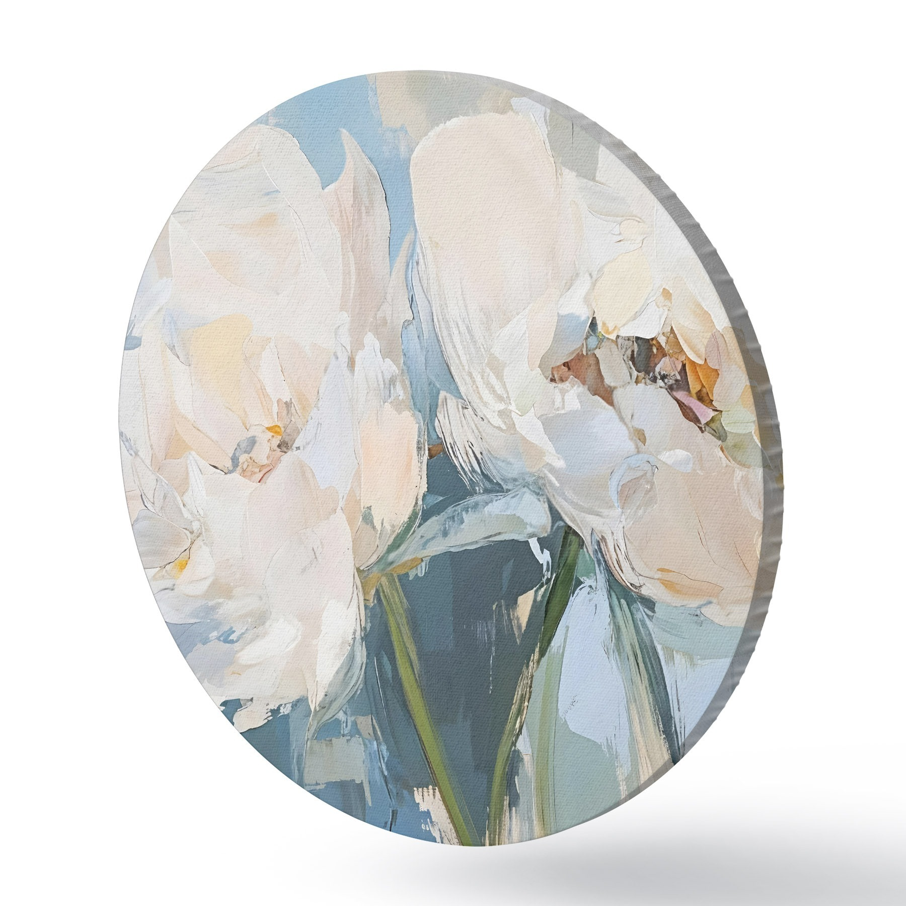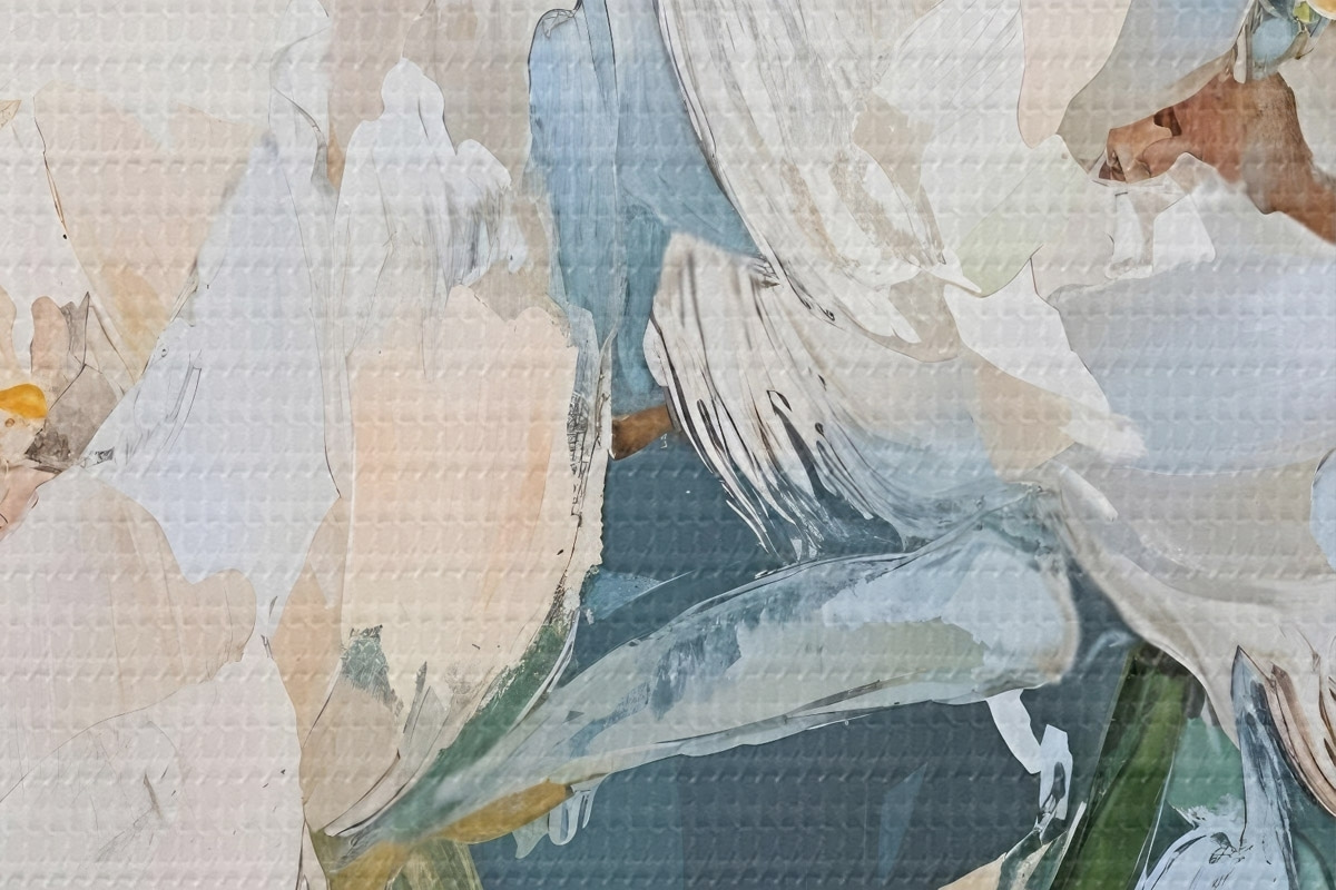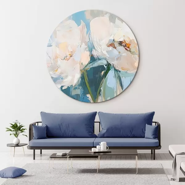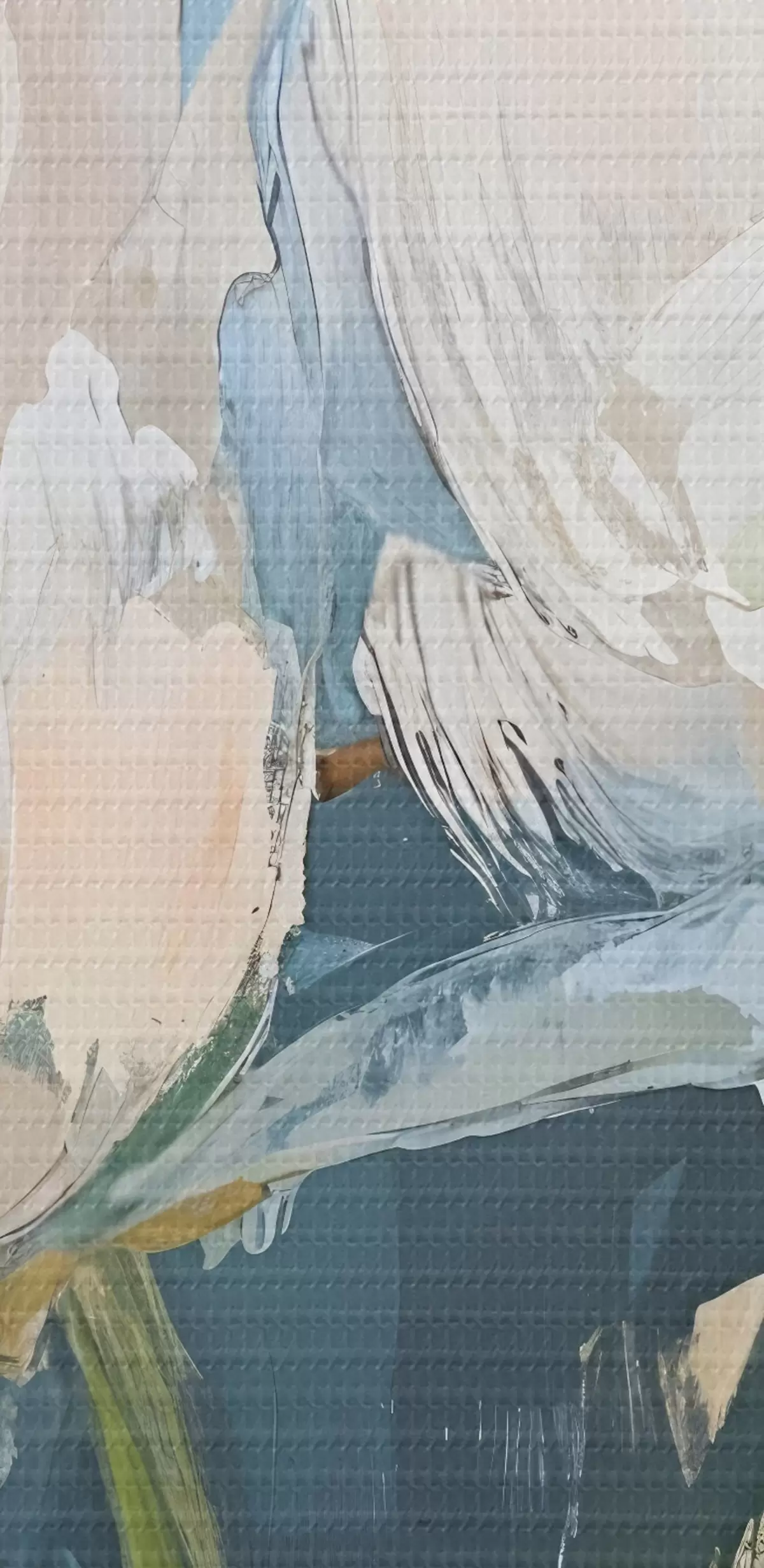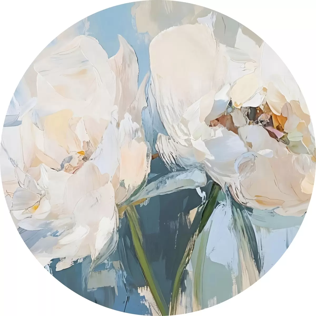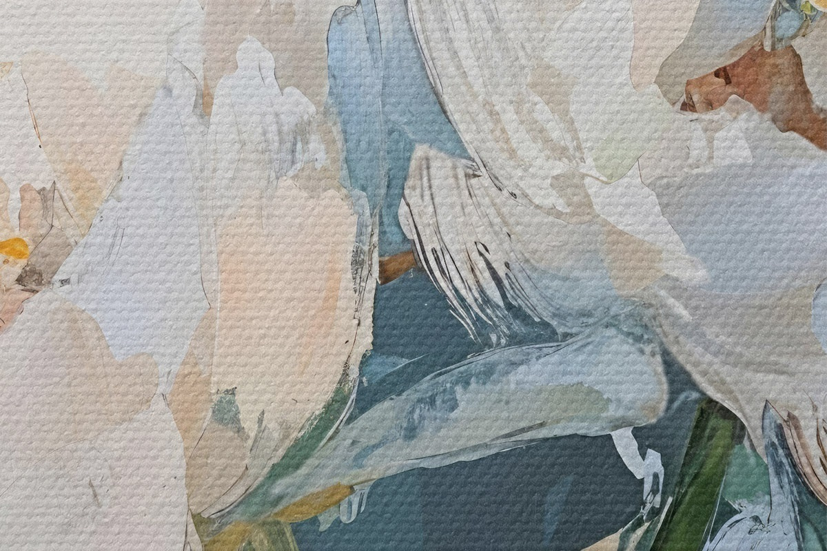 Nuotrauka Balta minimalistinė abstrakčių bijūnų aliejinės tapybos imitacija minkštame mėlyname fone Nr r42226