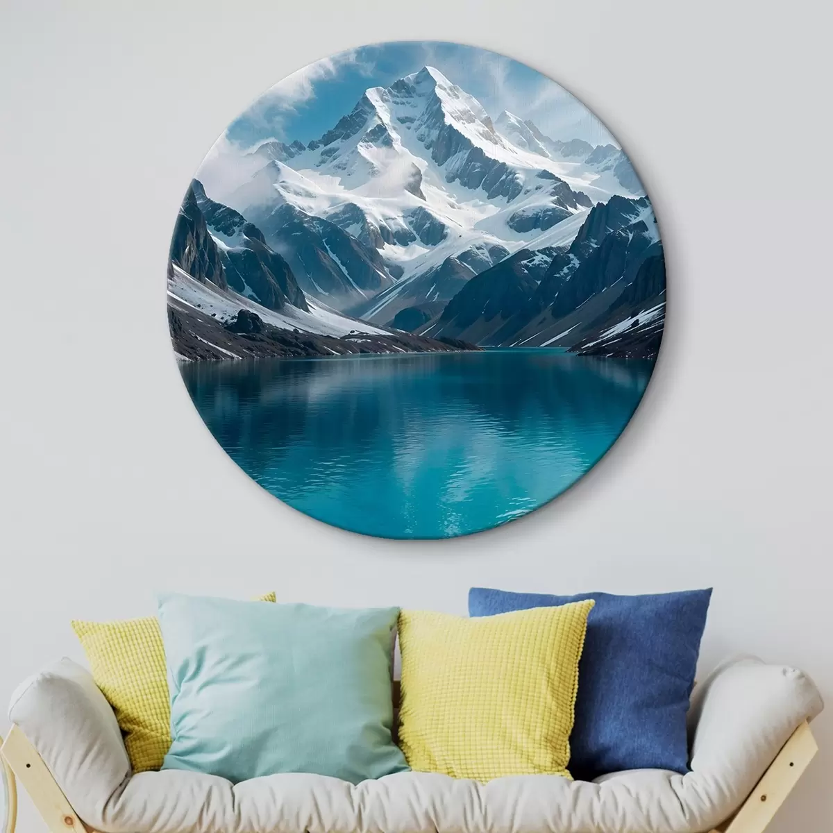 Nuotrauka Snieguota kalnų viršūnė, atsispindinti ramiame turkio spalvos ežere, apsupta uolėto reljefo ir įspūdingų debesų Nr r42232