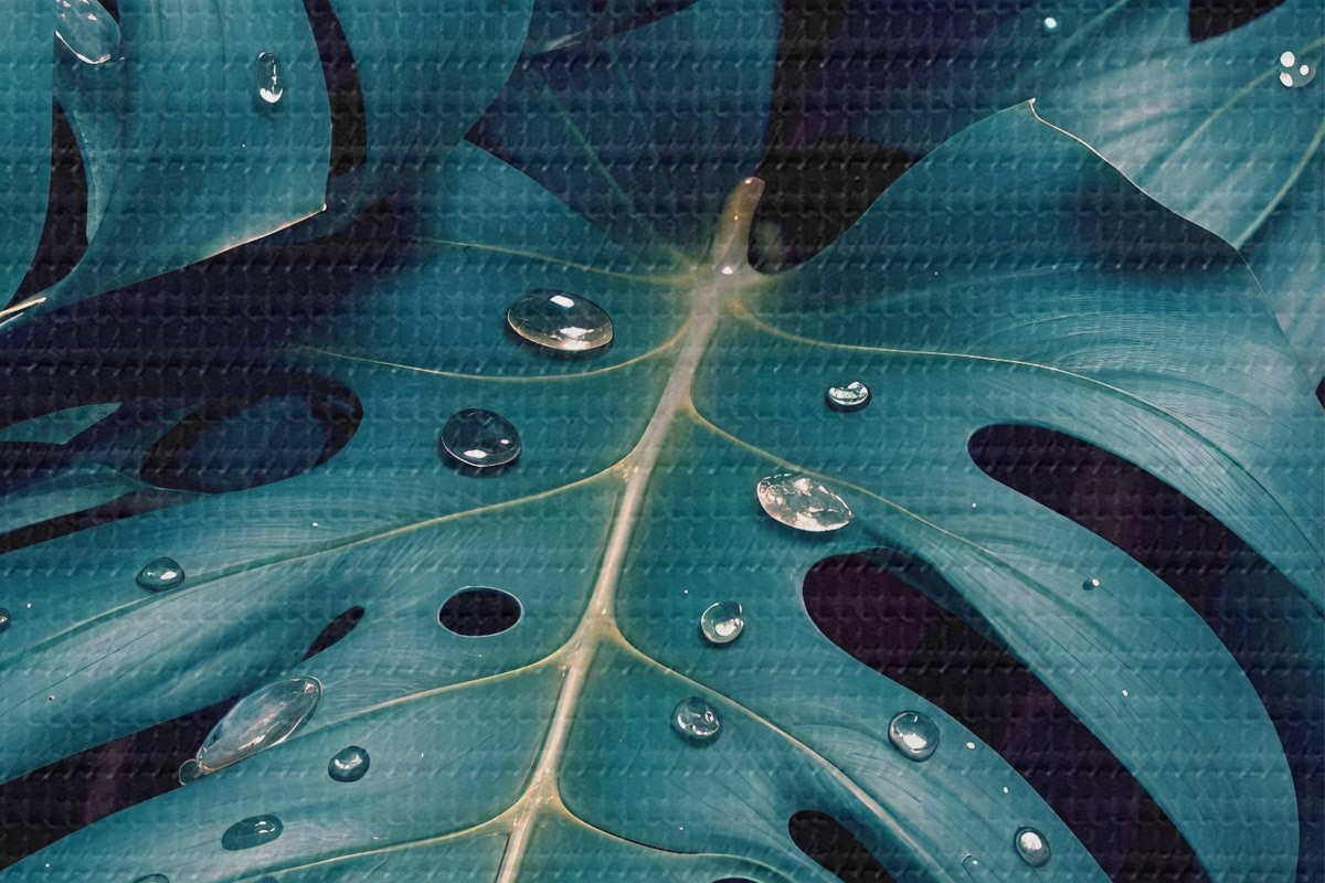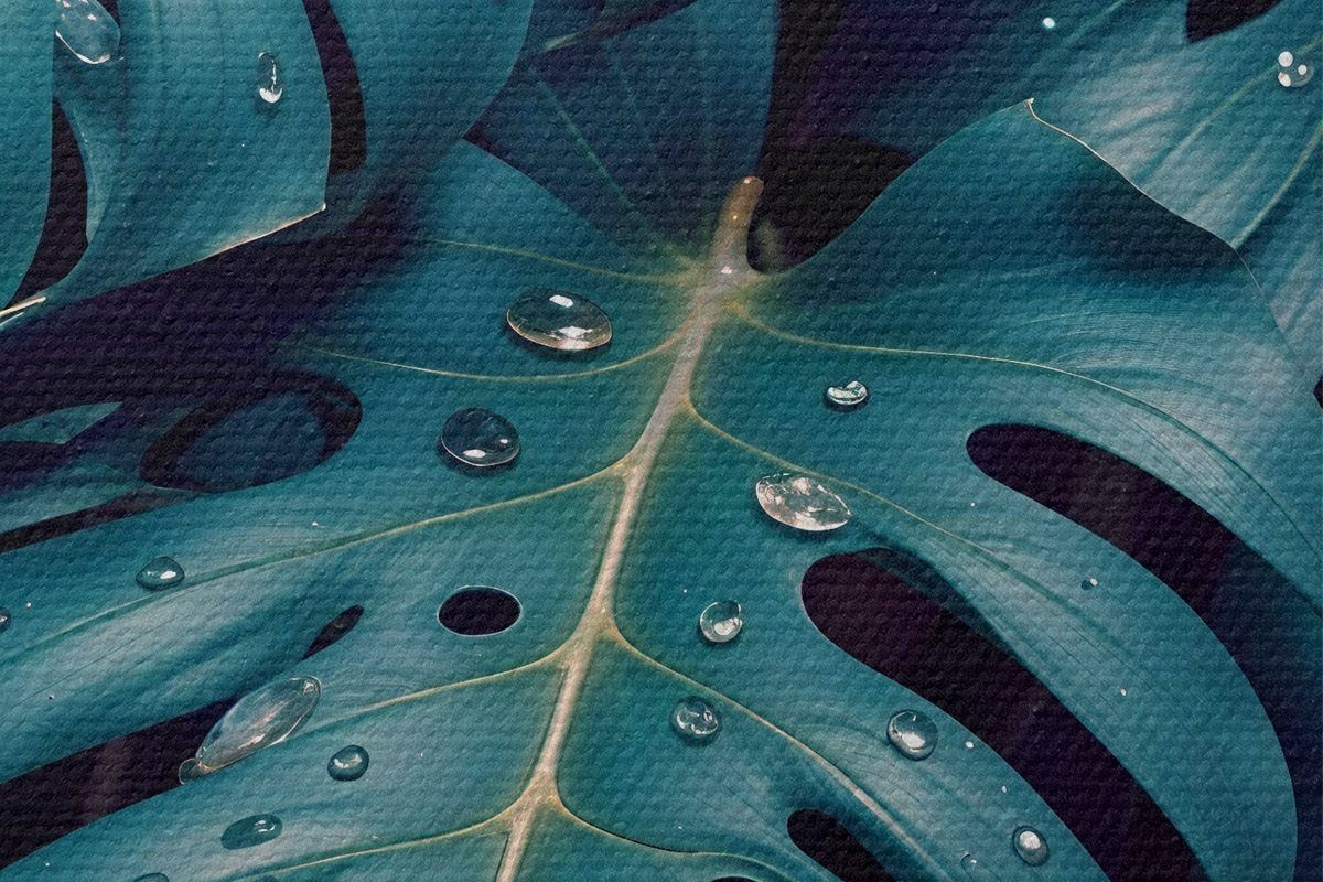 Nuotrauka Gausūs atogrąžų monsteros lapai su vandens lašeliais tamsiame fone, sukuriantys nuotaikingą ir atmosferišką atspaudą Nr r42233