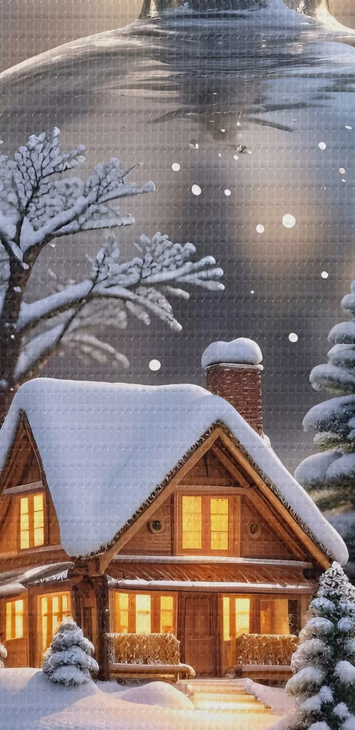 Nuotrauka Stiklinis kalėdinis gaublys su snieguotu žiemos kraštovaizdžiu viduje, kuriame pavaizduotas jaukus namelis miške su pušimis Nr r42236