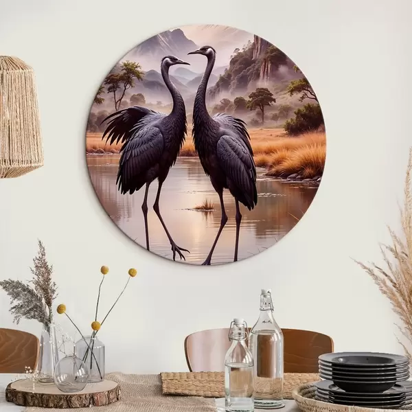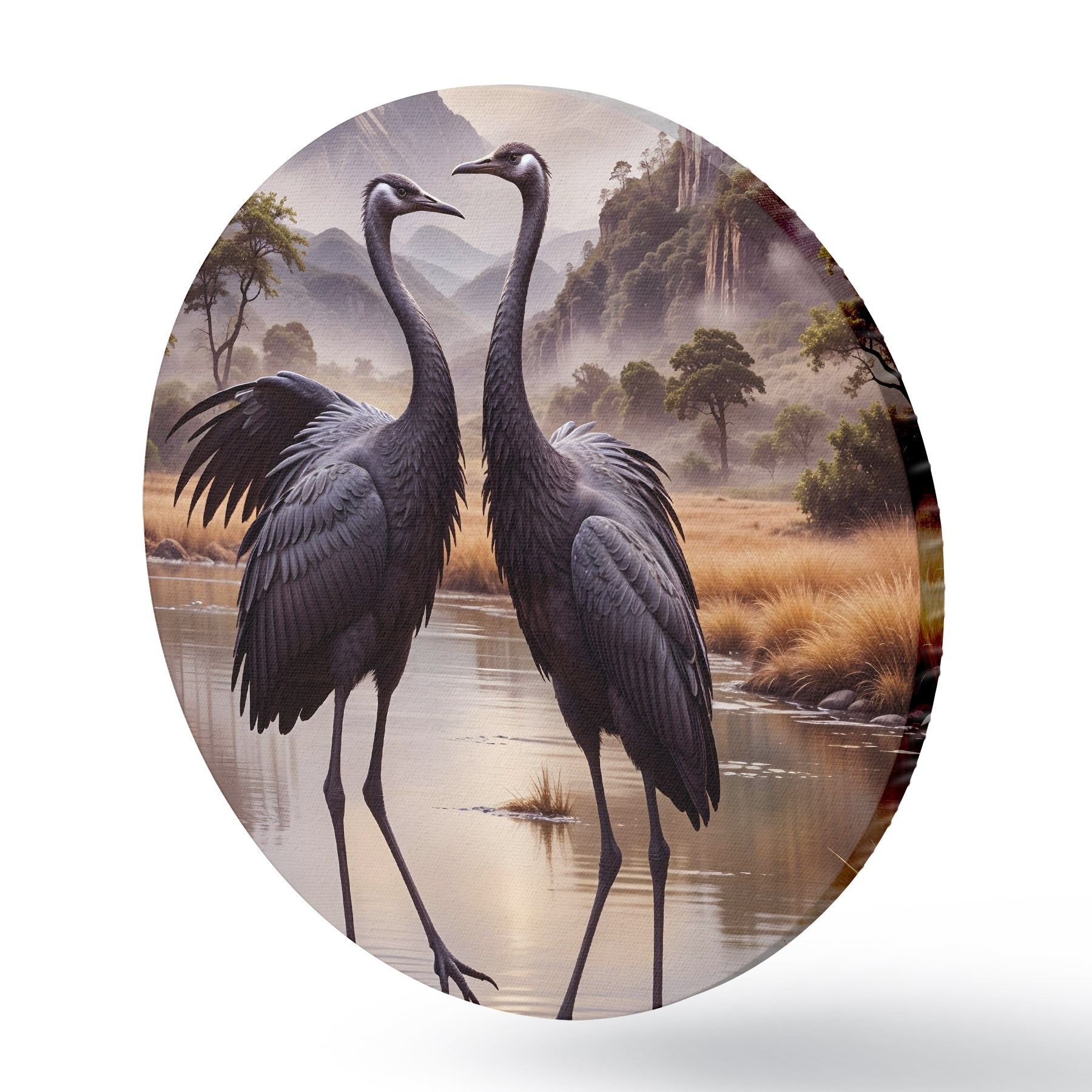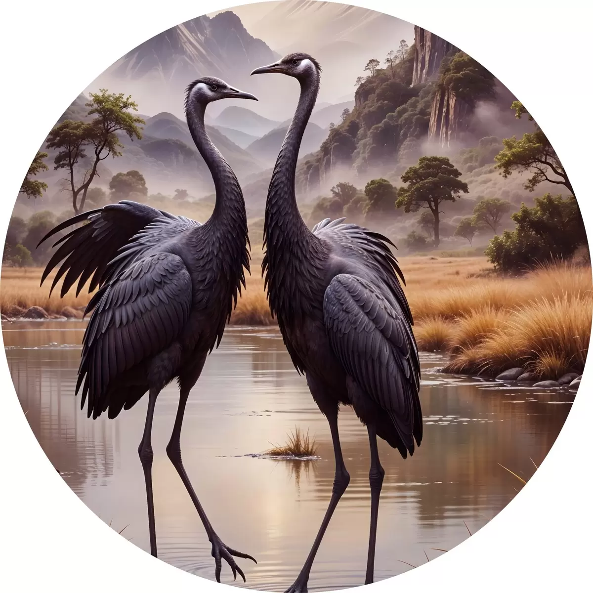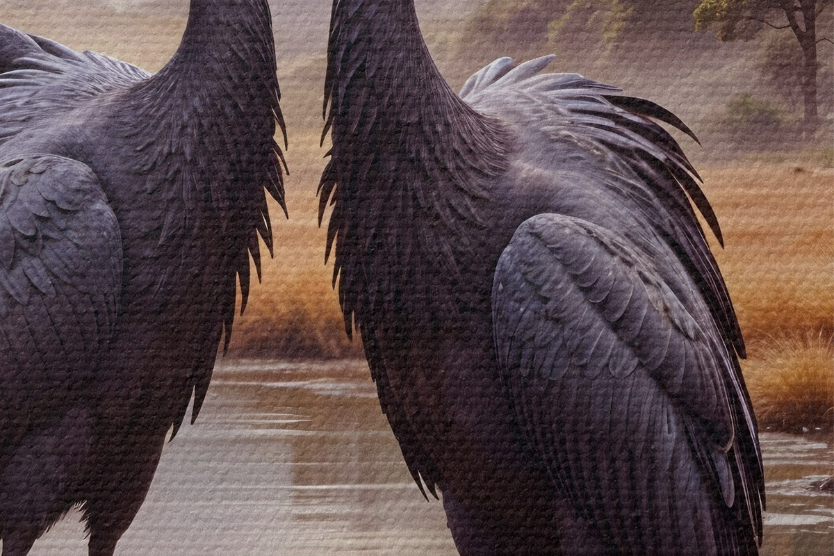 Nuotrauka Dvi didelės juodos gervės stovi negiliame tvenkinyje, fone - kalnuotas kraštovaizdis Nr r42240