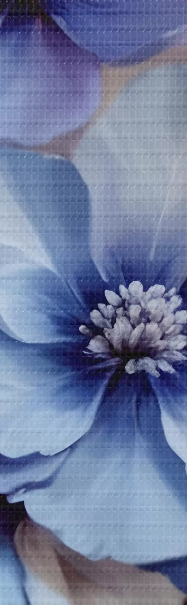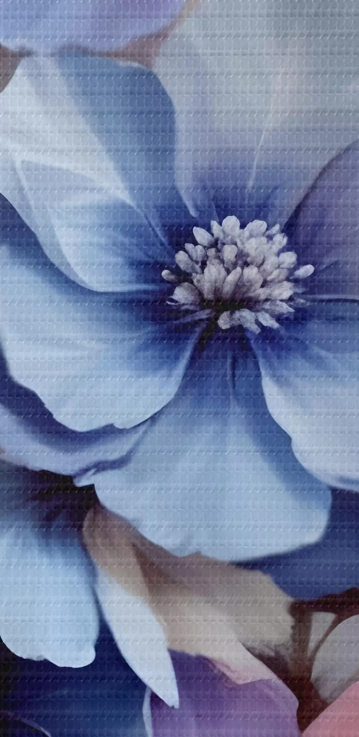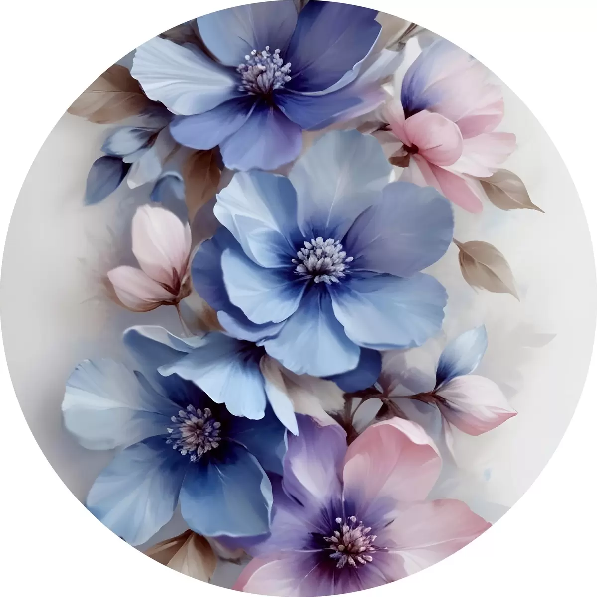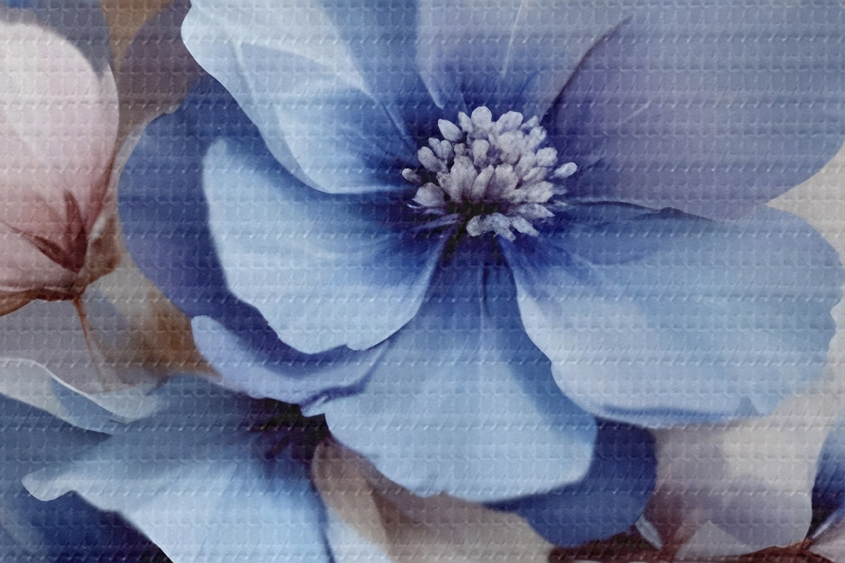 Nuotrauka Švelnios mėlynos ir rožinės spalvos gėlės su minkštais žiedlapiais ir centrais, išdėstytos gražiu gėlių raštu šviesiame fone Nr r42241