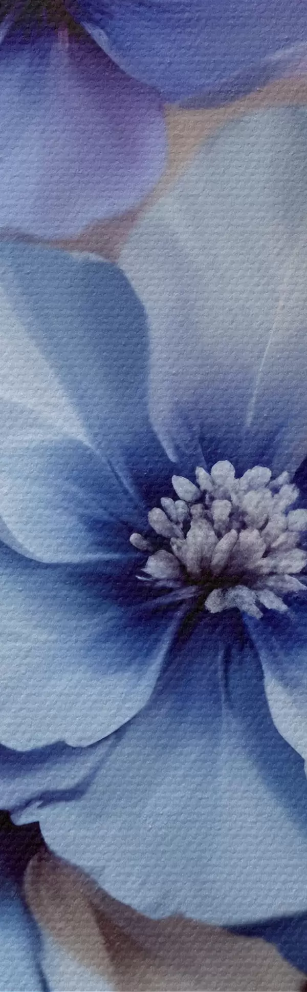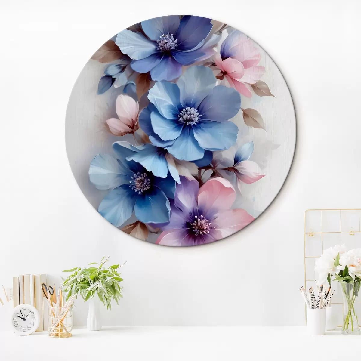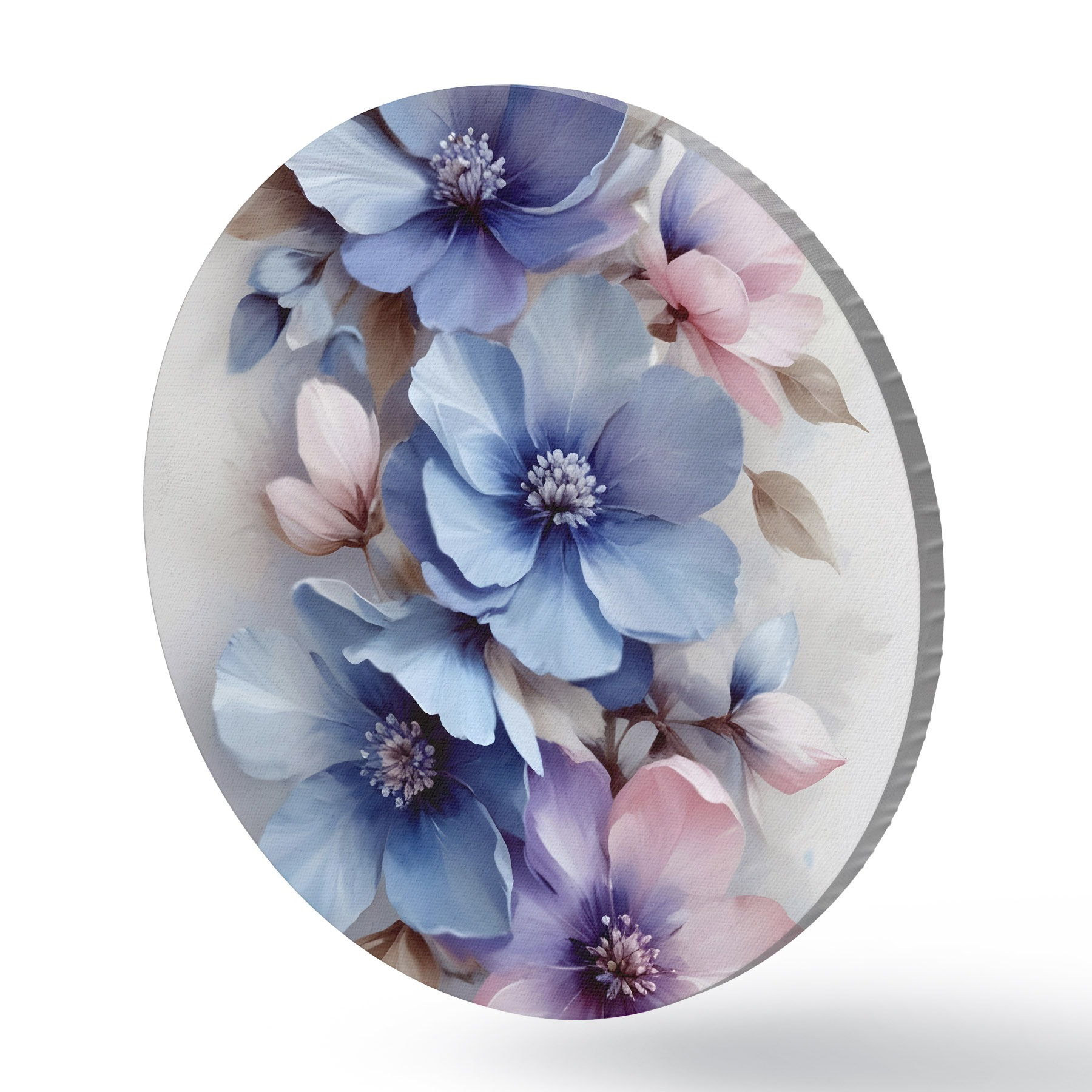Nuotrauka Švelnios mėlynos ir rožinės spalvos gėlės su minkštais žiedlapiais ir centrais, išdėstytos gražiu gėlių raštu šviesiame fone Nr r42241
