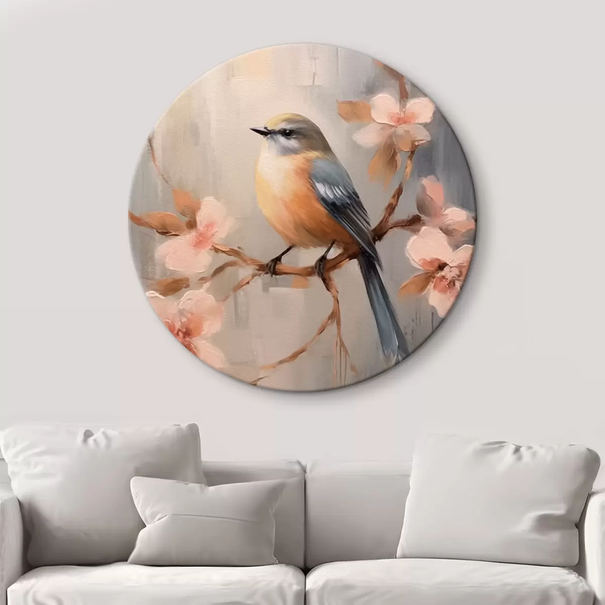 Nuotrauka Paukštis ant šakos ir rožinės gėlės Nr r42302