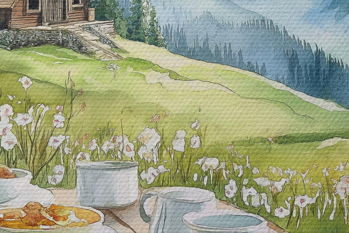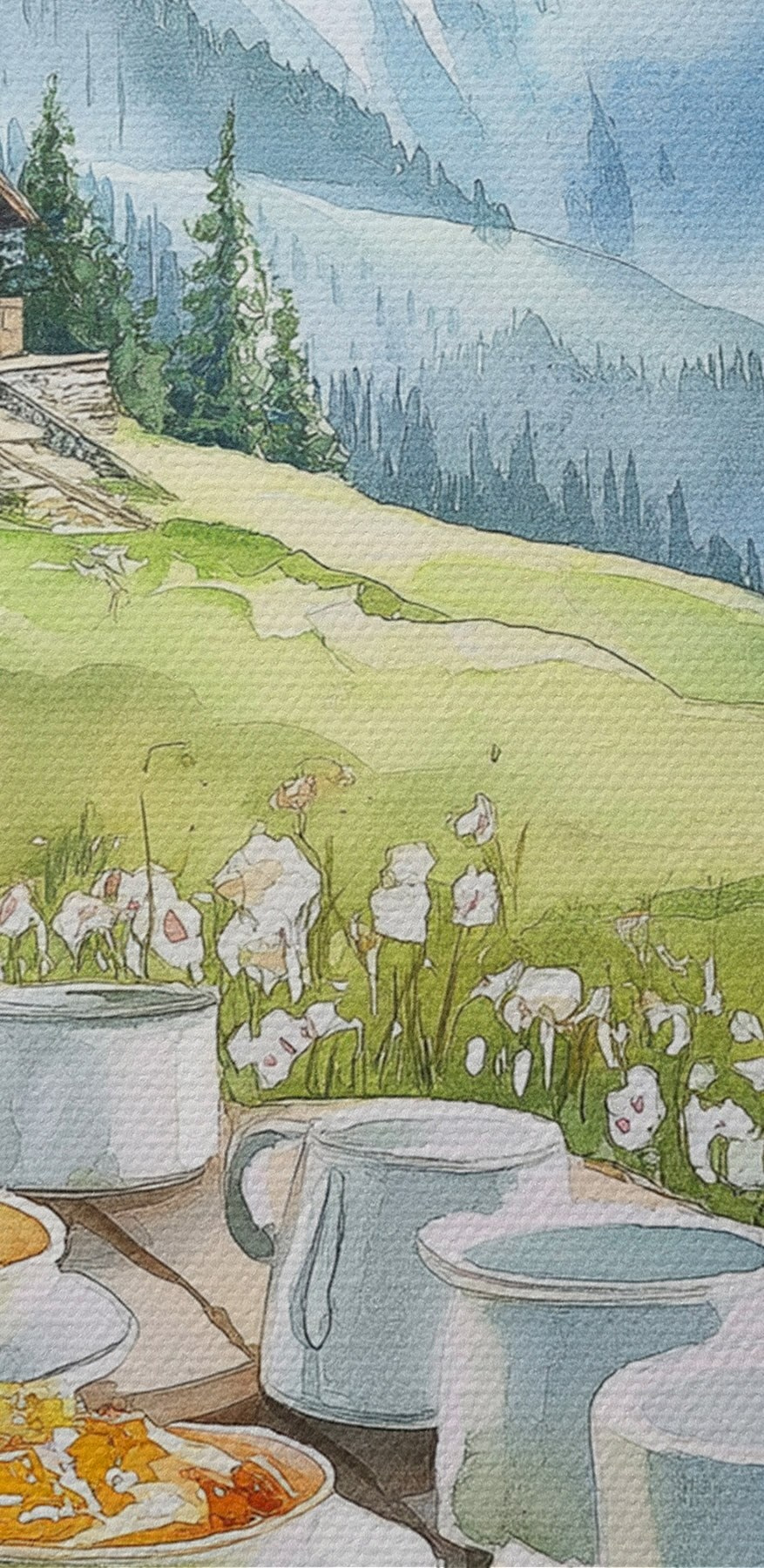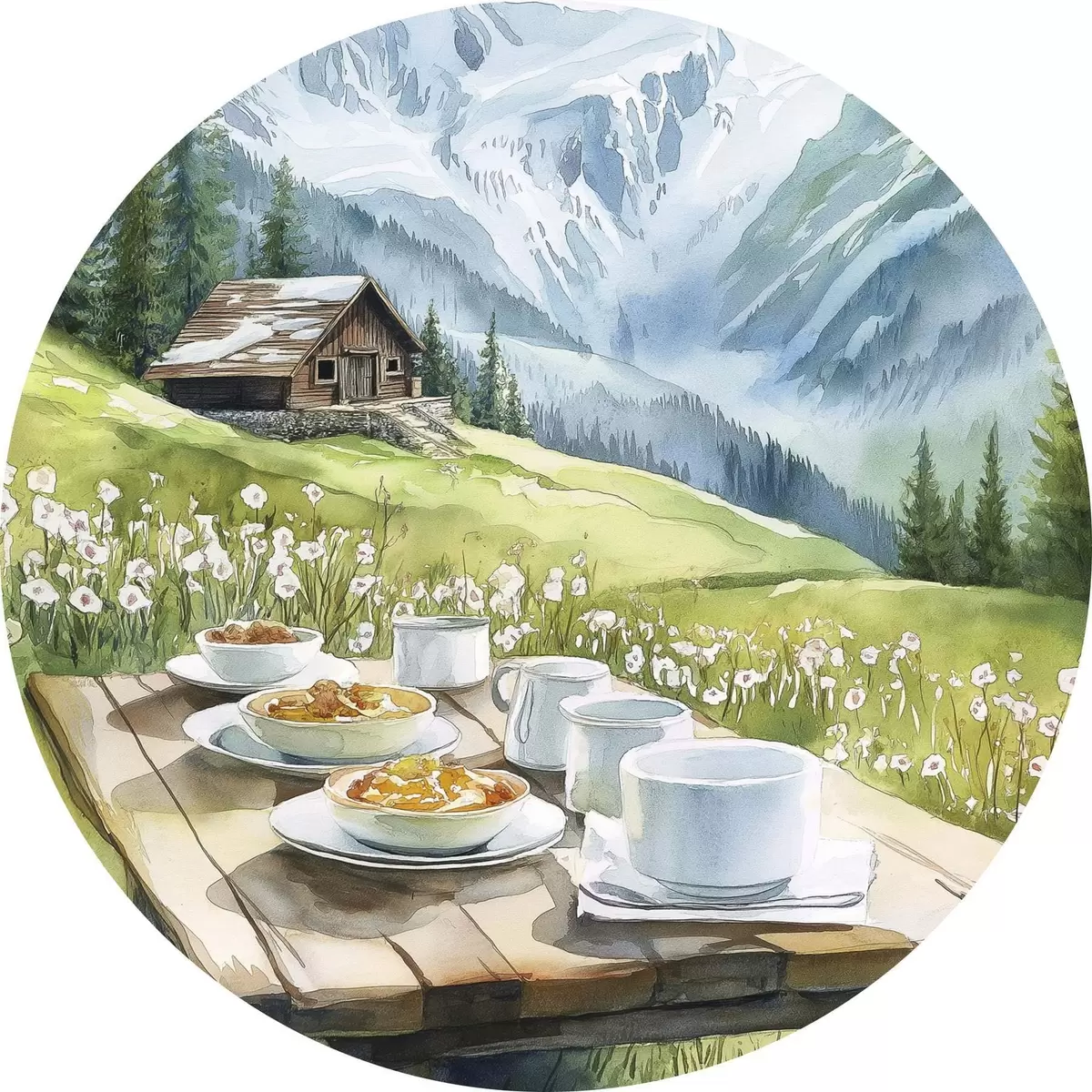 Nuotrauka Pusryčiai Alpėse, kalnai, miškas, gamta, vasara, akvarelės stilius Nr r42426