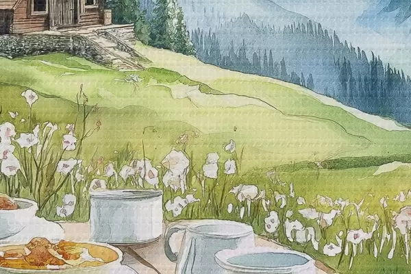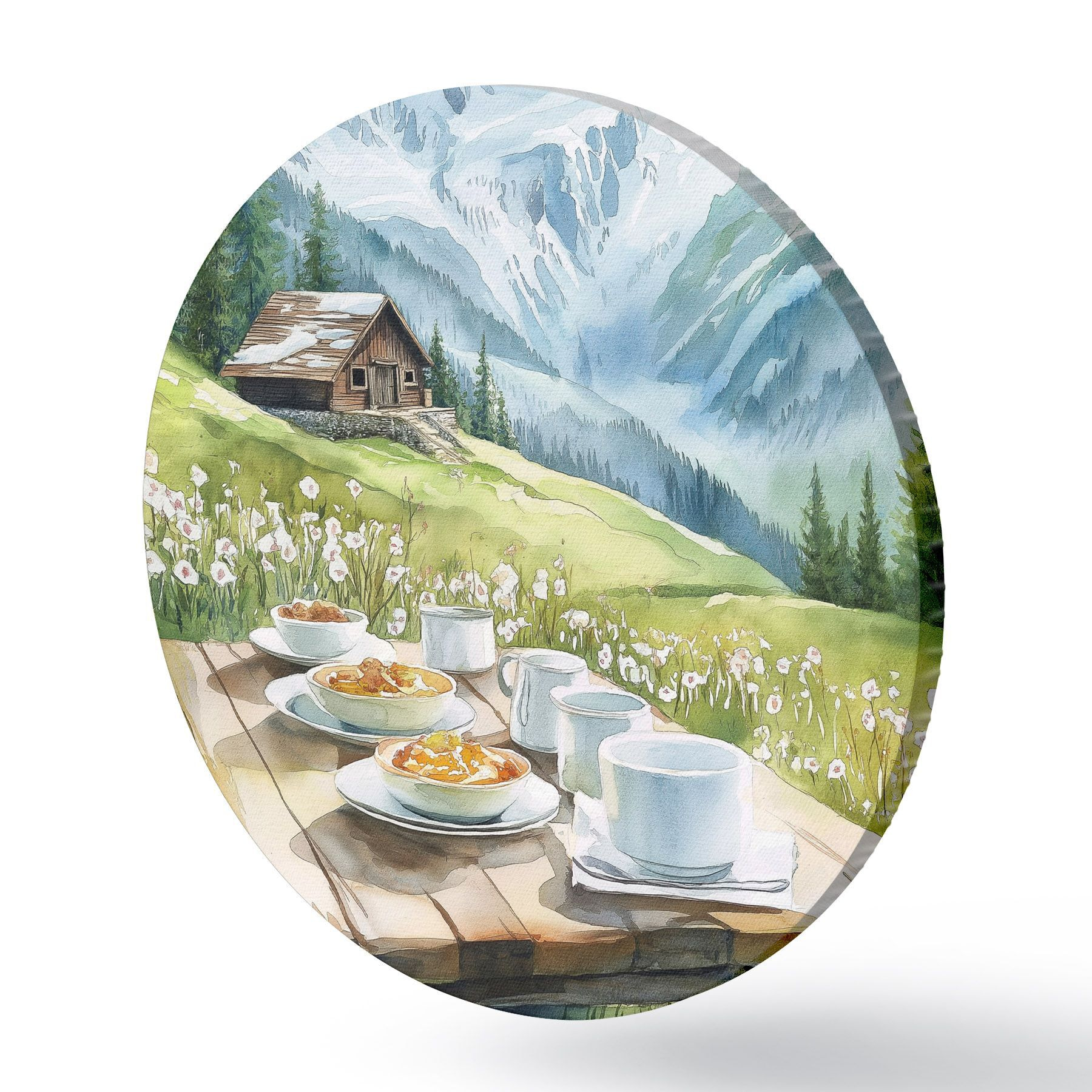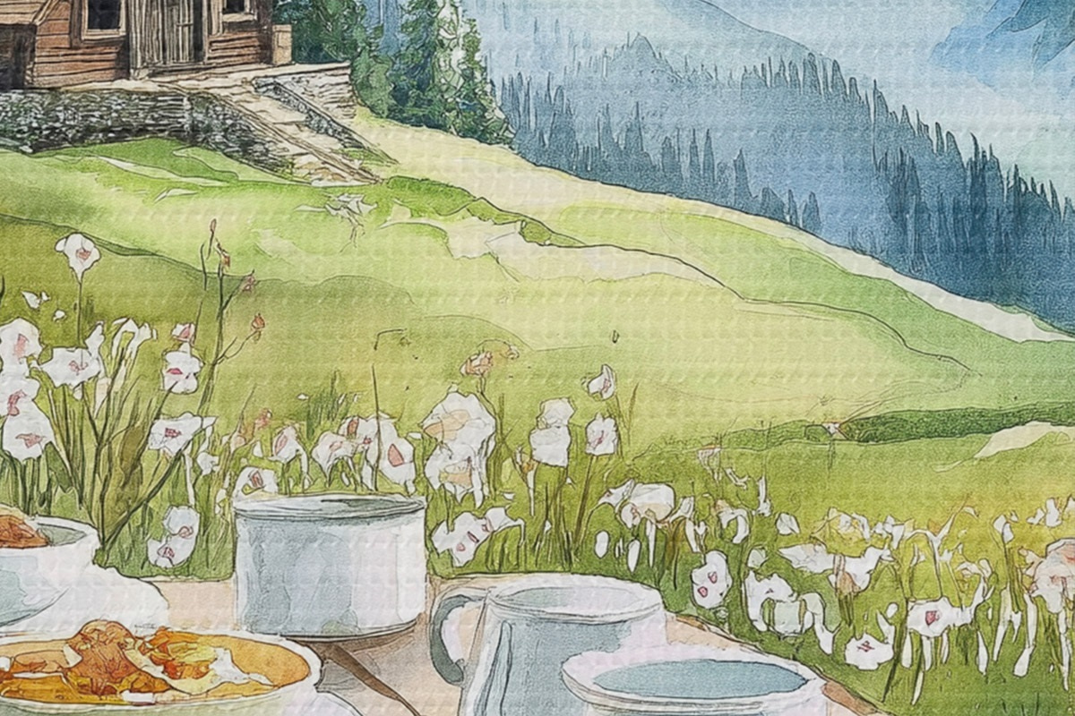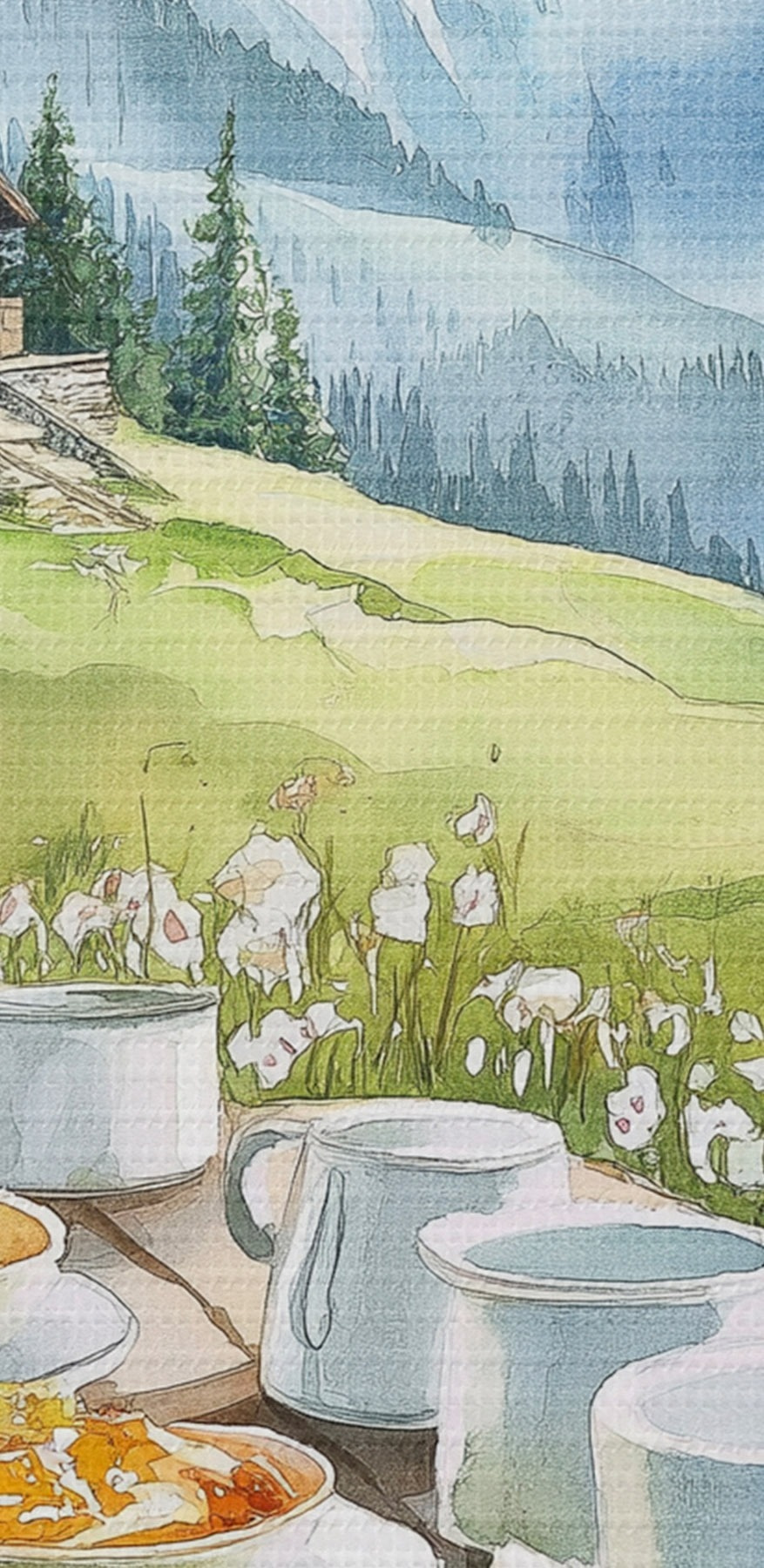 Nuotrauka Pusryčiai Alpėse, kalnai, miškas, gamta, vasara, akvarelės stilius Nr r42426
