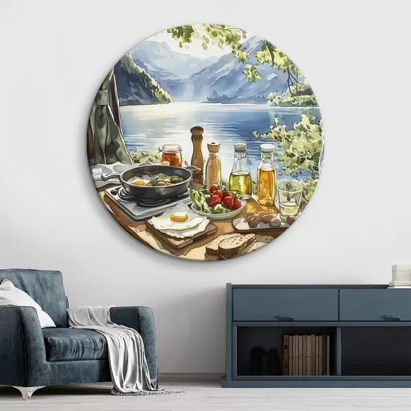 Nuotrauka Gražus vasaros rytas, ežeras, akvarelės stilius, pusryčiai, kelionės Nr r42433
