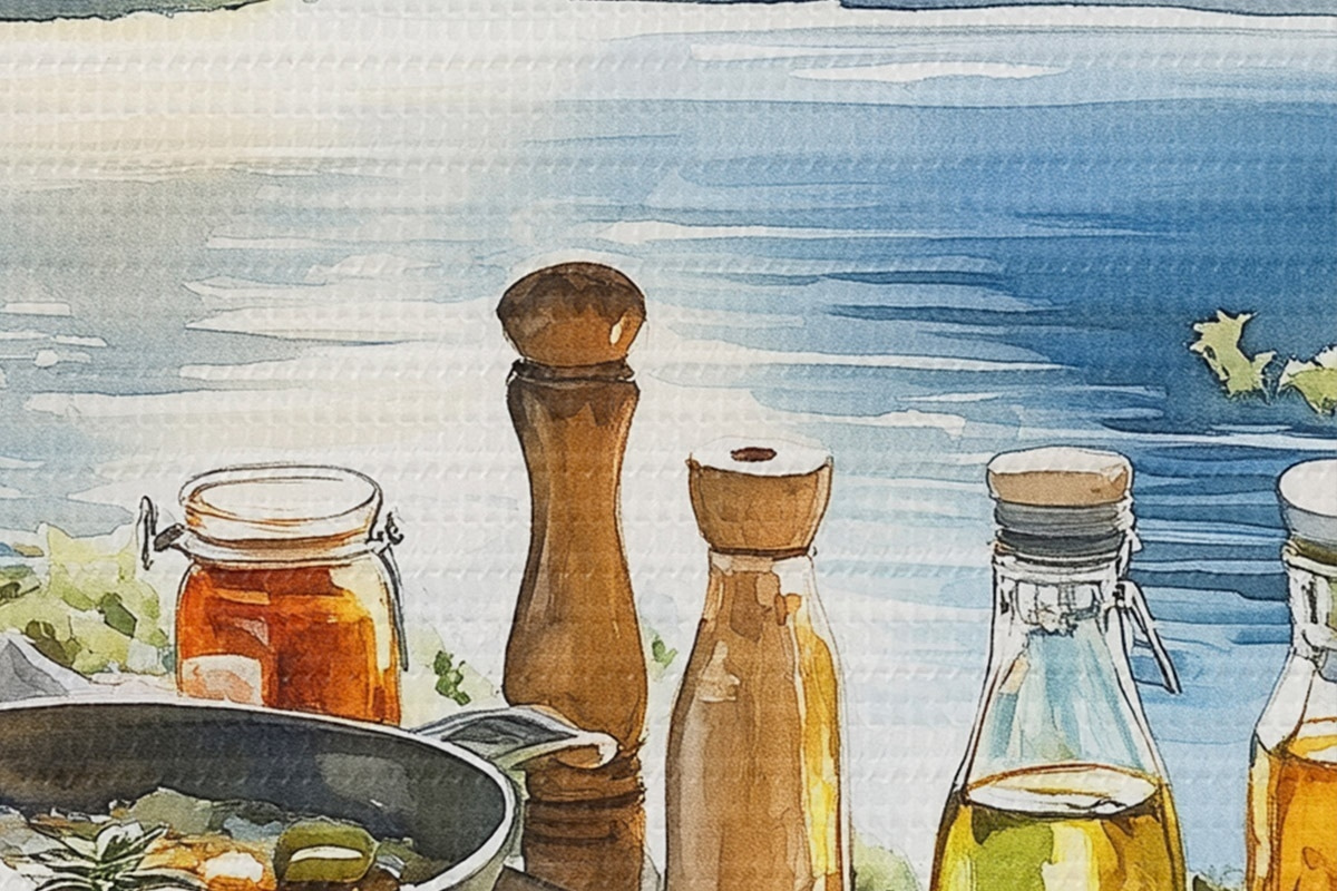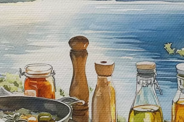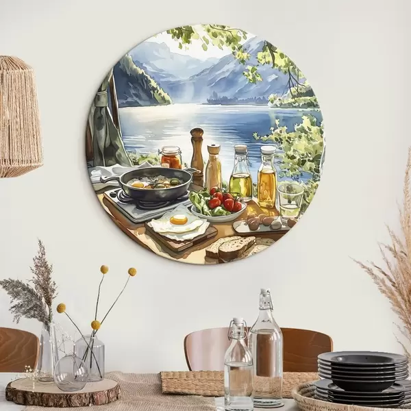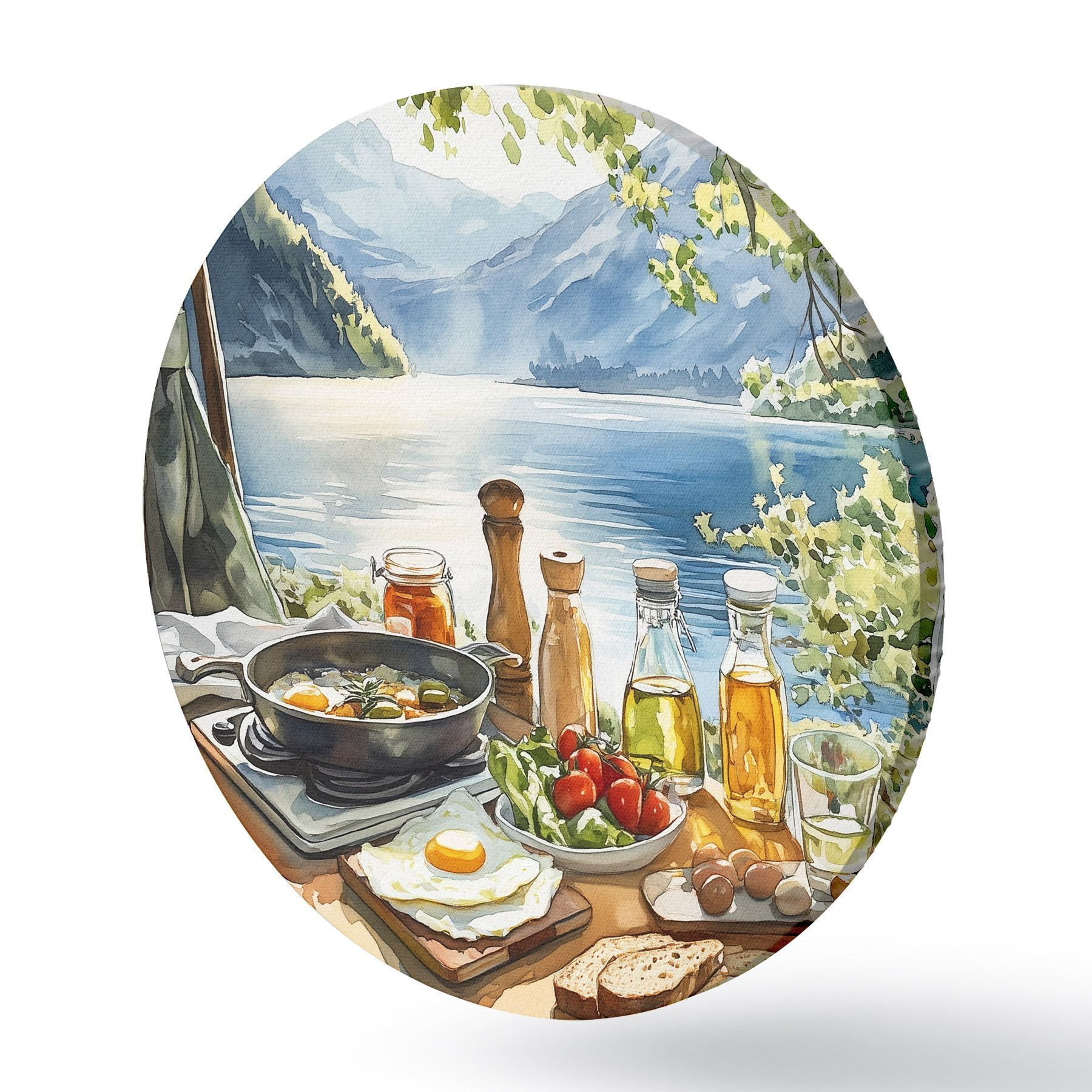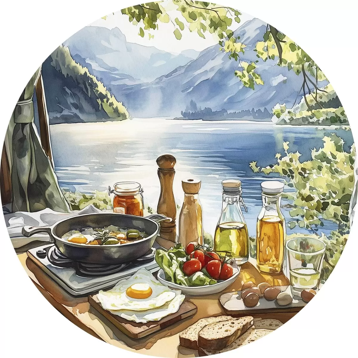 Nuotrauka Gražus vasaros rytas, ežeras, akvarelės stilius, pusryčiai, kelionės Nr r42433