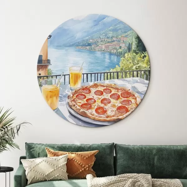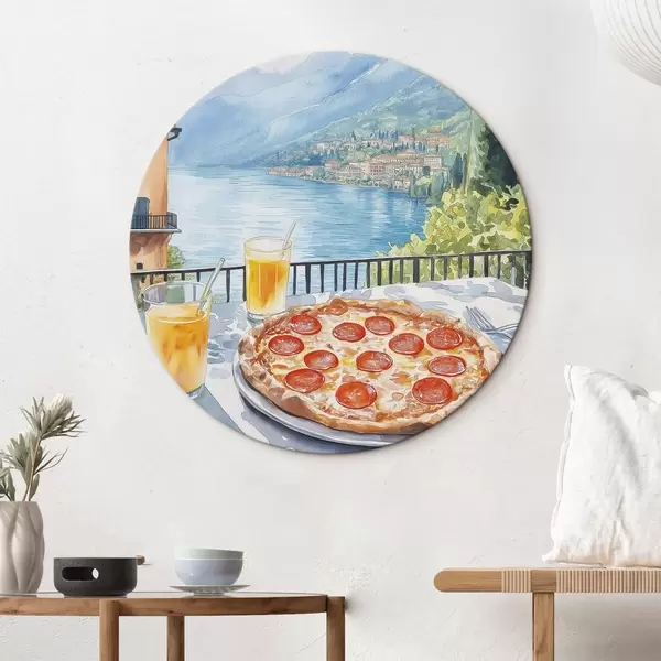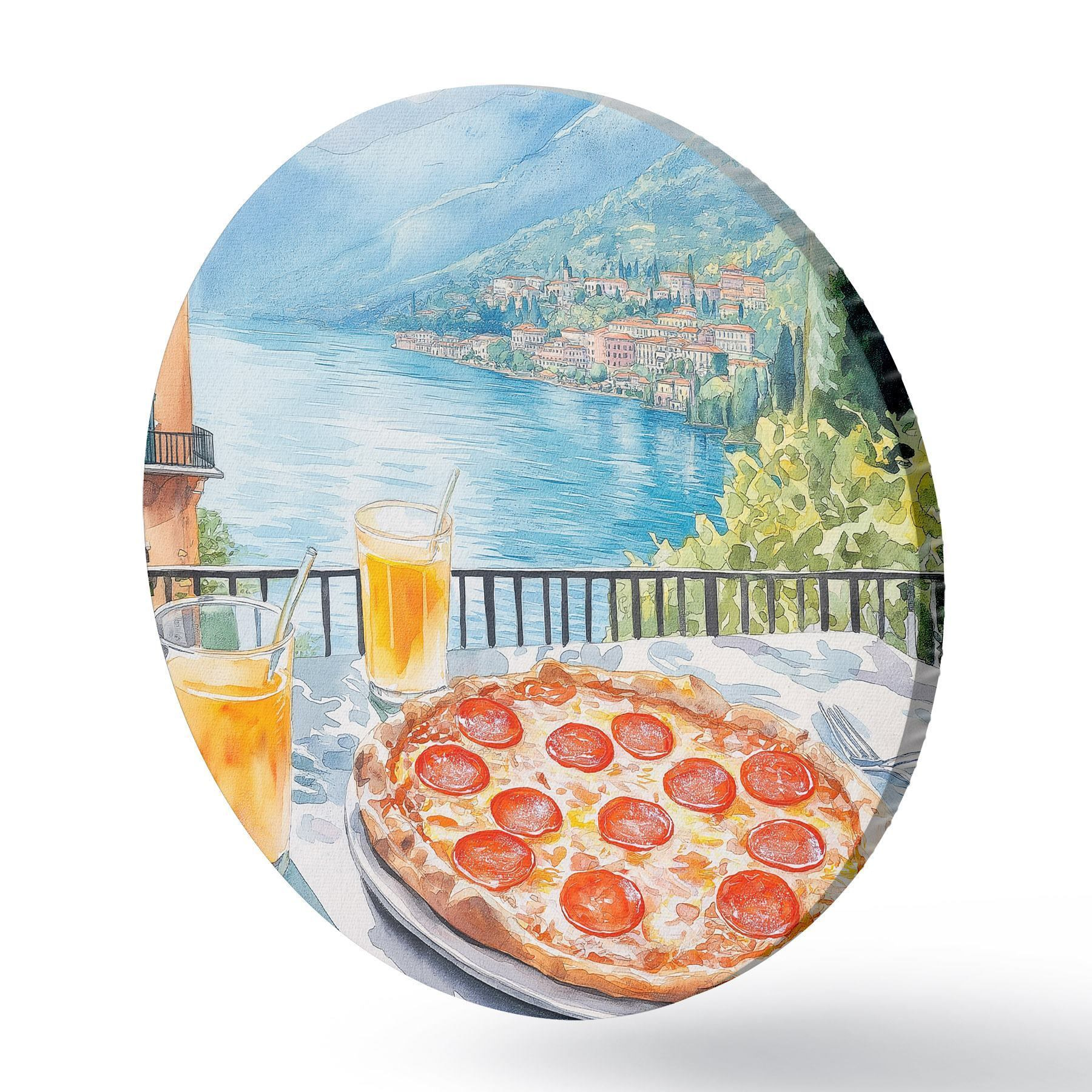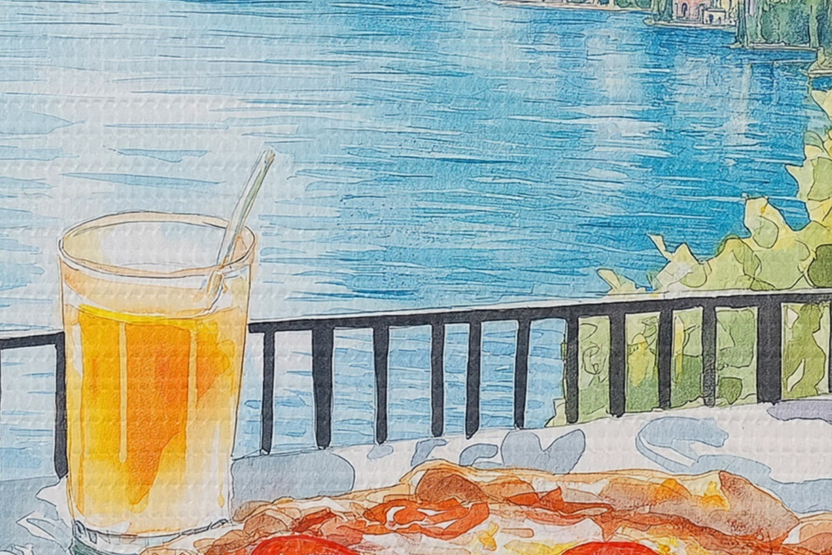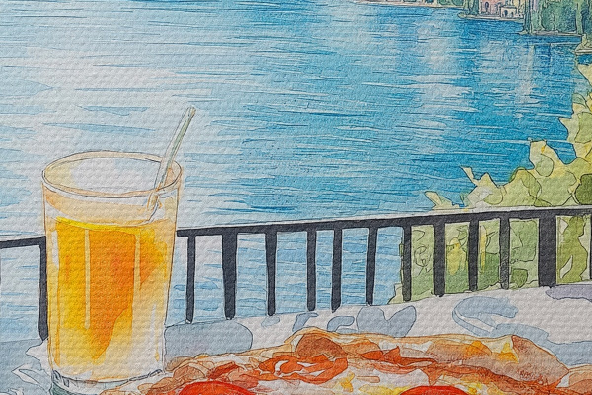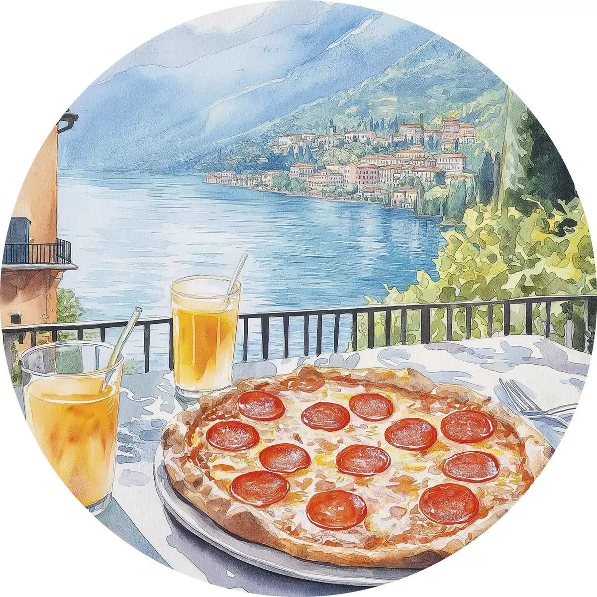 Nuotrauka Priešpiečiai Italijoje, akvarelės stilius, pica margarita, ežeras, vasaros gamta Nr r42436