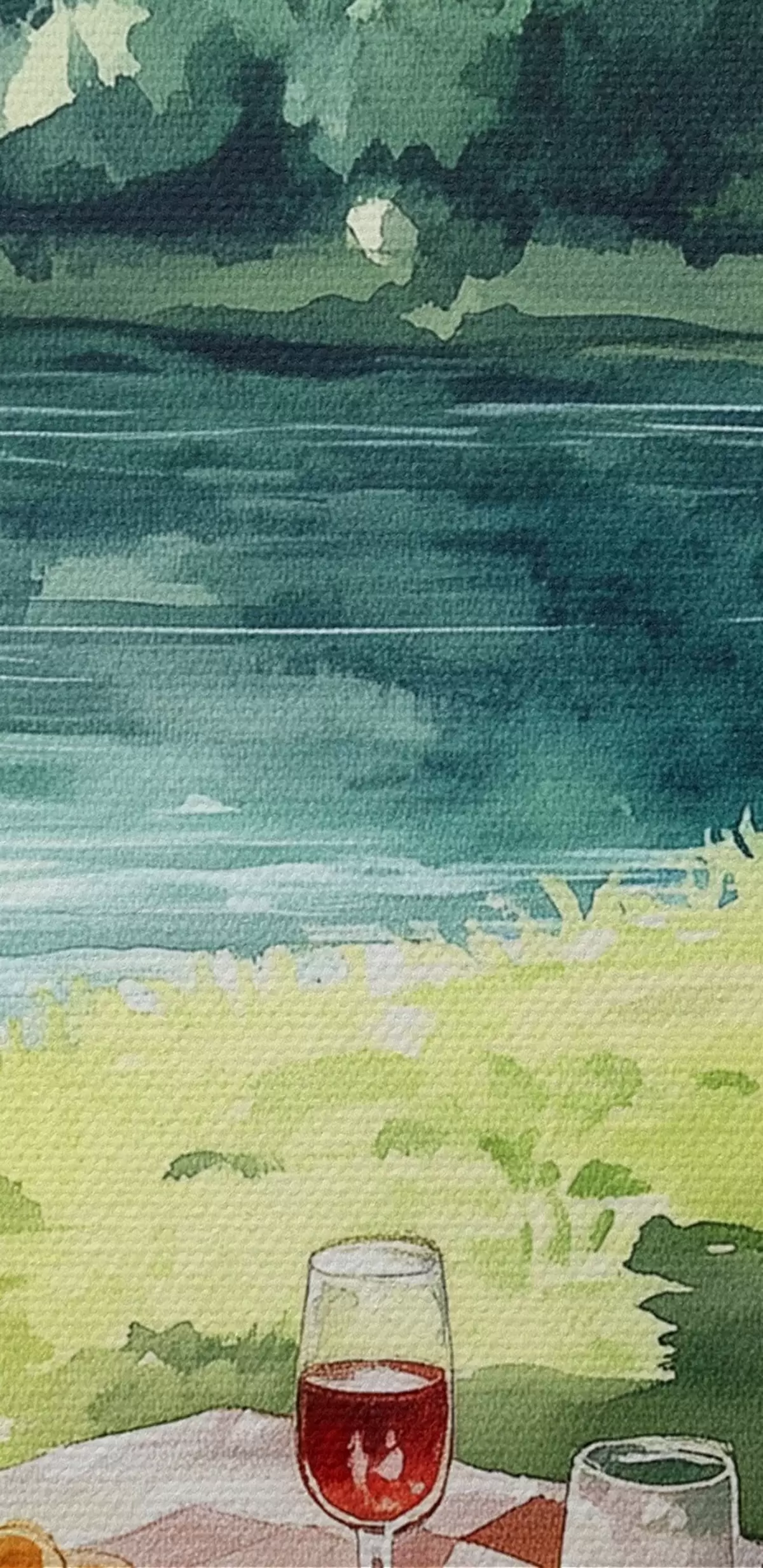 Nuotrauka Gražus romantiškas piknikas prie vasaros ežero, vaisiai, žaluma Nr r42451
