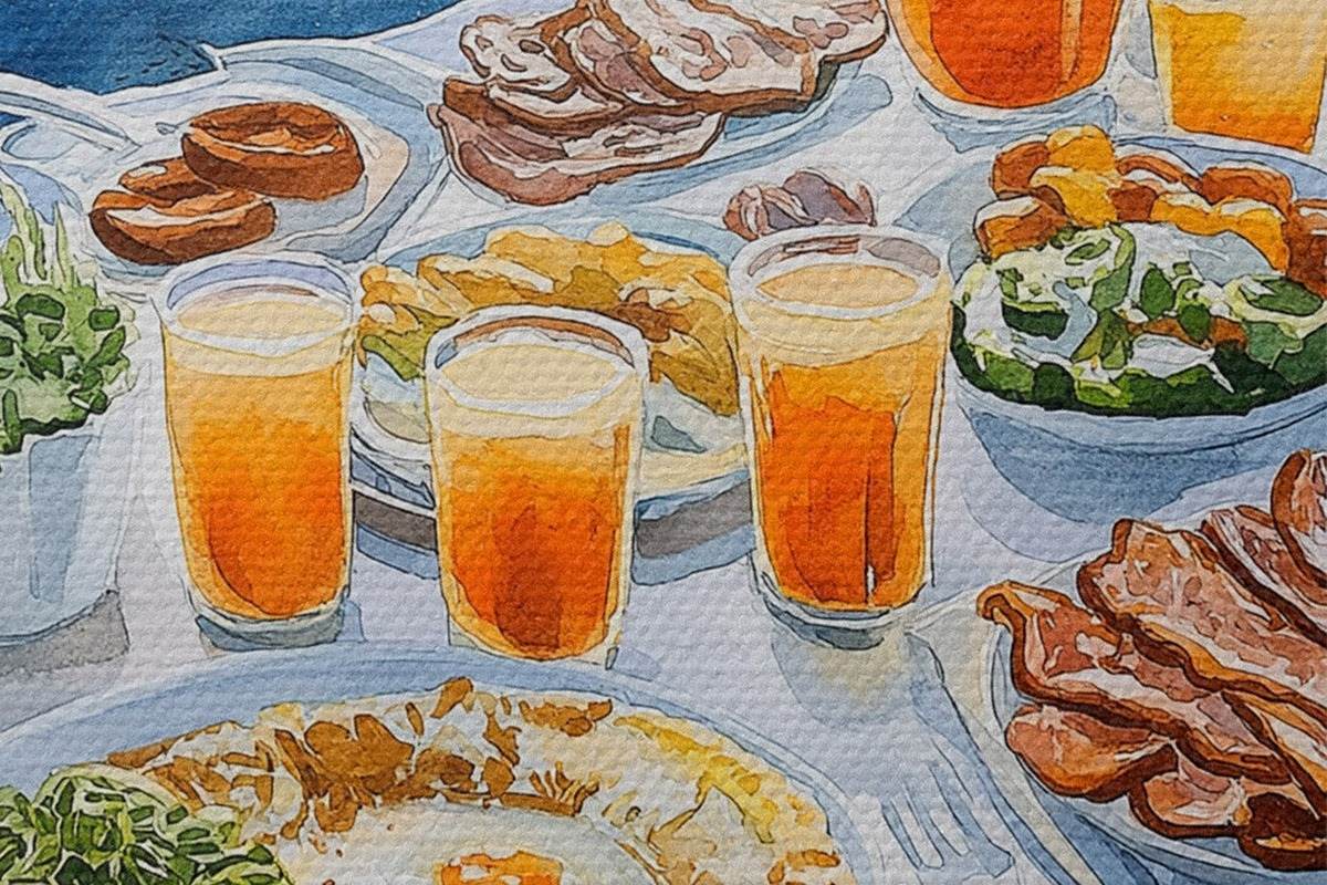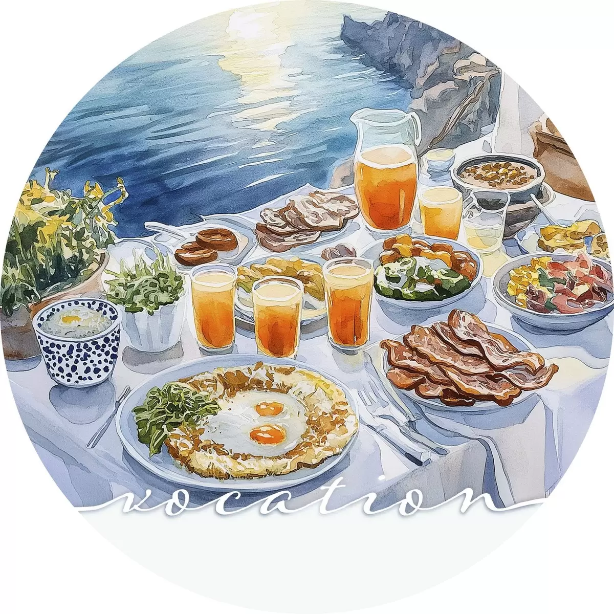 Nuotrauka Romantiškas poilsis Graikijoje, akvarelės stilius, pusryčiai, saulėtekis Nr r42453