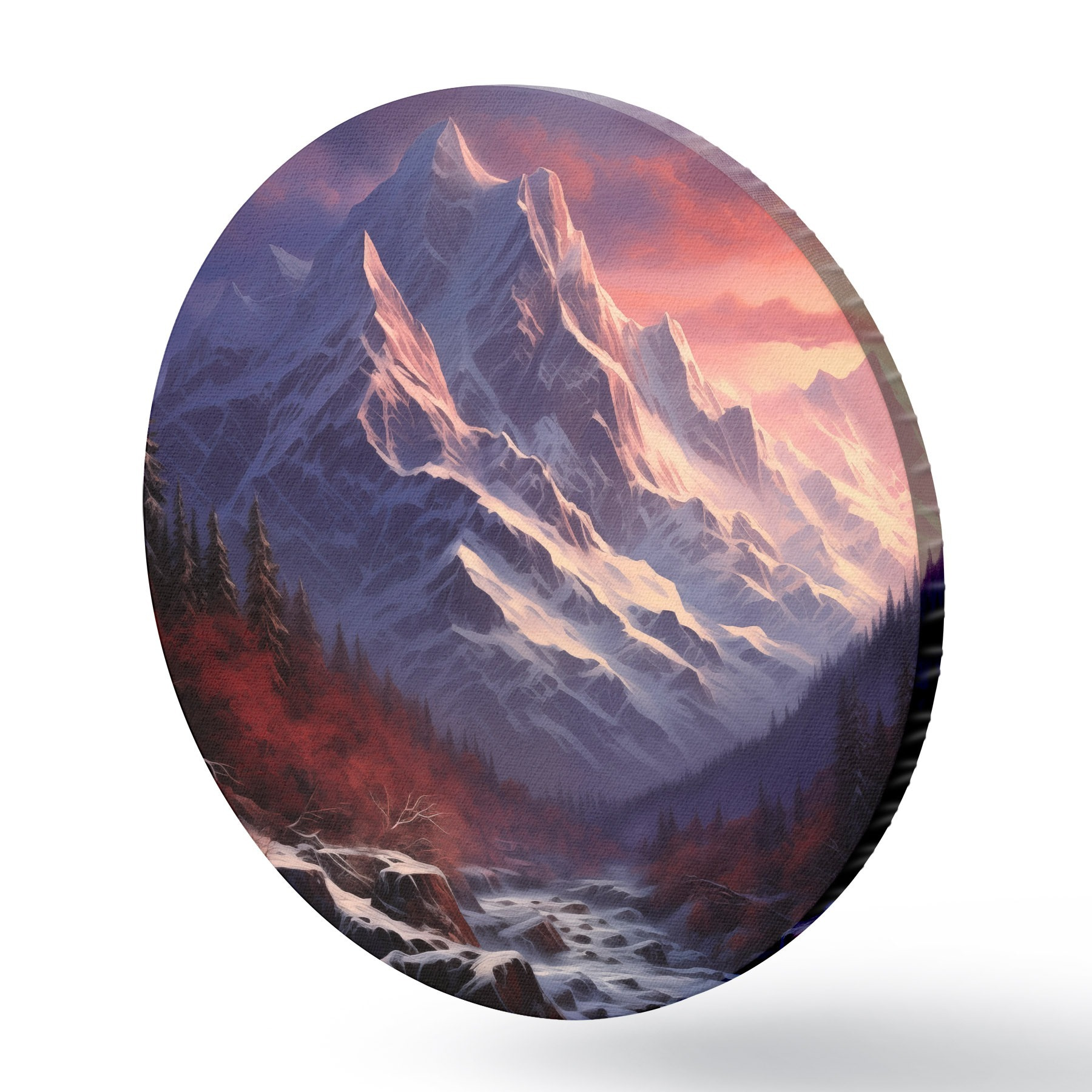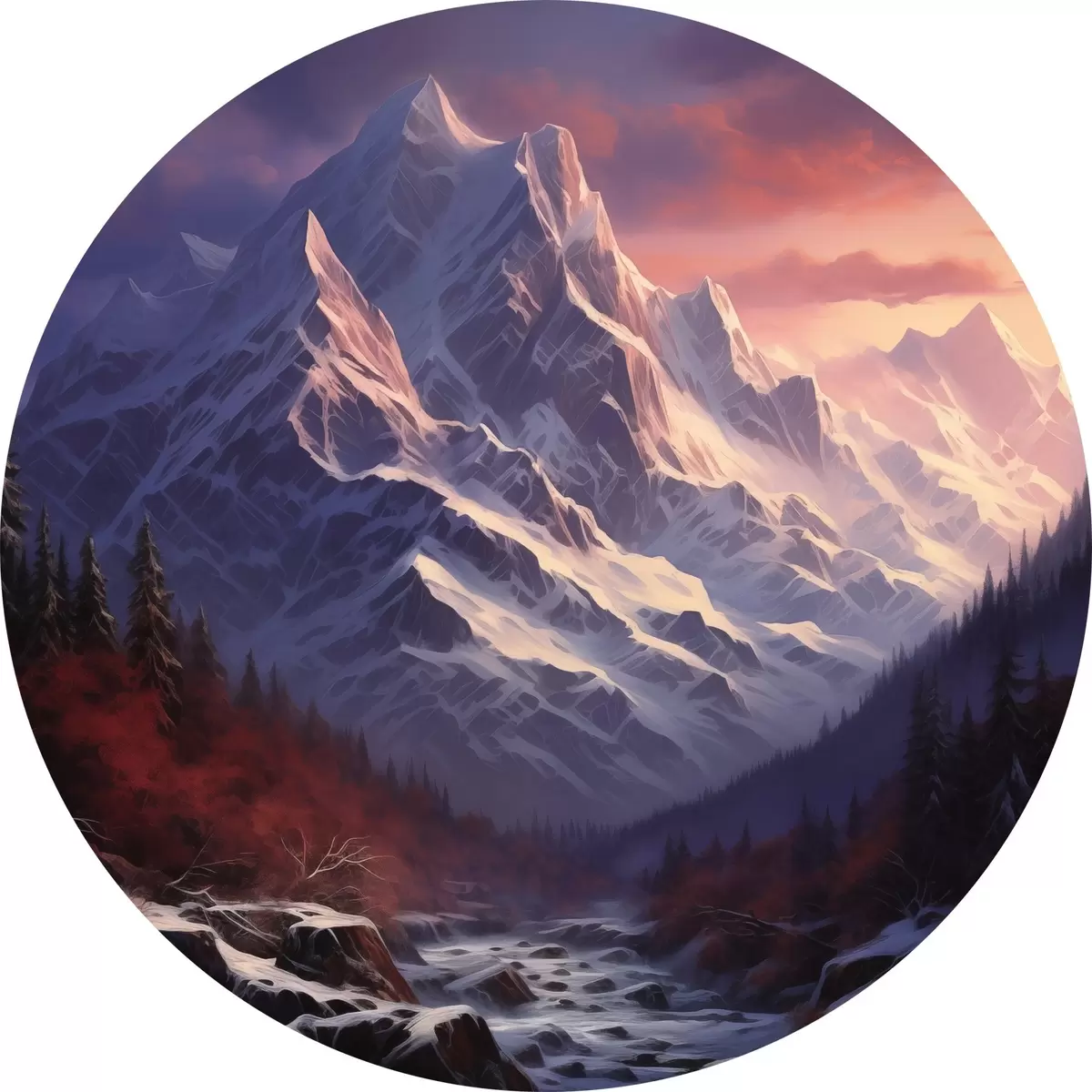 Nuotrauka Įspūdingas kalnų kraštovaizdis saulėlydžio metu su snieguotomis viršūnėmis, tamsiais pušynais ir švelniais rausvai violetiniais atspalviais danguje. Nr r42566