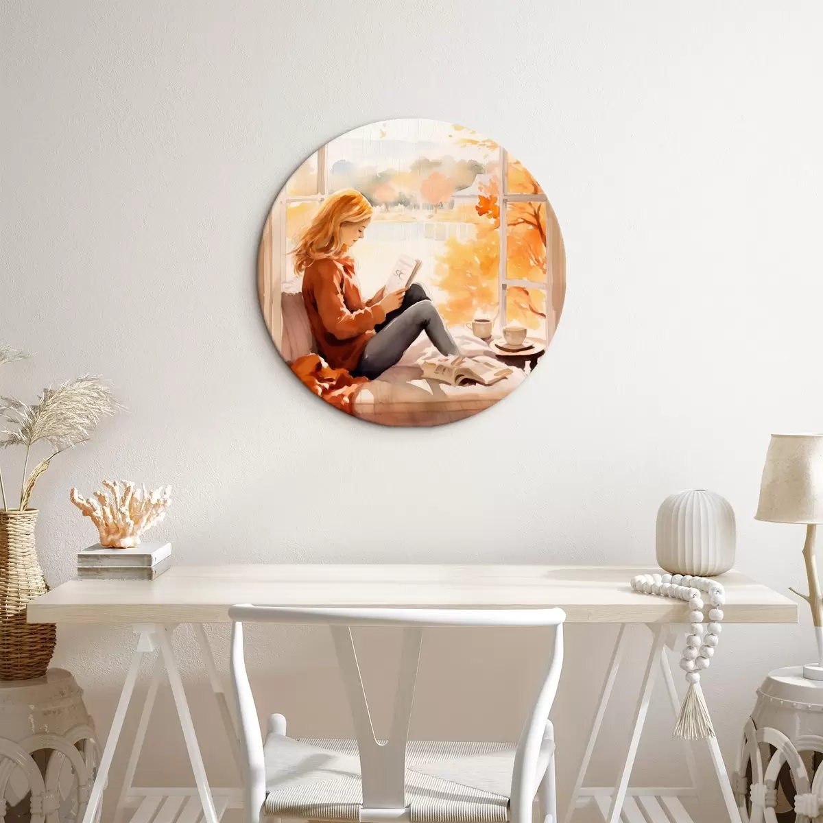 Nuotrauka Mergina, skaitanti knygą prie atviro lango rudens aplinkoje, su ryškiais medžiais fone ir puodeliu arbatos šalia. Nr r42572