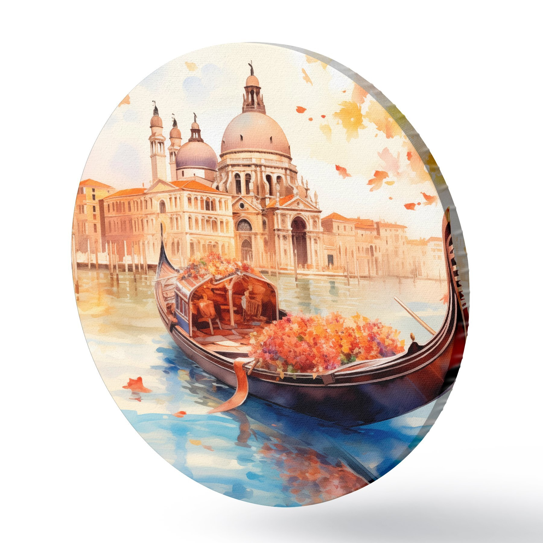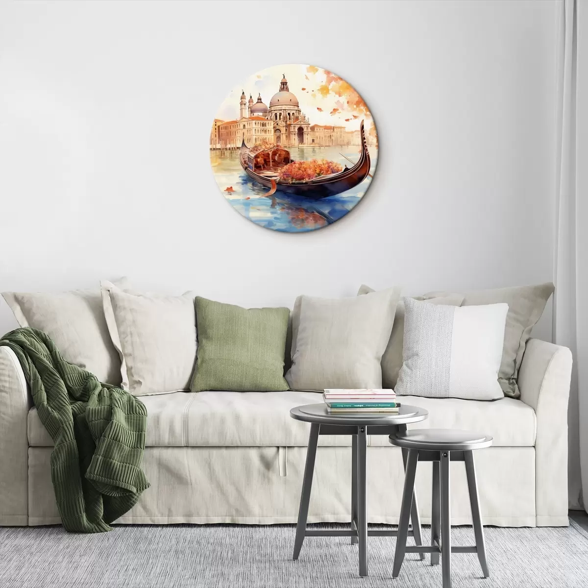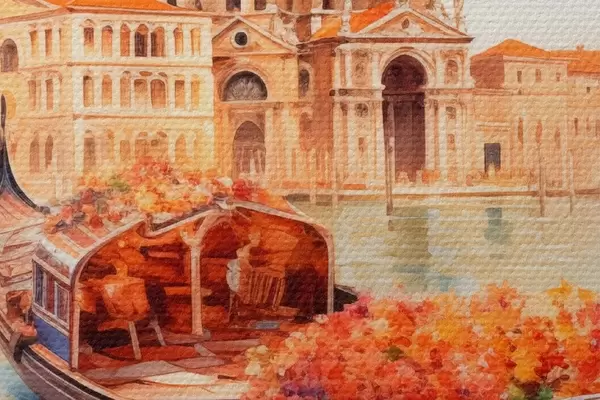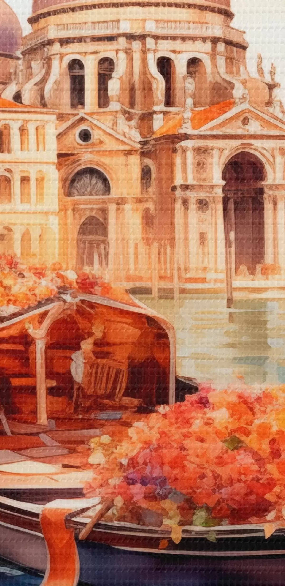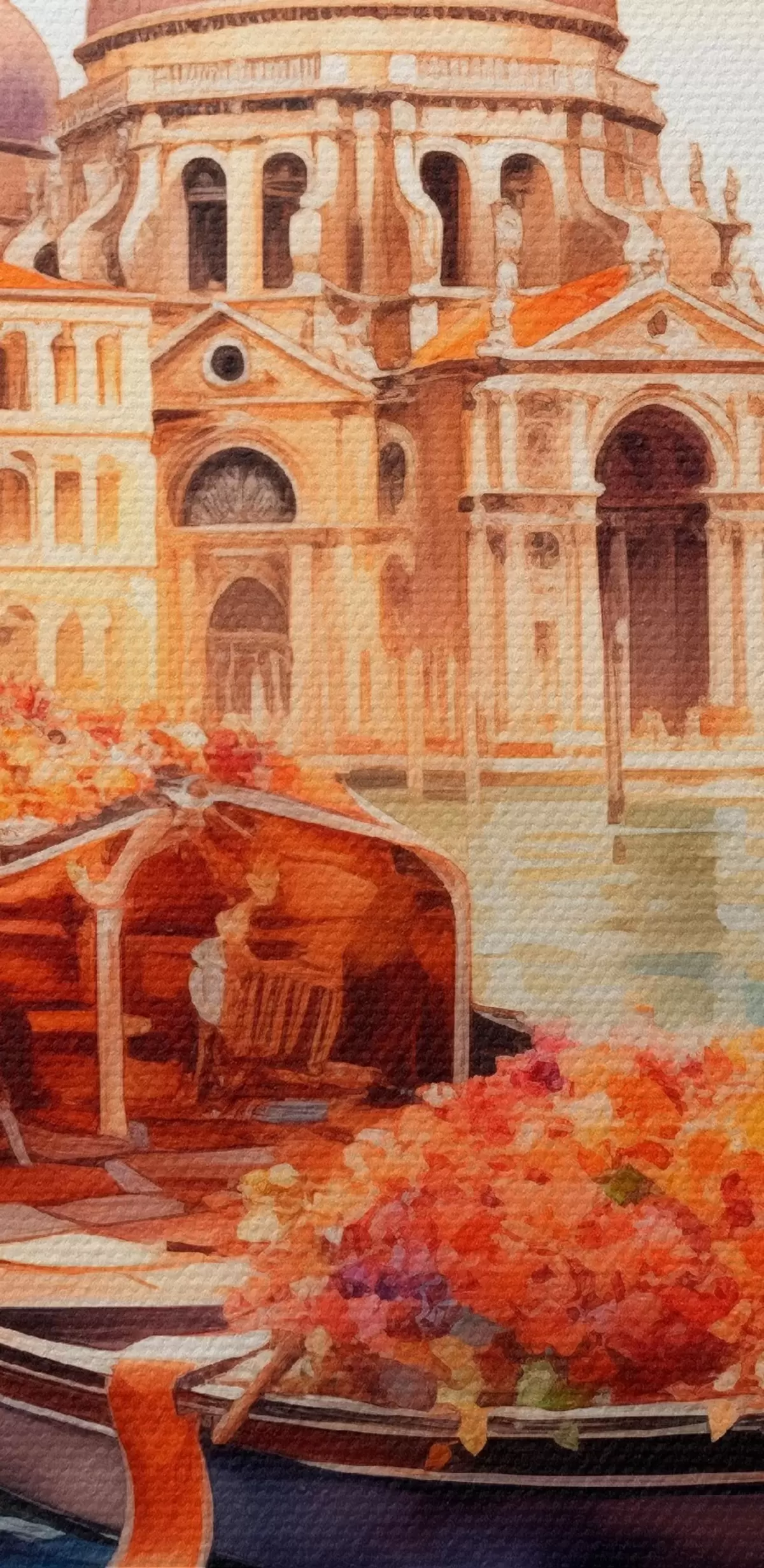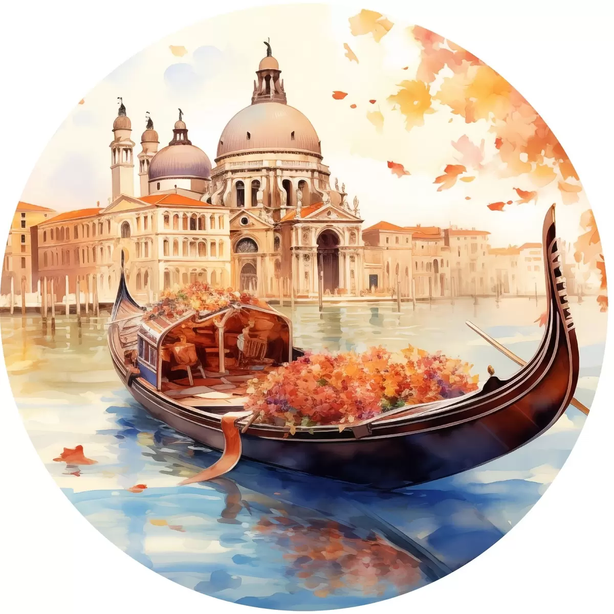 Nuotrauka Rudeninis Venecijos vaizdas su gondola, apsupta ryškiai oranžinių ir raudonų lapų, su pastatų atspindžiais ramiame kanalo vandenyje. Nr r42576