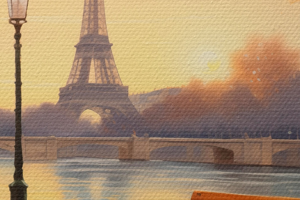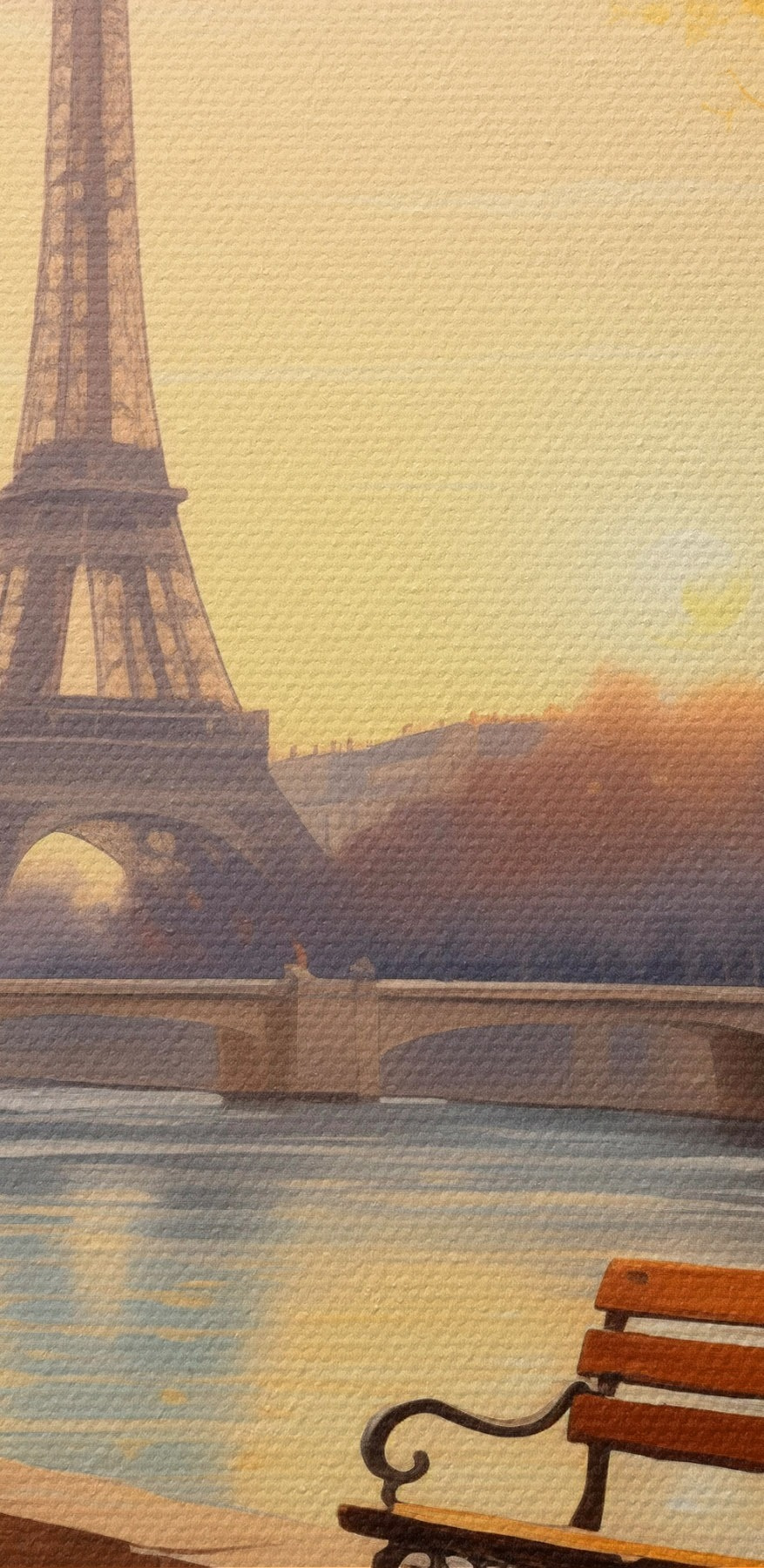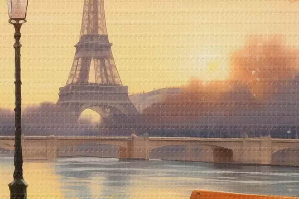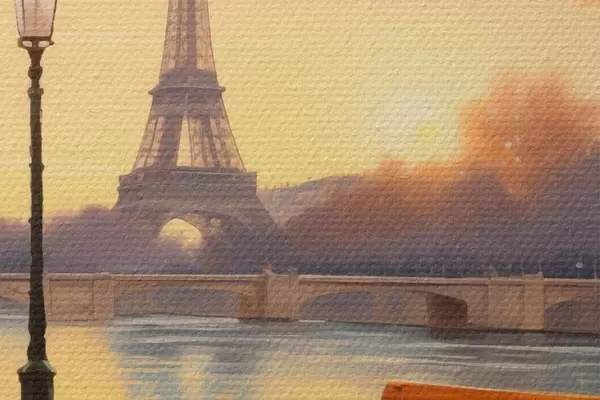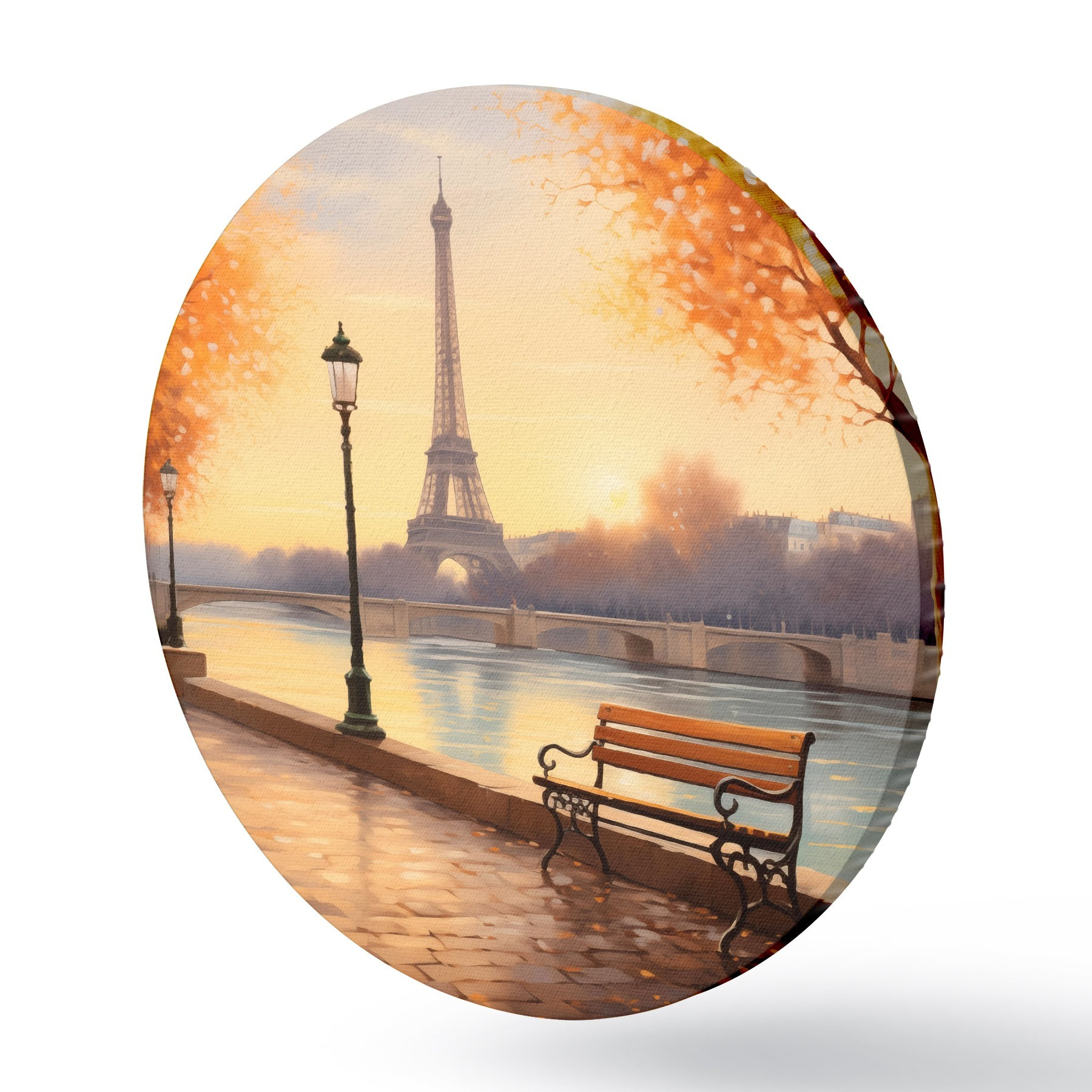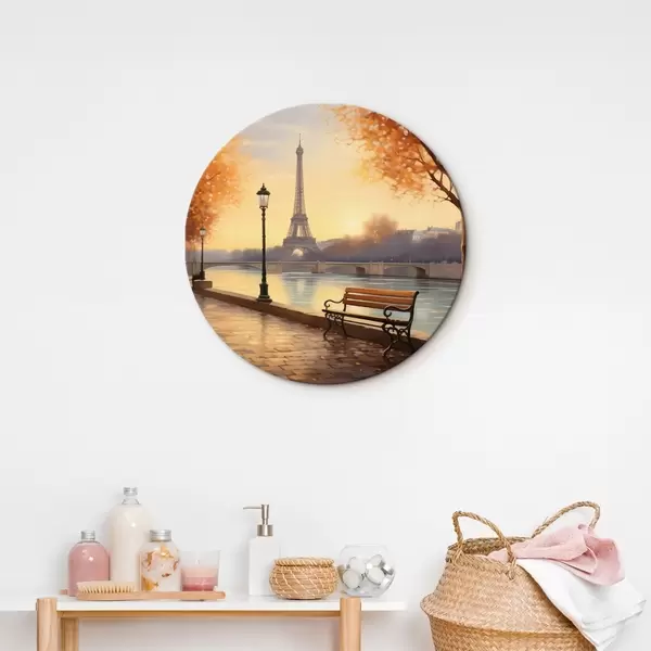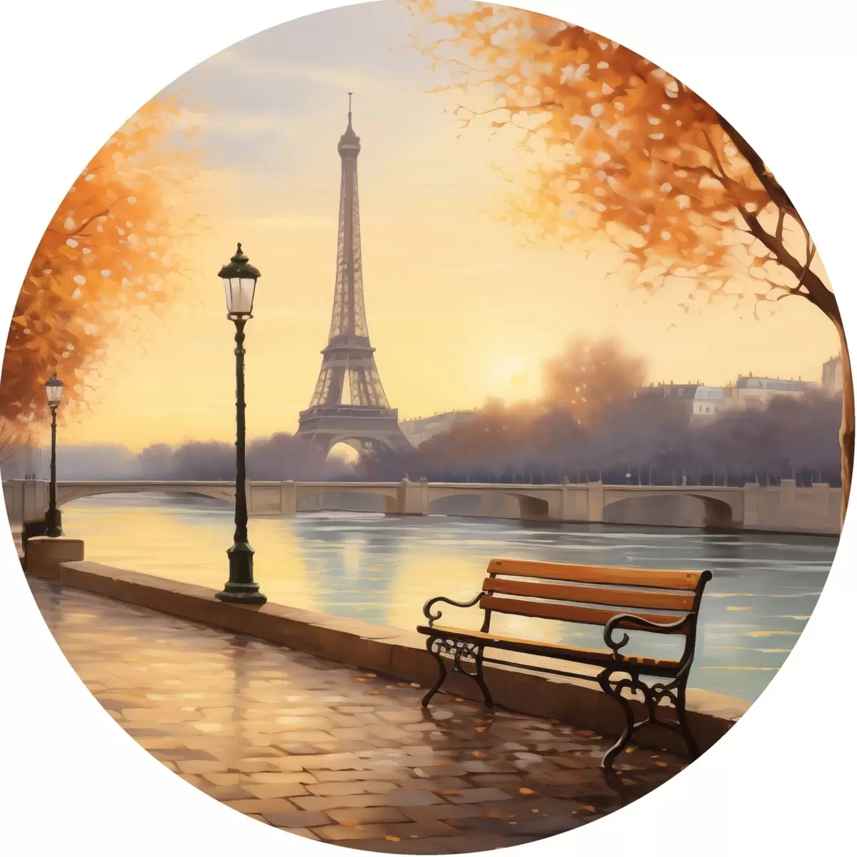 Nuotrauka Ruduo Paryžiuje su vaizdu į Eifelio bokštą, auksiniais lapais nusėtą Senos krantinę, suoliukus ir gatvių žibintus, kurie sukuria romantišką atmosferą. Nr r42577