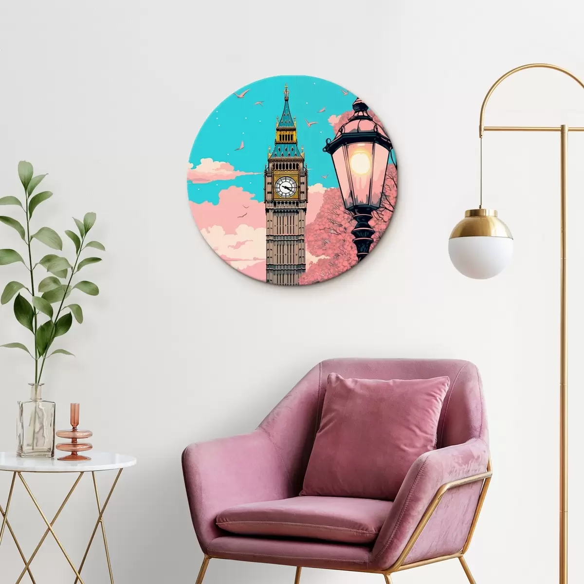 Nuotrauka Big Beno vaizdas su pavasariškai rausvais medžiais, ryškiai mėlynu dangumi ir senoviniu gatvės žibintu pirmame plane Nr r42578