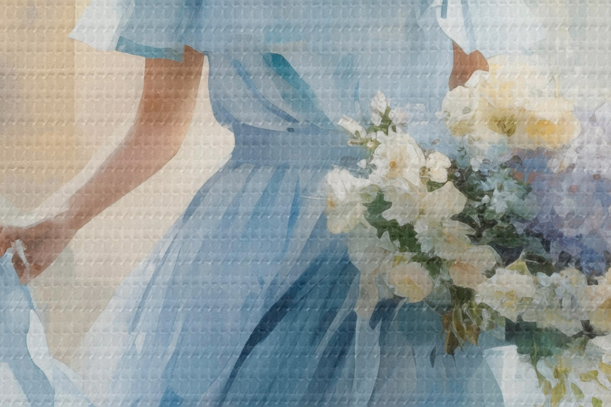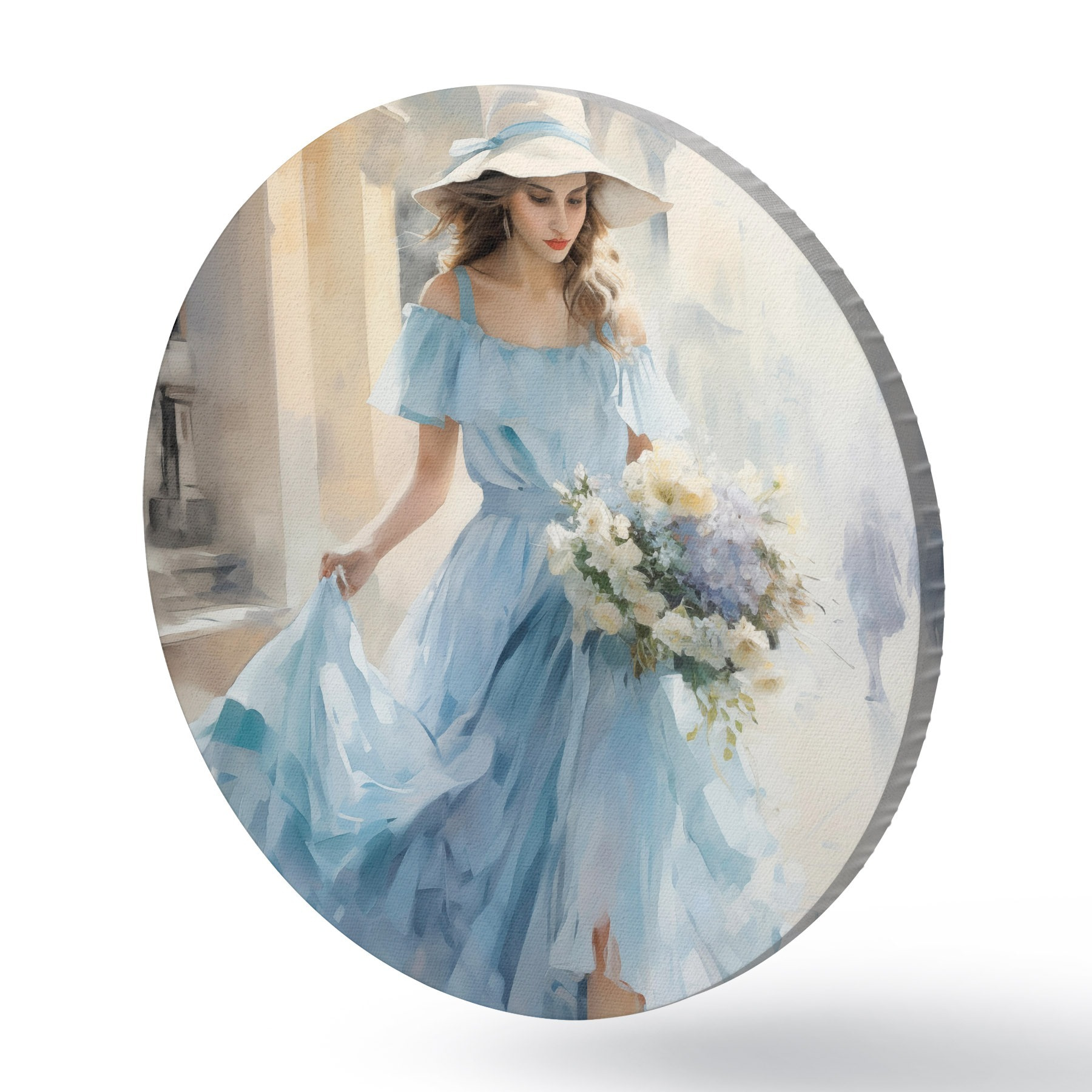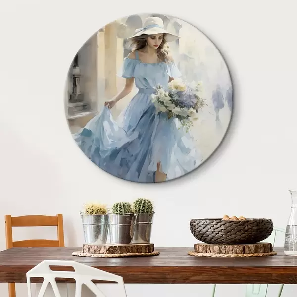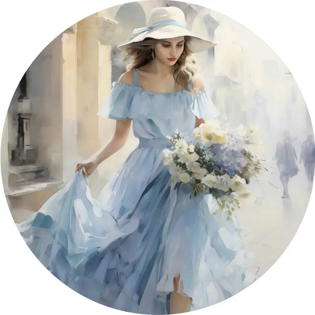 Nuotrauka Elegantiška mergina su šviesiai mėlyna suknele ir skrybėlaite vaikšto po miestą, laikydama gėlių puokštę, lengva ir romantiška nuotaika. Nr r42580