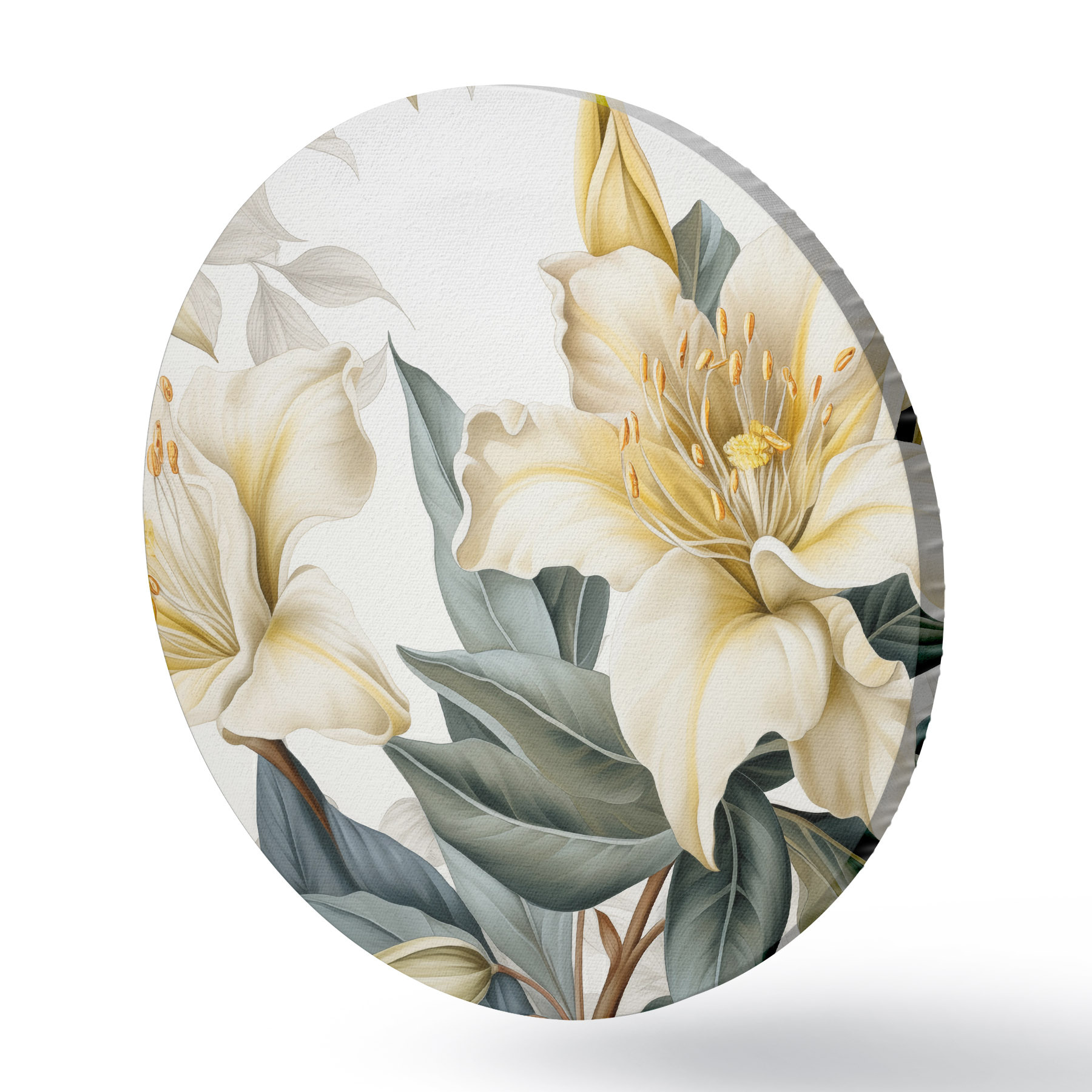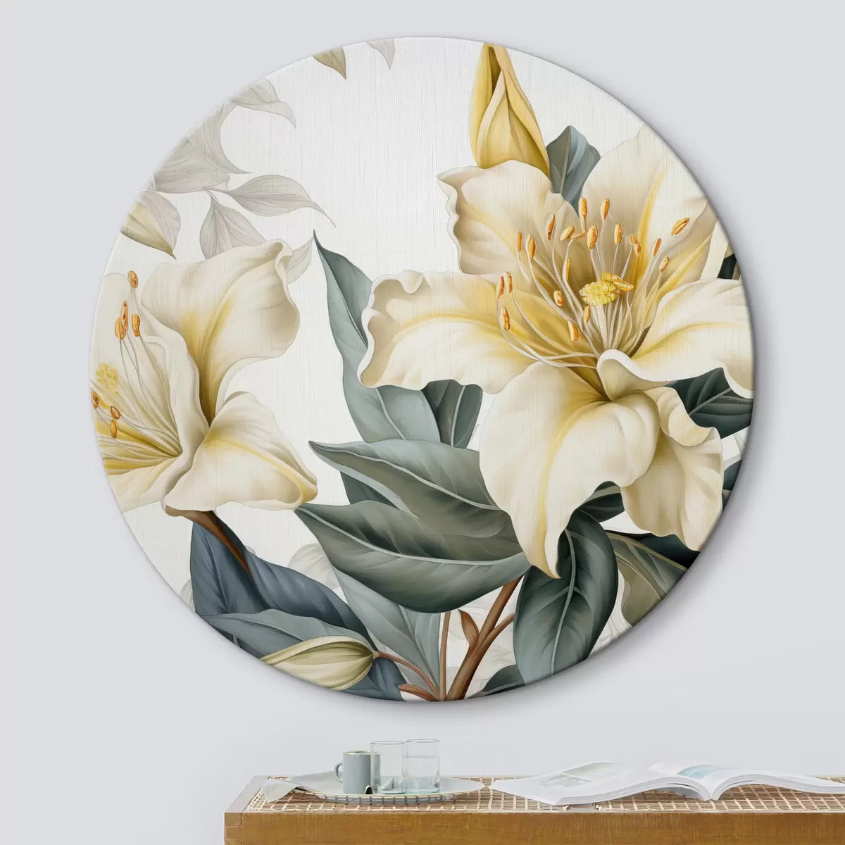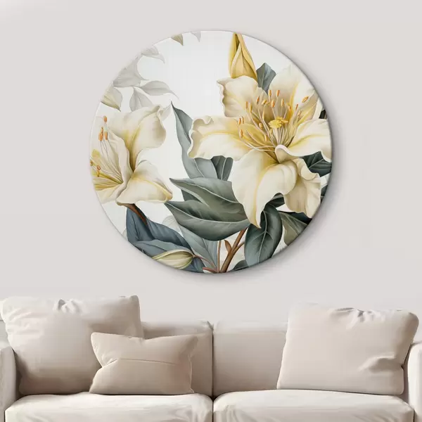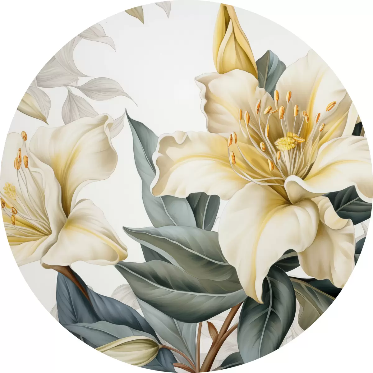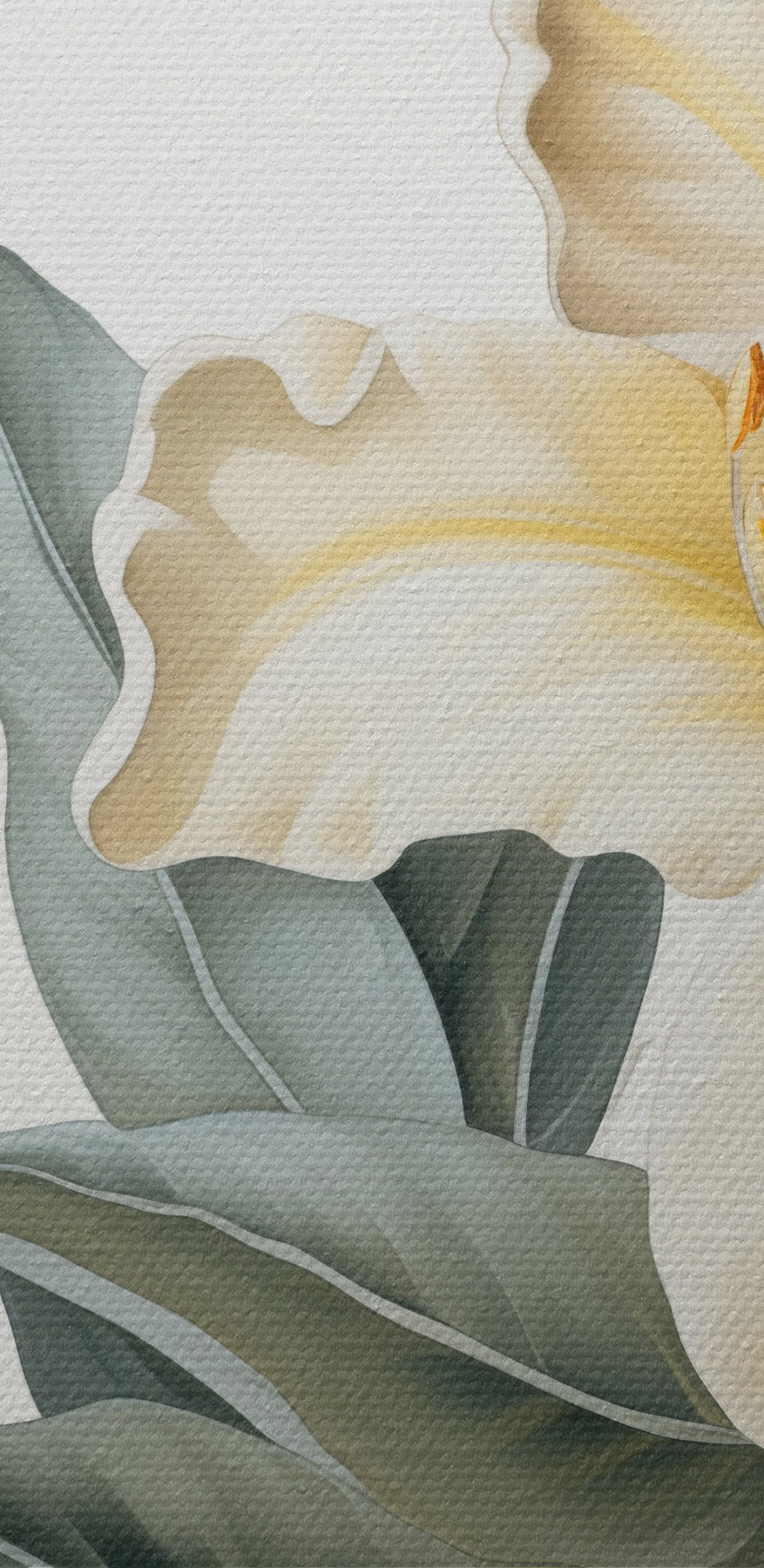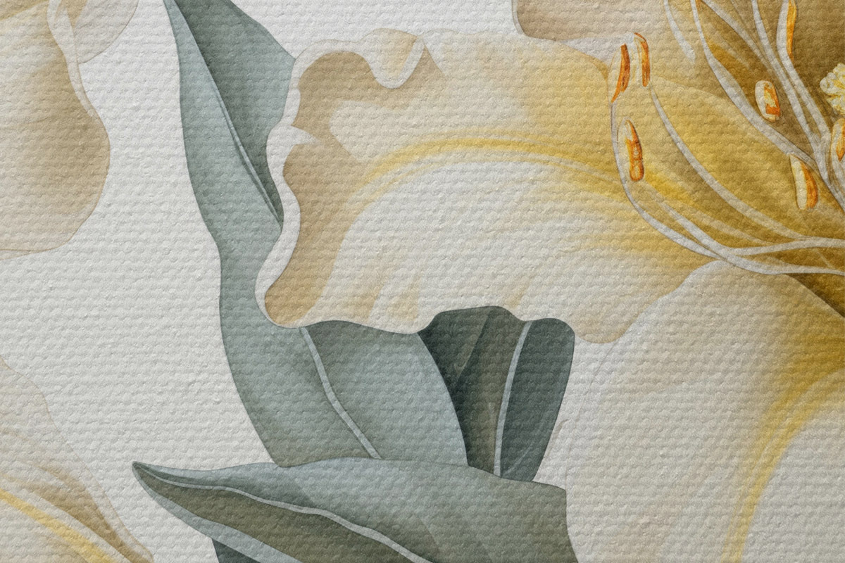 Nuotrauka Botaninė iliustracija, vaizduojanti baltas ir šviesiai geltonas gėles su įmantriais žiedlapiais, apsuptas žalių lapų Nr r42712