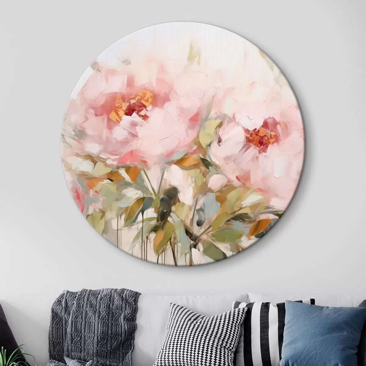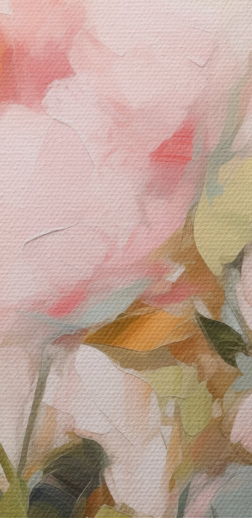 Nuotrauka Didelių rausvų bijūnų su minkštais žiedlapiais ir geltonais centrais, apsuptų žalių lapų, imitacija aliejiniais dažais Nr r42720