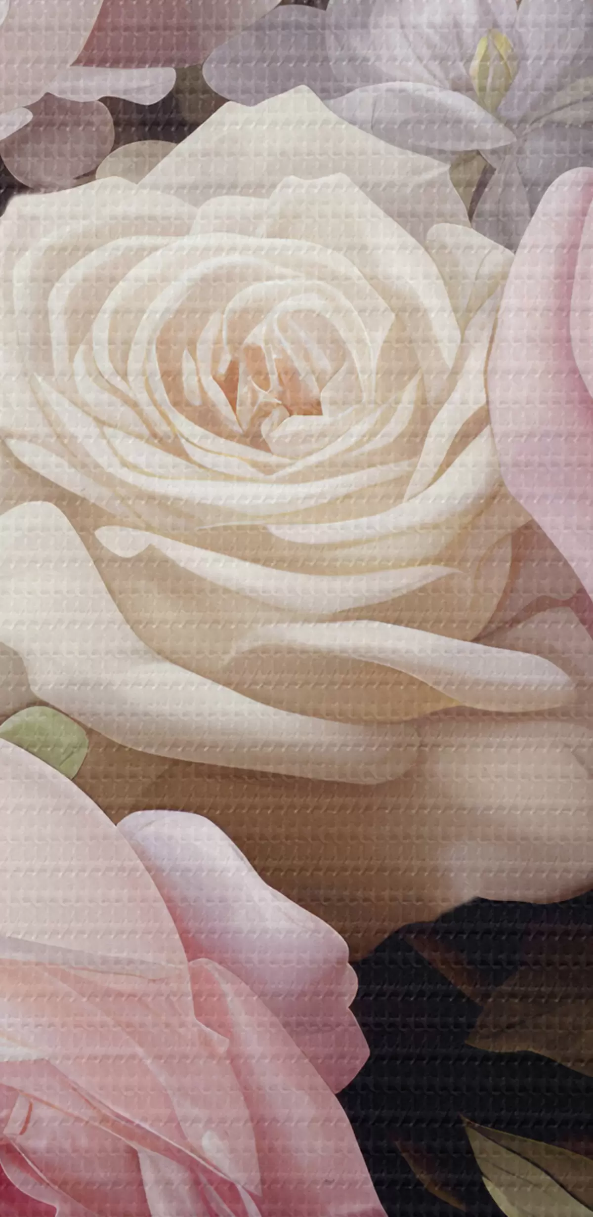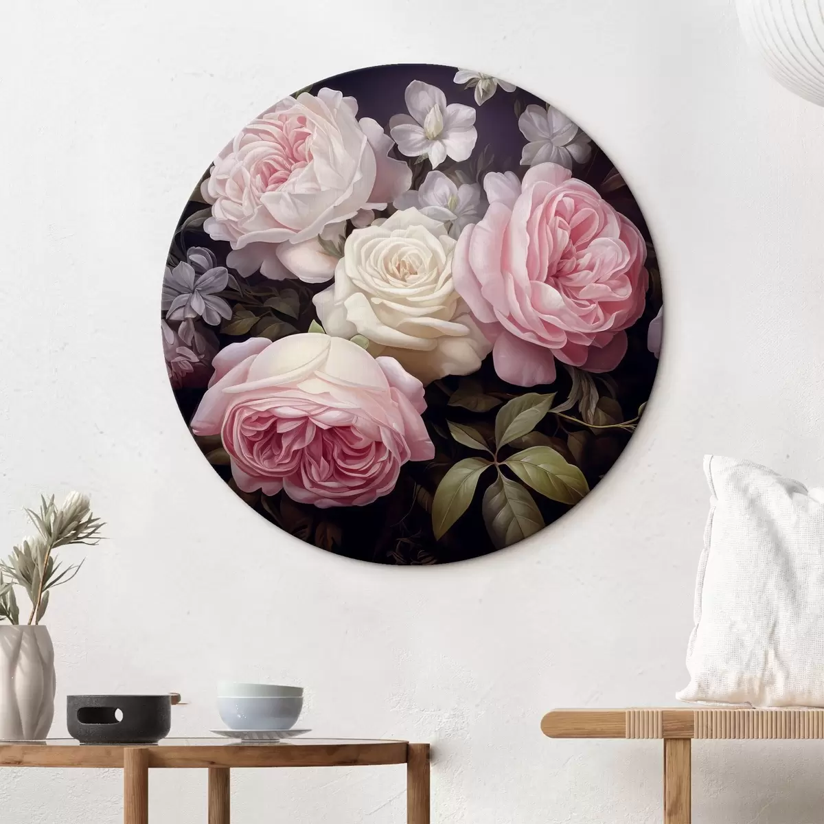 Nuotrauka Rožinės ir baltos rožės, komponuojamos su švelniomis baltomis gėlėmis ir žaliais lapais tamsiame fone Nr r42721