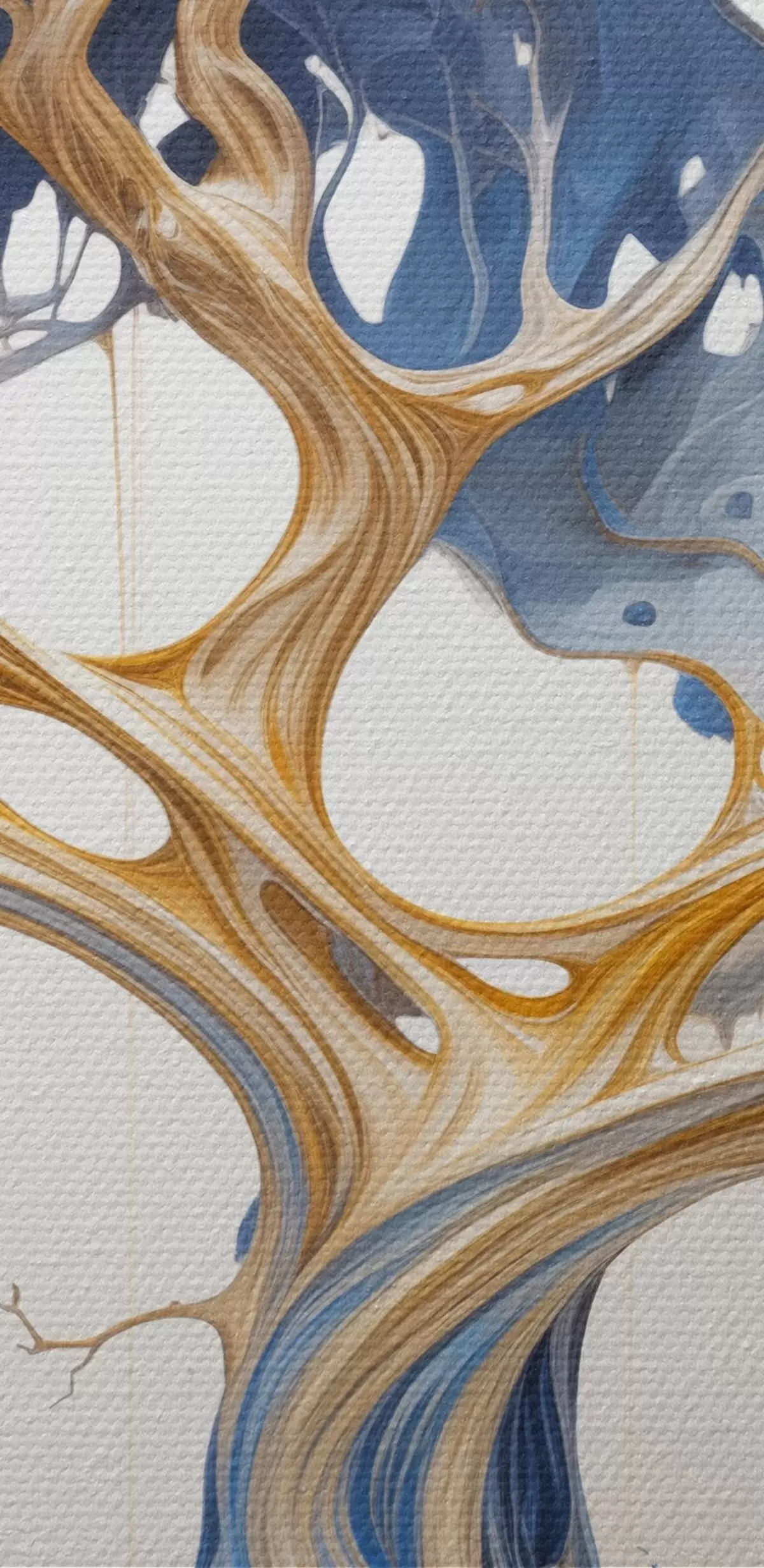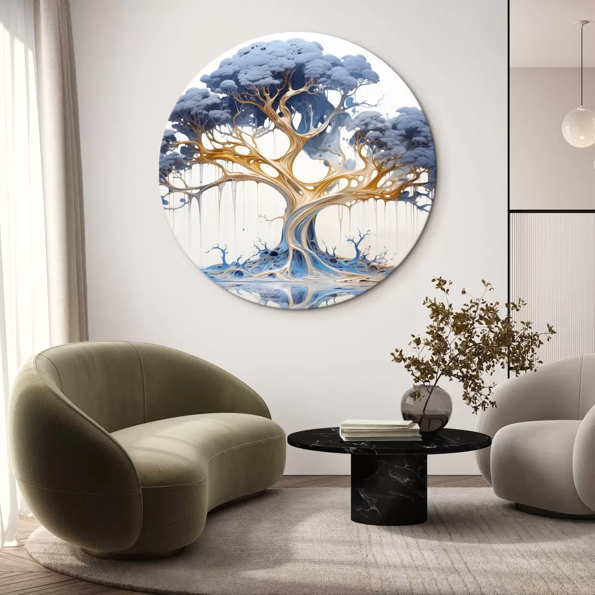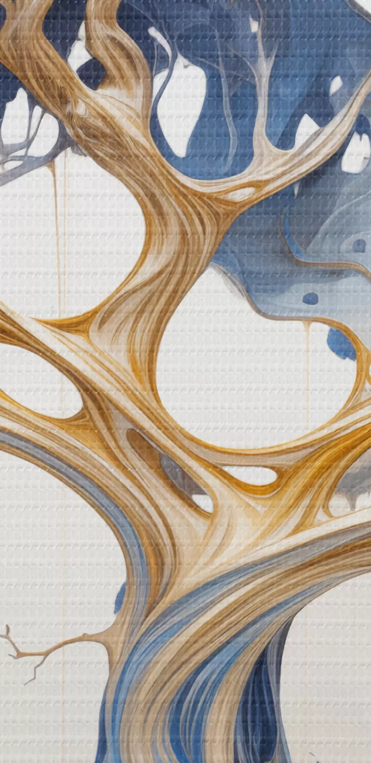 Nuotrauka Stilizuotas medis su įmantriomis šakomis ir lapais, kuriame dera mėlyni ir geltoni atspalviai Nr r42722