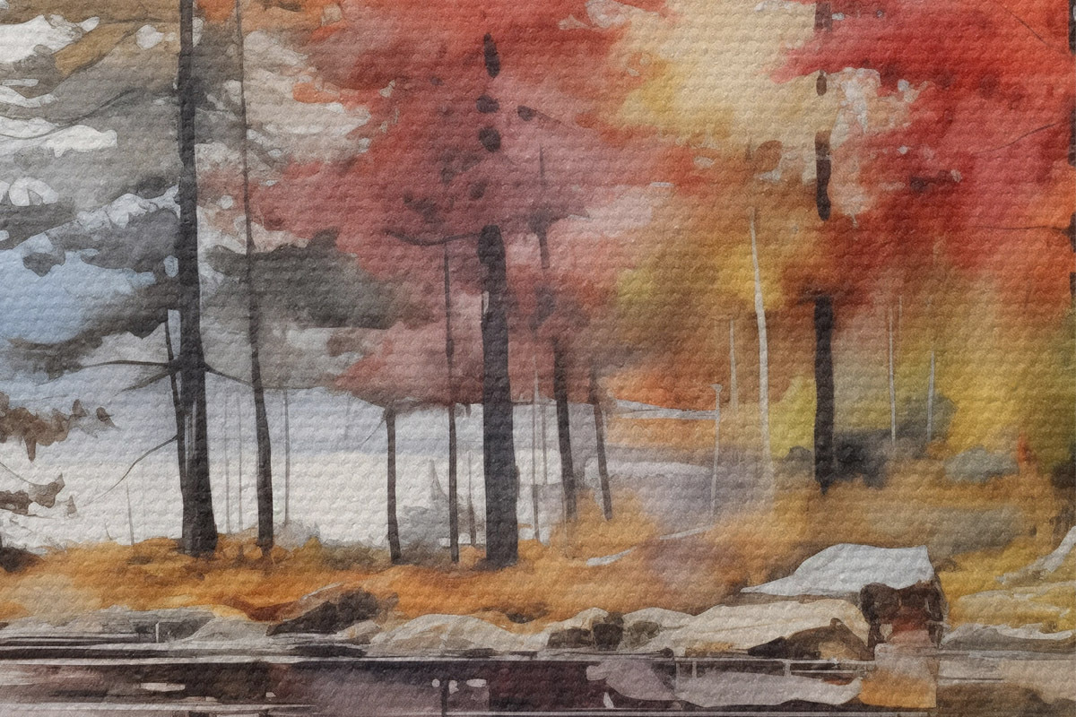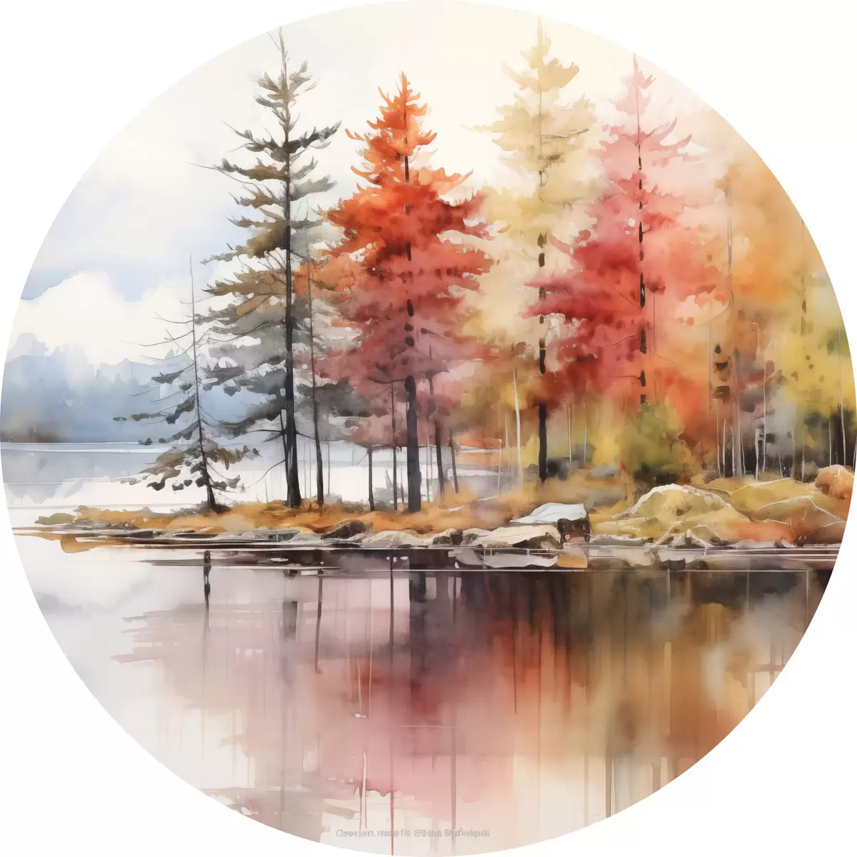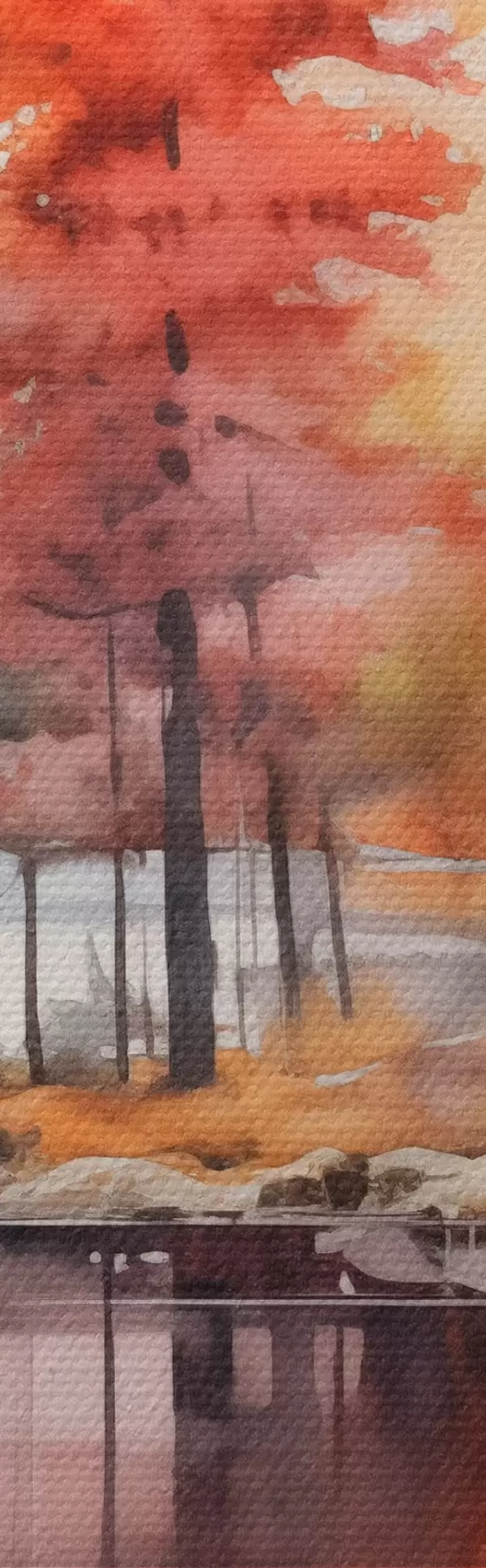 Nuotrauka Akvarelinis kraštovaizdis su ežeru, apsuptu ryškiomis rudens spalvomis nusidažiusių medžių Nr r42727
