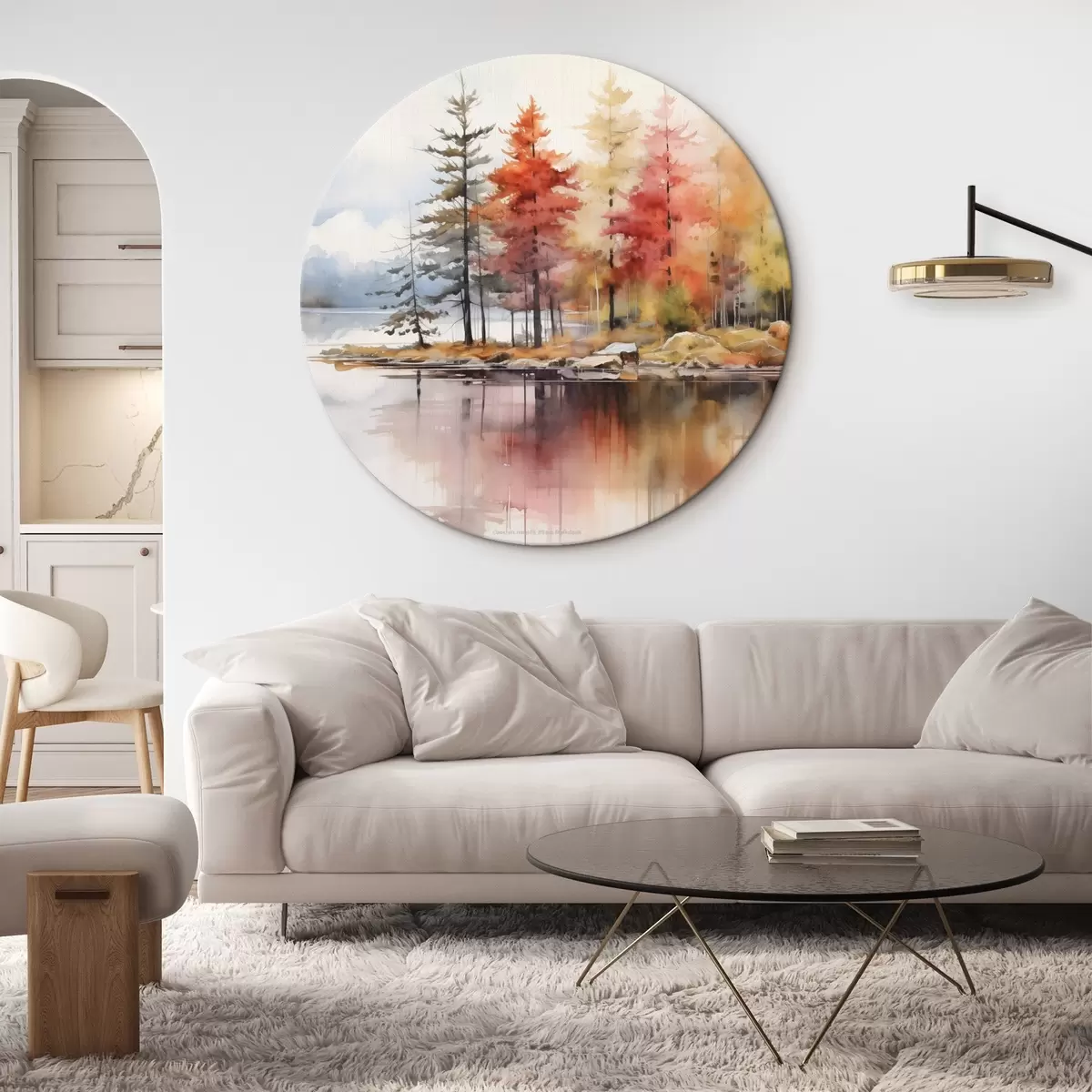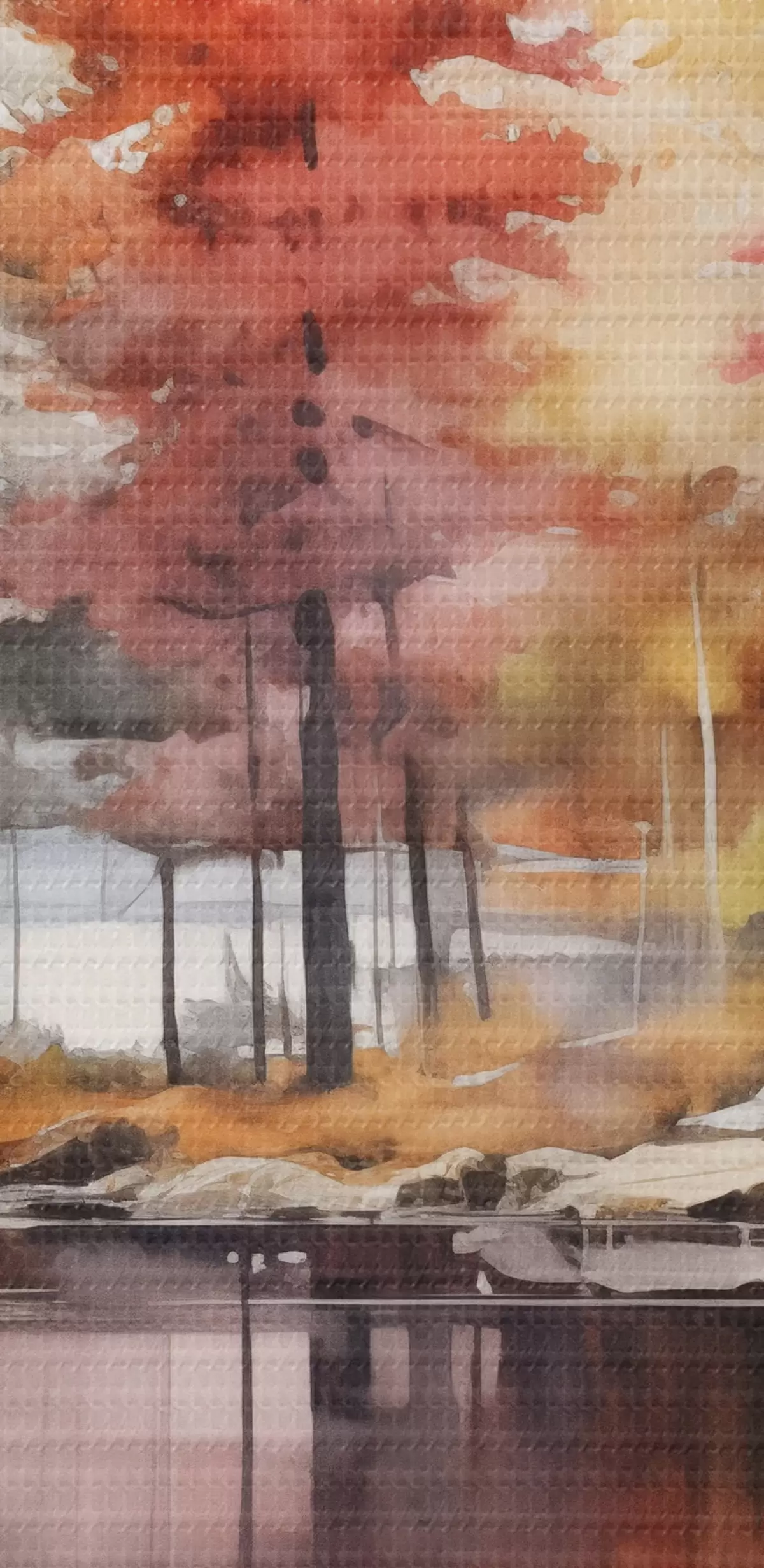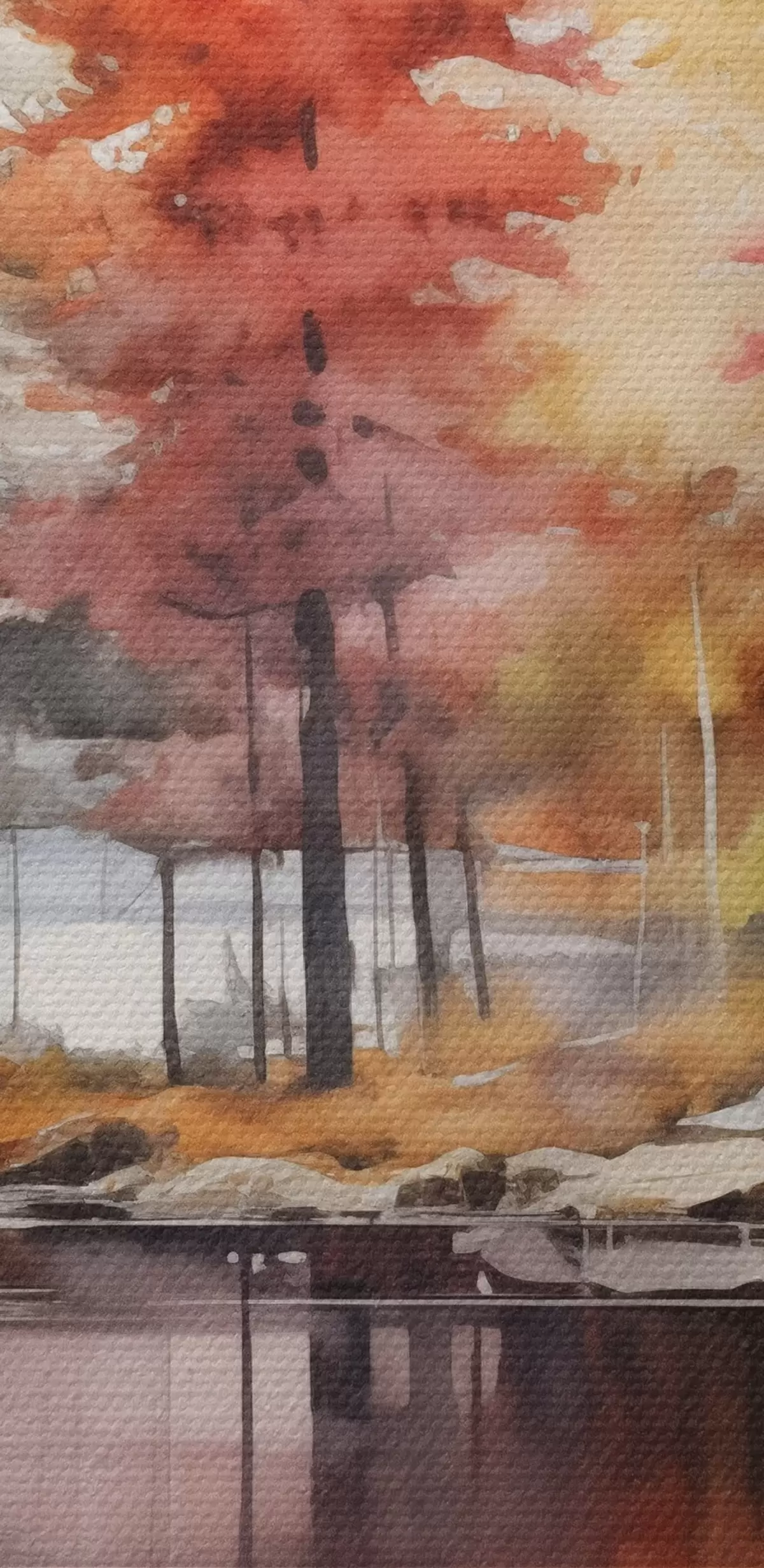 Nuotrauka Akvarelinis kraštovaizdis su ežeru, apsuptu ryškiomis rudens spalvomis nusidažiusių medžių Nr r42727