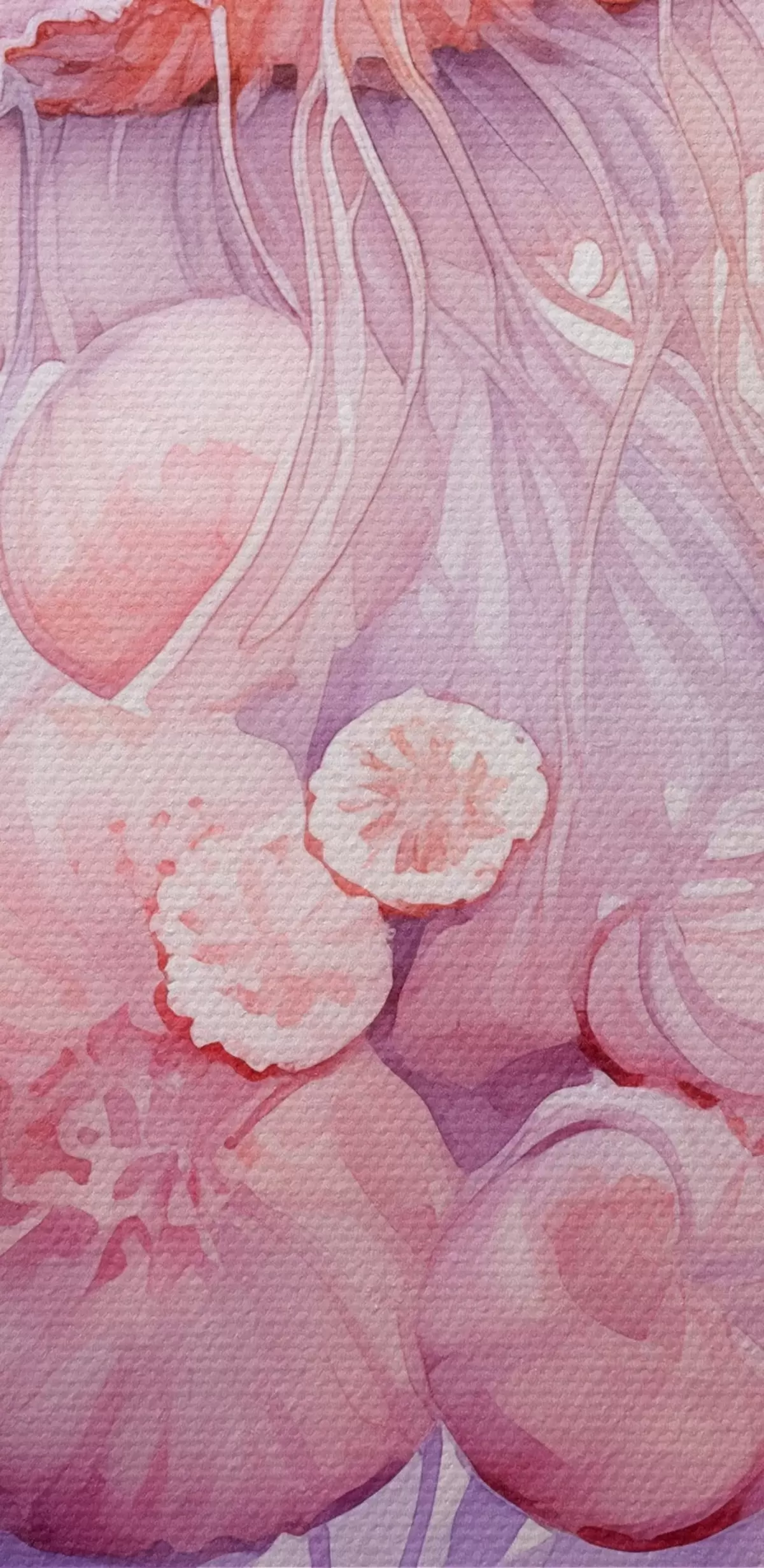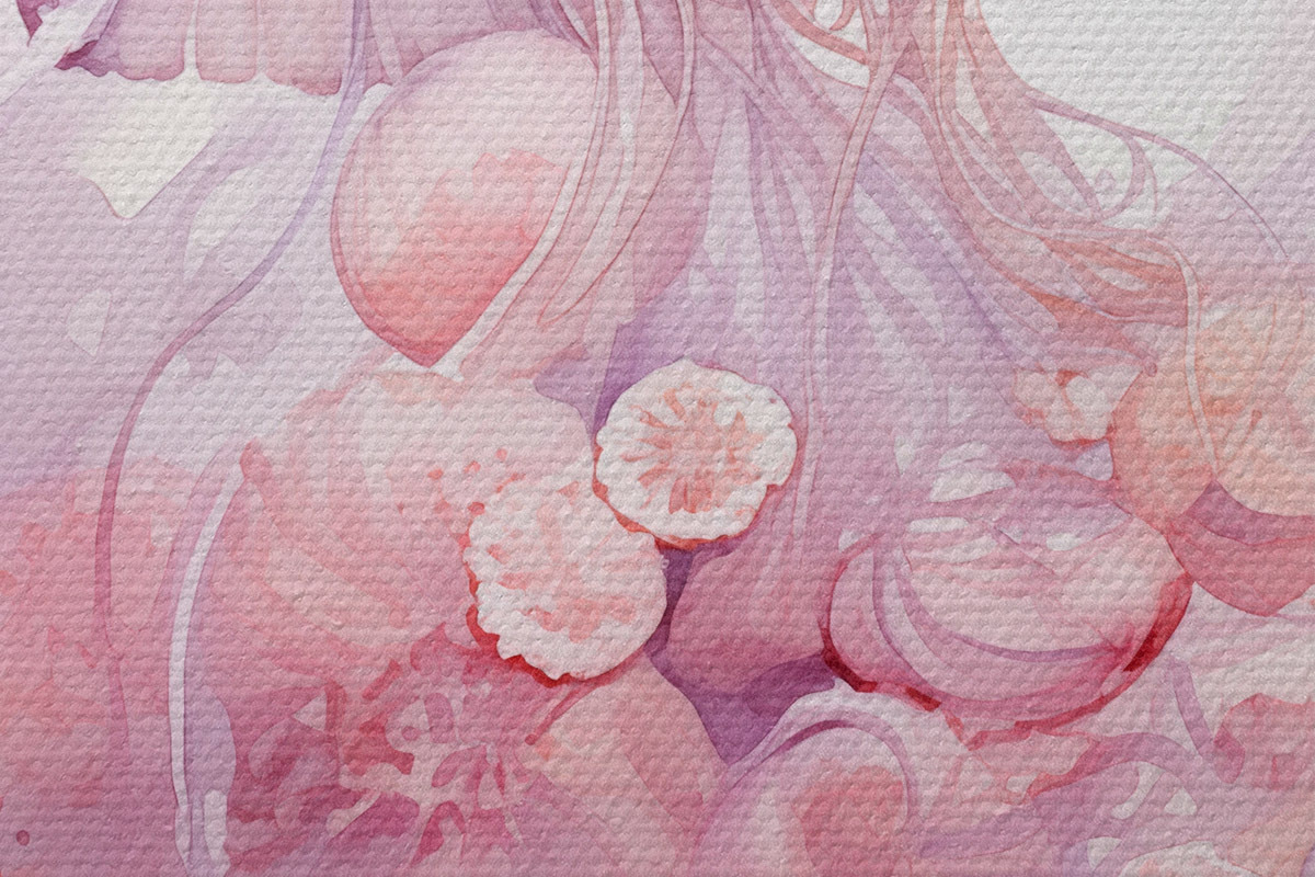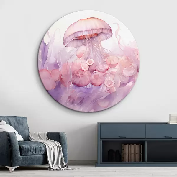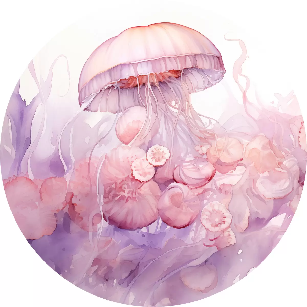 Nuotrauka Rausvos medūzos, plaukiojančios švelnių rausvų ir violetinių atspalvių sūkuryje, apsuptos abstrakčių formų Nr r42730