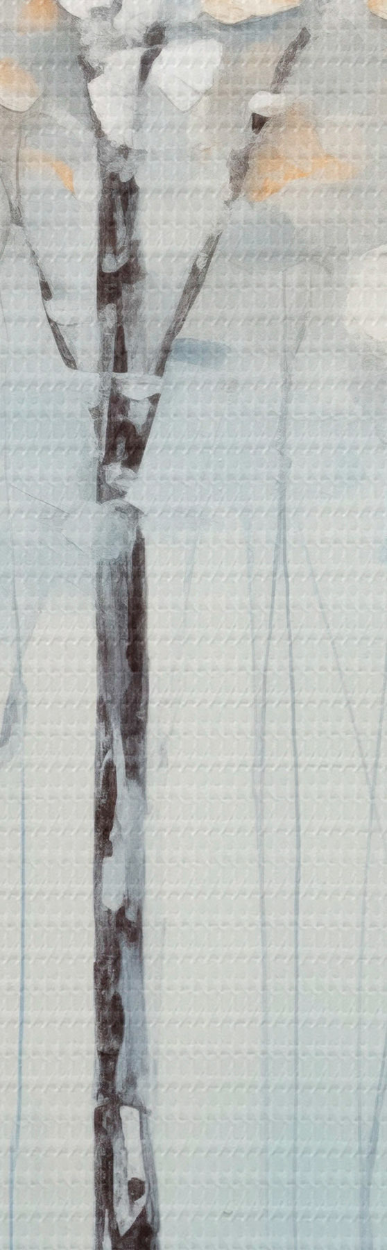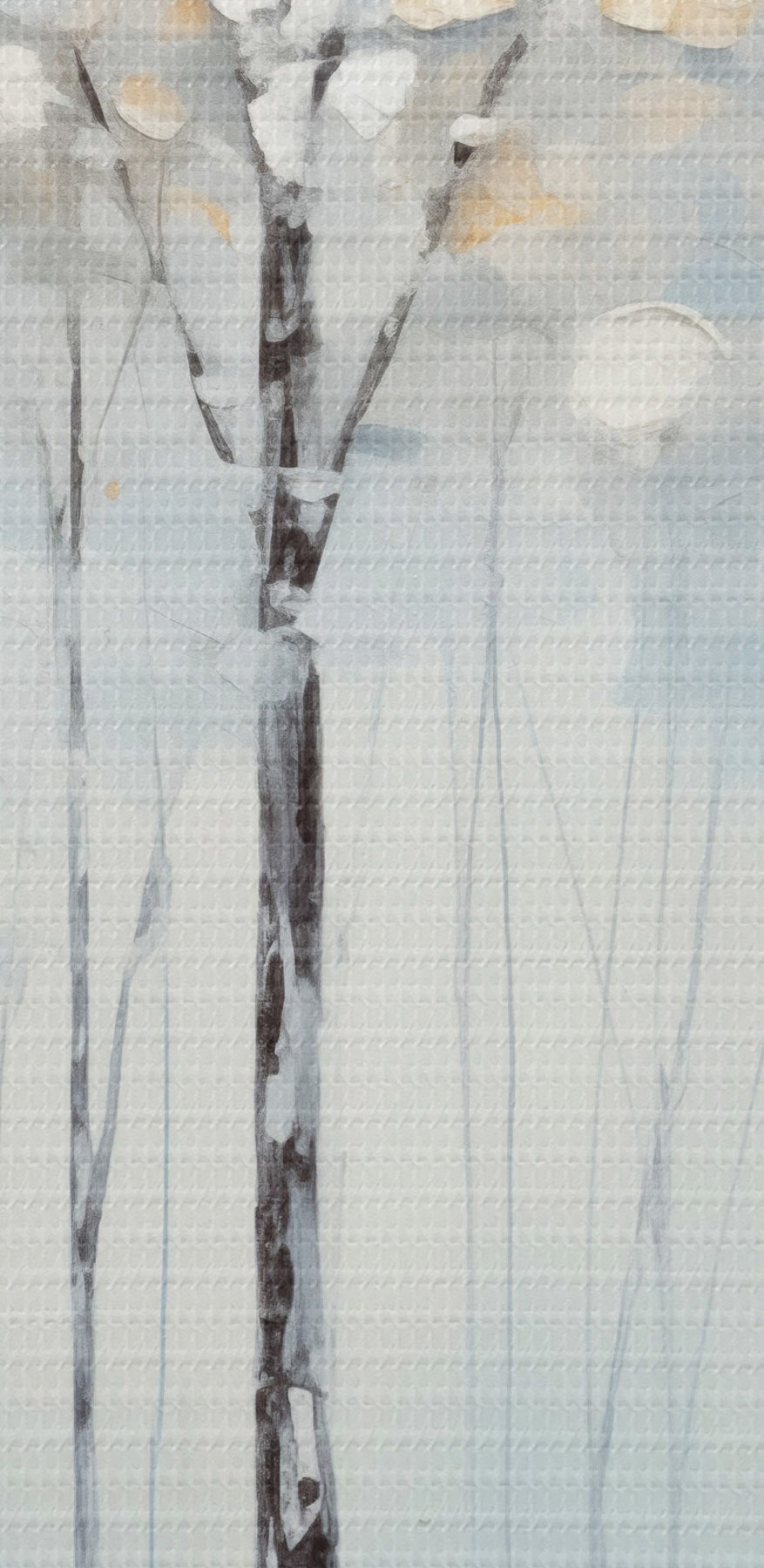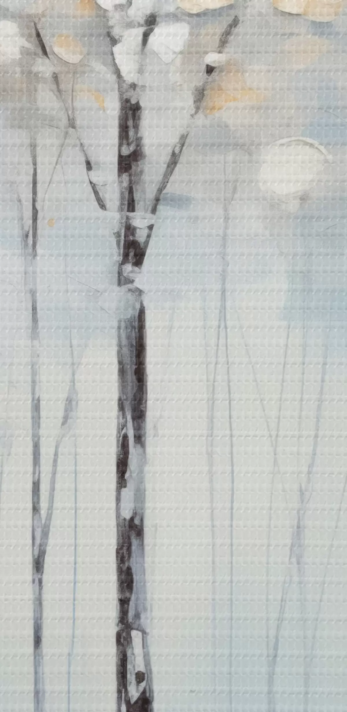 Nuotrauka Aukšti, liekni medžiai su mėlynais lapais ir geltonais atspalviais švelniai mėlyname fone, aliejinės tapybos imitacija Nr r42731