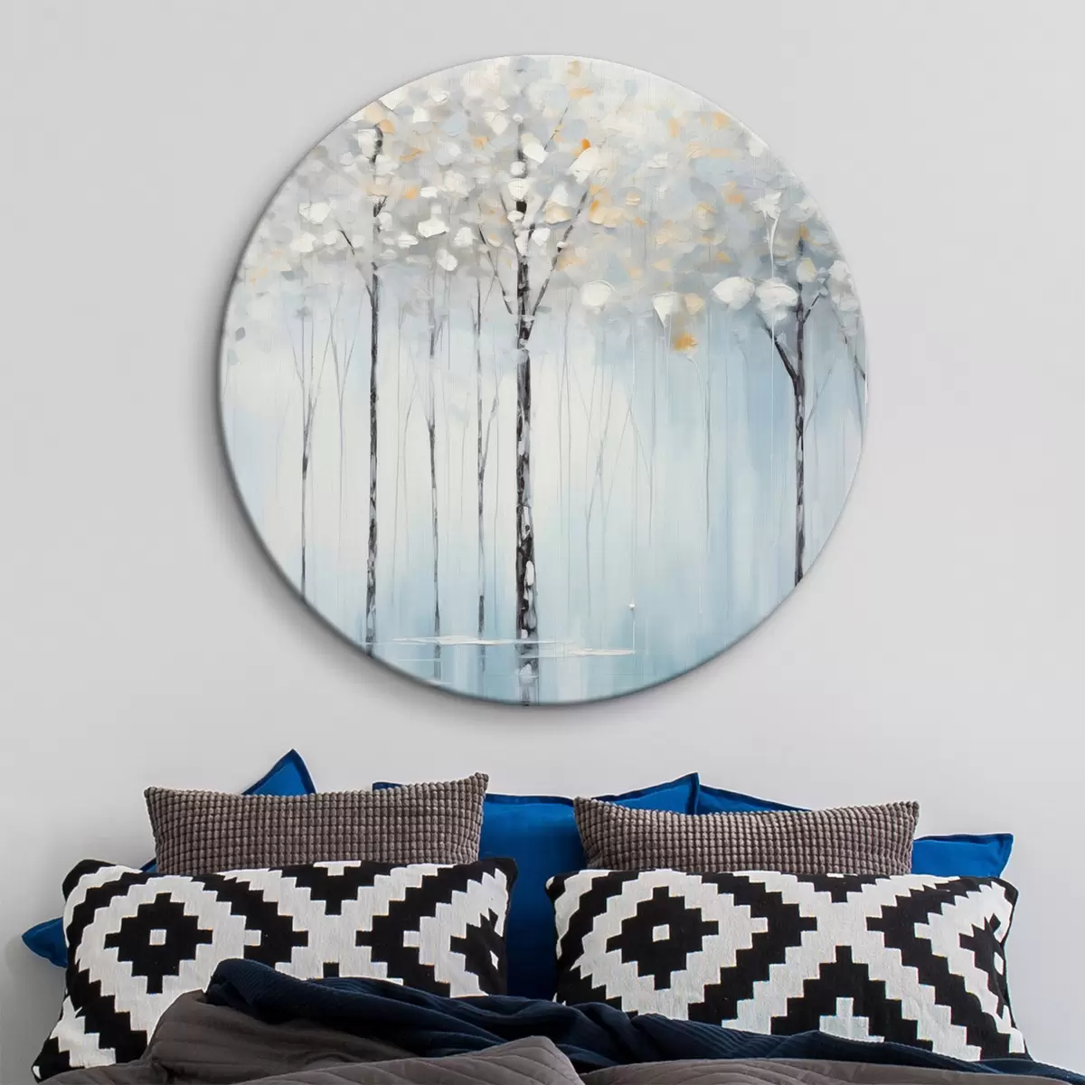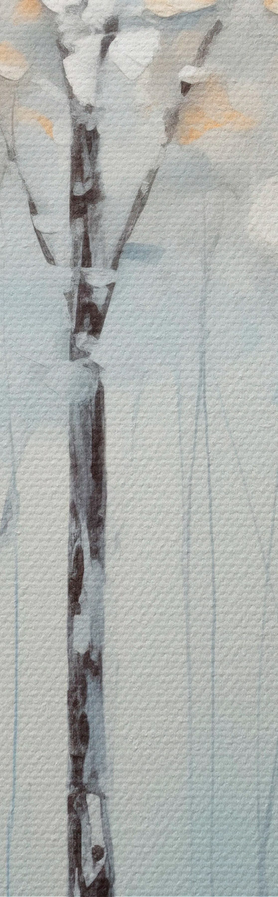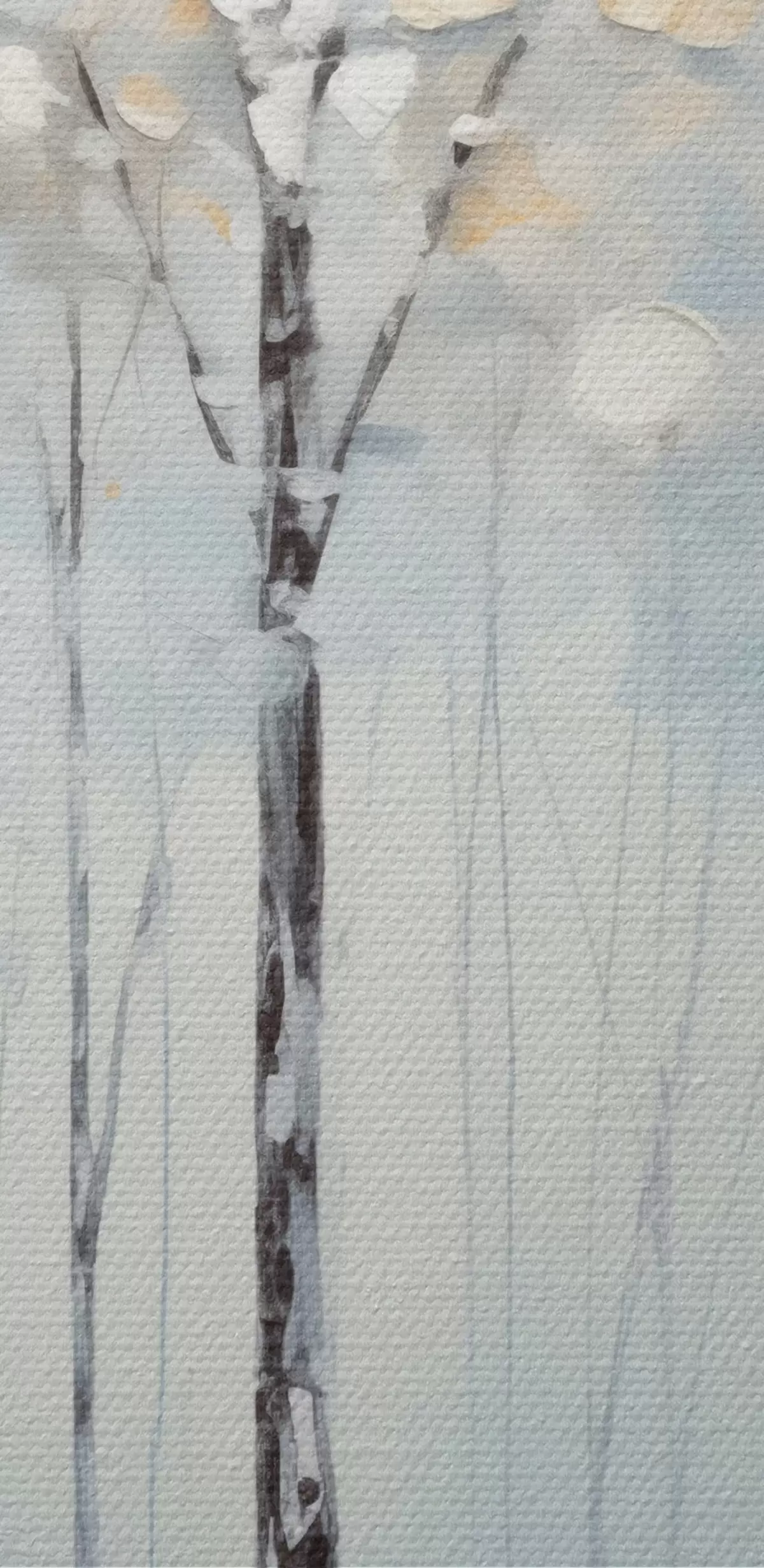 Nuotrauka Aukšti, liekni medžiai su mėlynais lapais ir geltonais atspalviais švelniai mėlyname fone, aliejinės tapybos imitacija Nr r42731