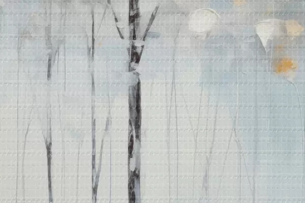 Nuotrauka Aukšti, liekni medžiai su mėlynais lapais ir geltonais atspalviais švelniai mėlyname fone, aliejinės tapybos imitacija Nr r42731
