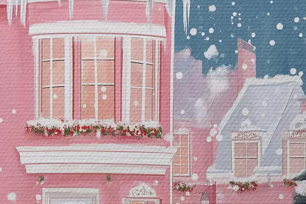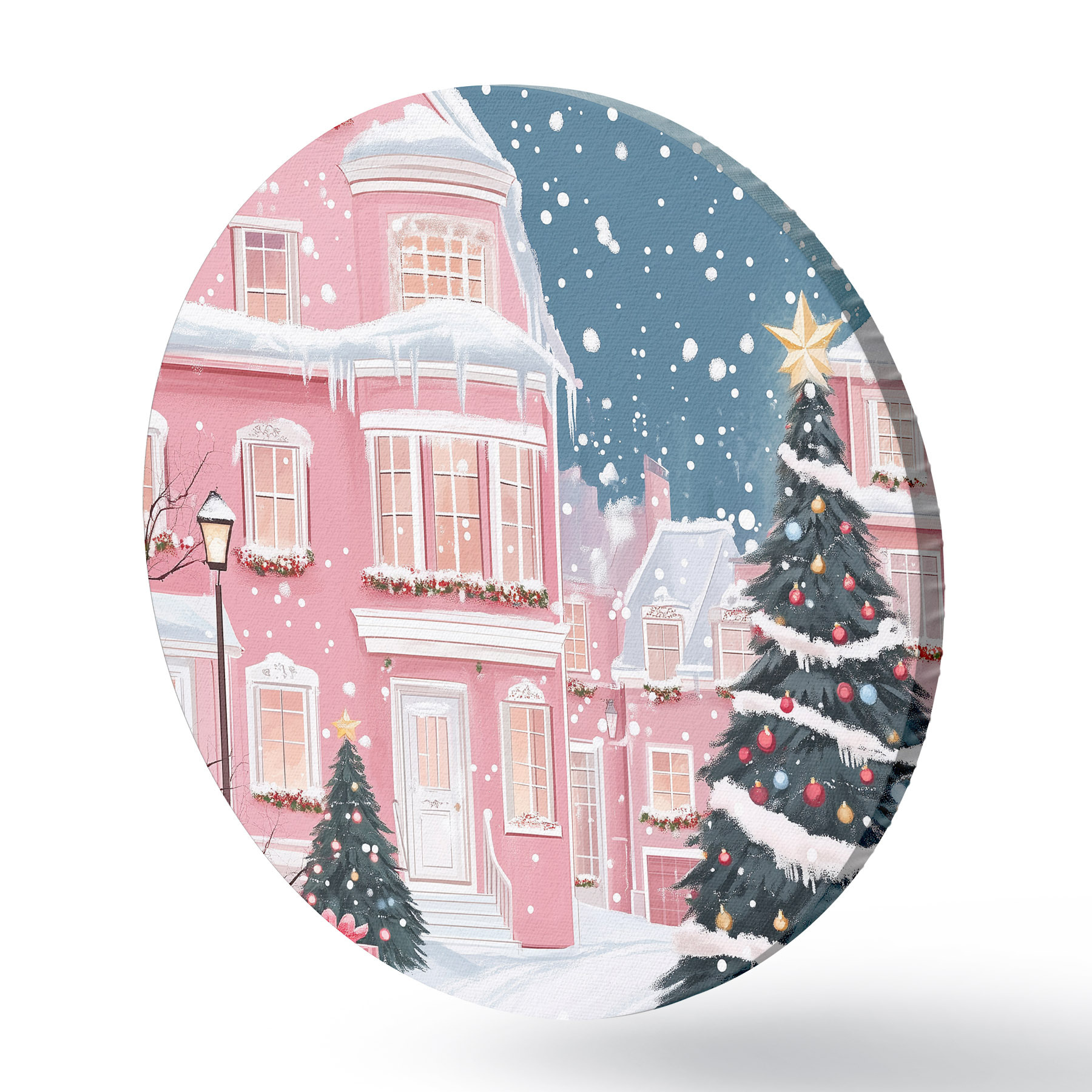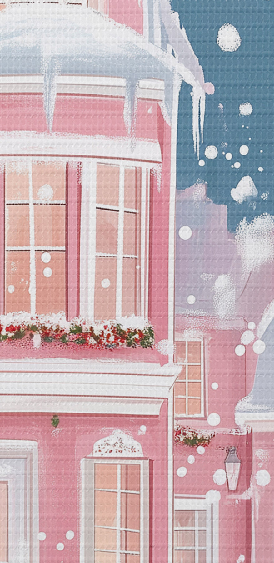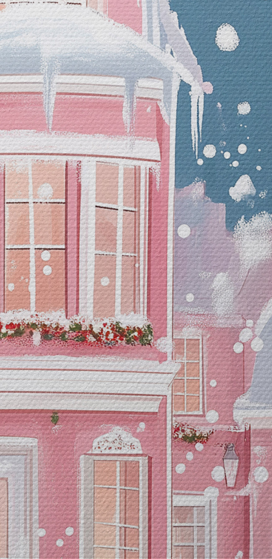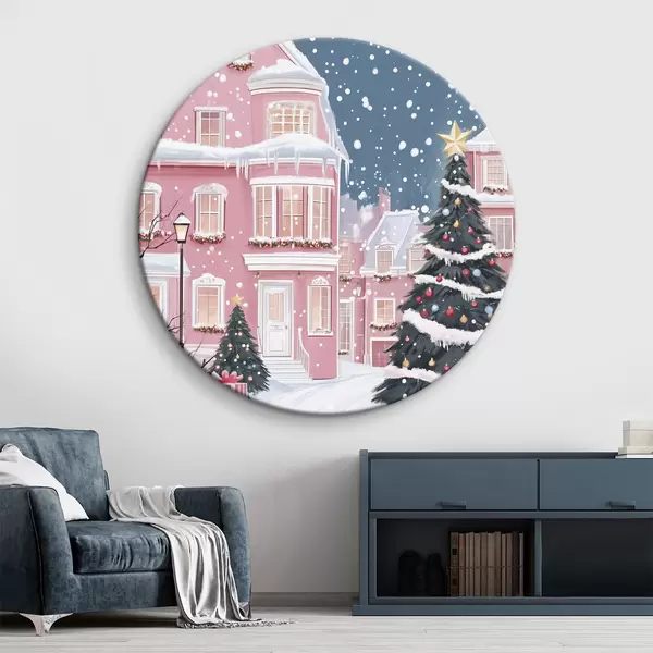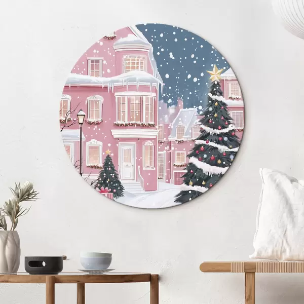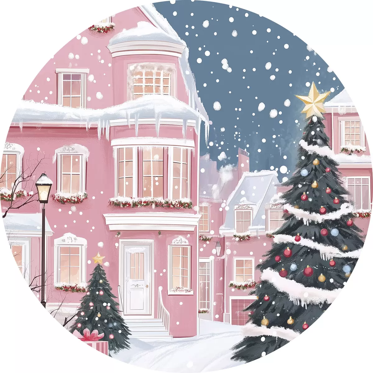 Nuotrauka Žiemos miestas su rožiniais namais, kalėdinėmis eglutėmis, snaigėmis Nr r42792