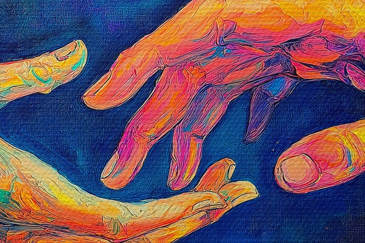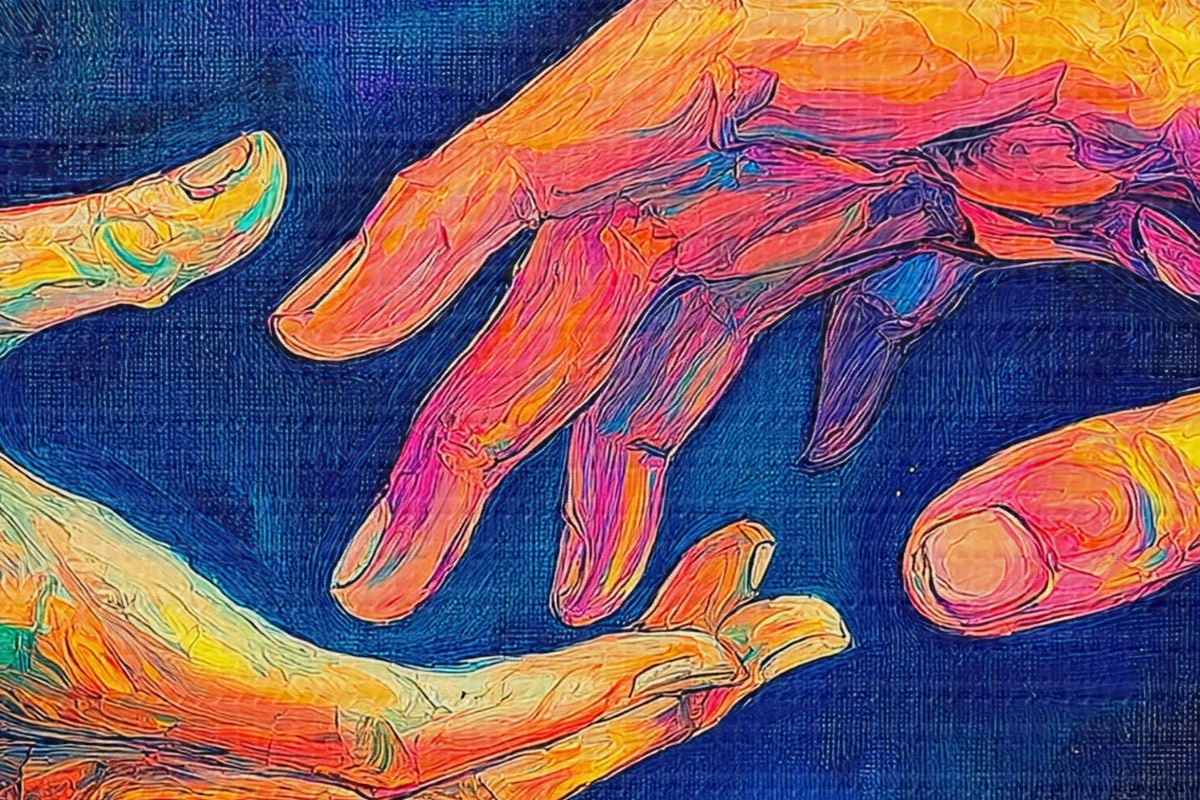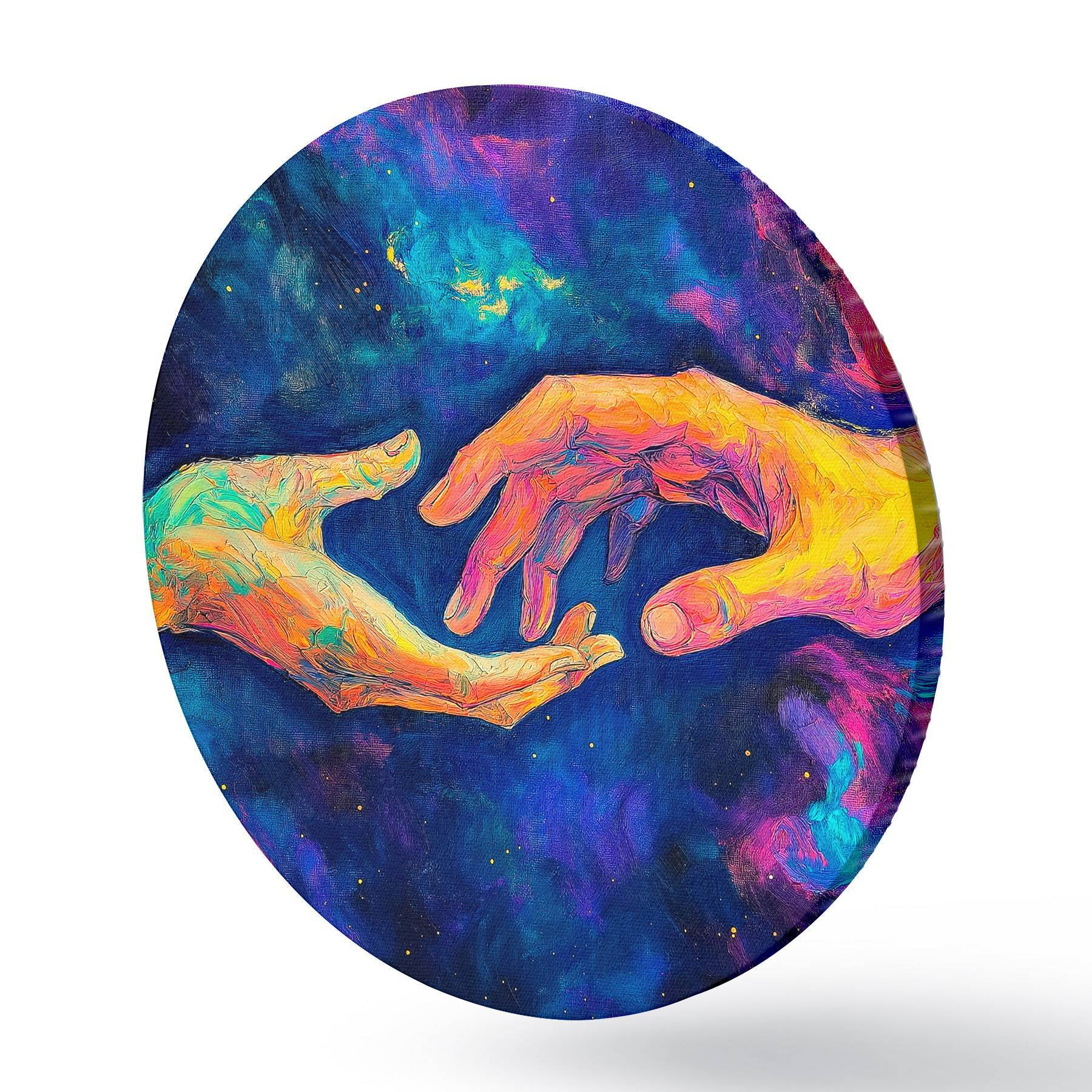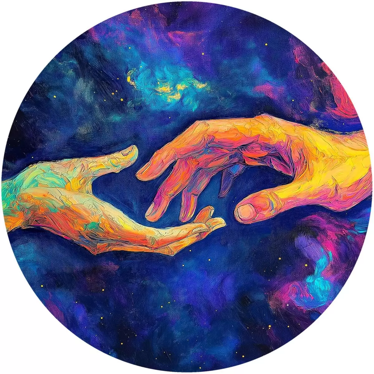 Nuotrauka Abstrakti dviejų rankų, siekiančių viena kitos, kompozicija kosminiame fone su ryškiomis spalvomis Nr r42937