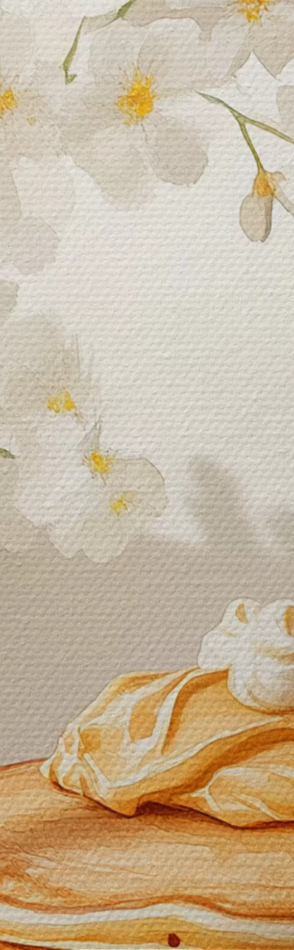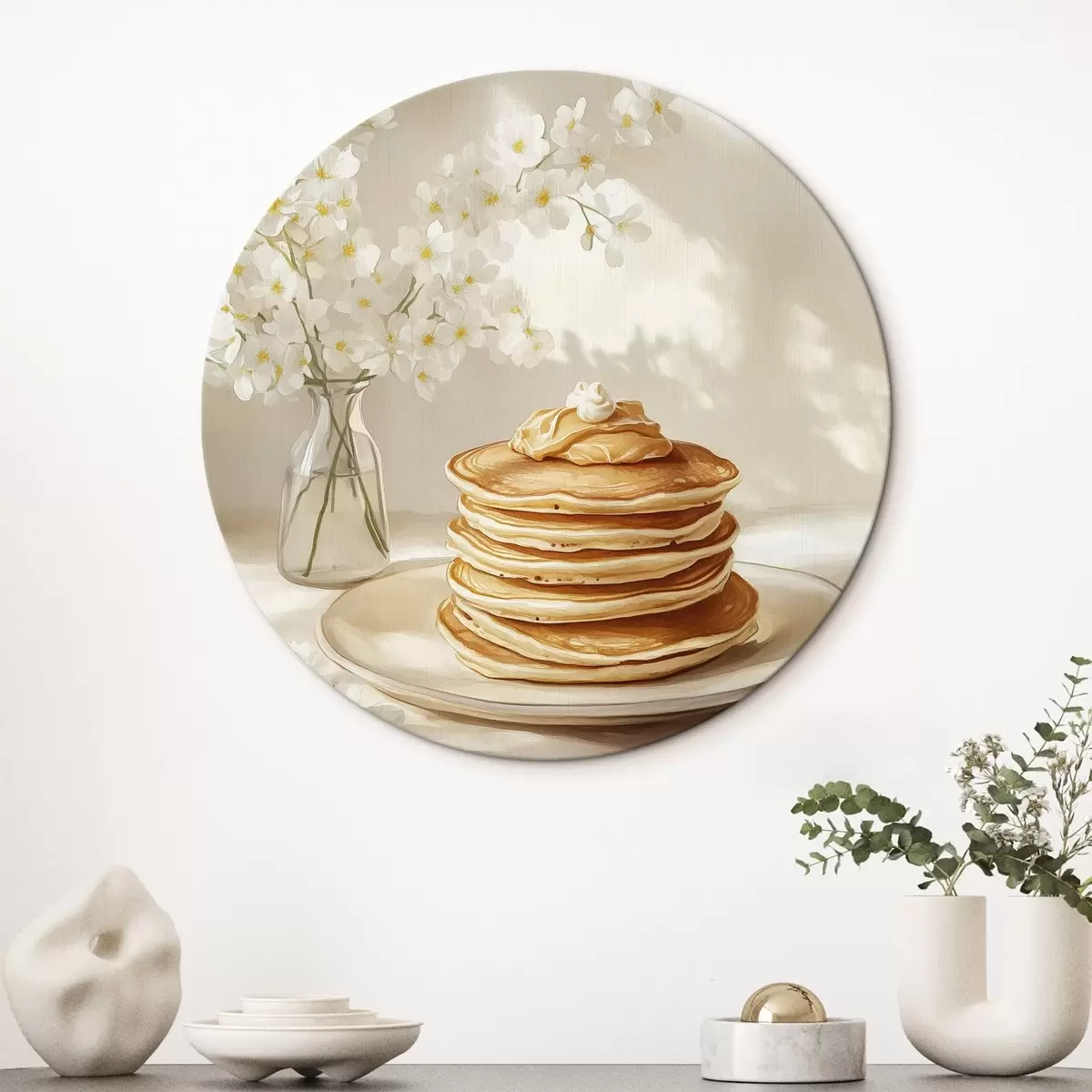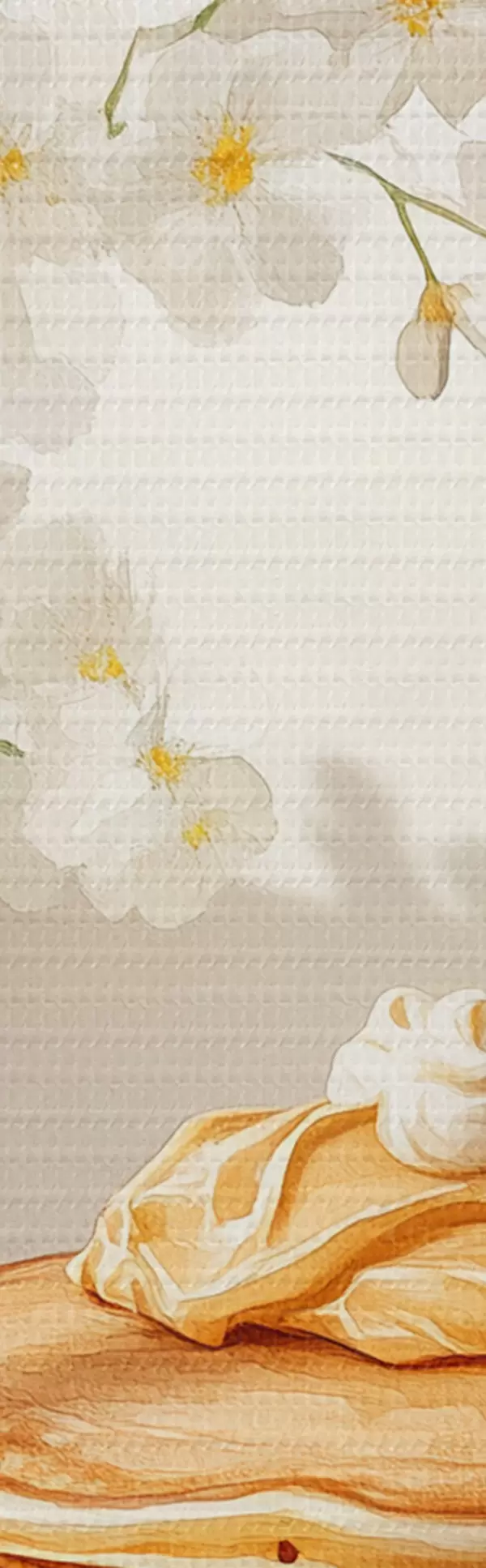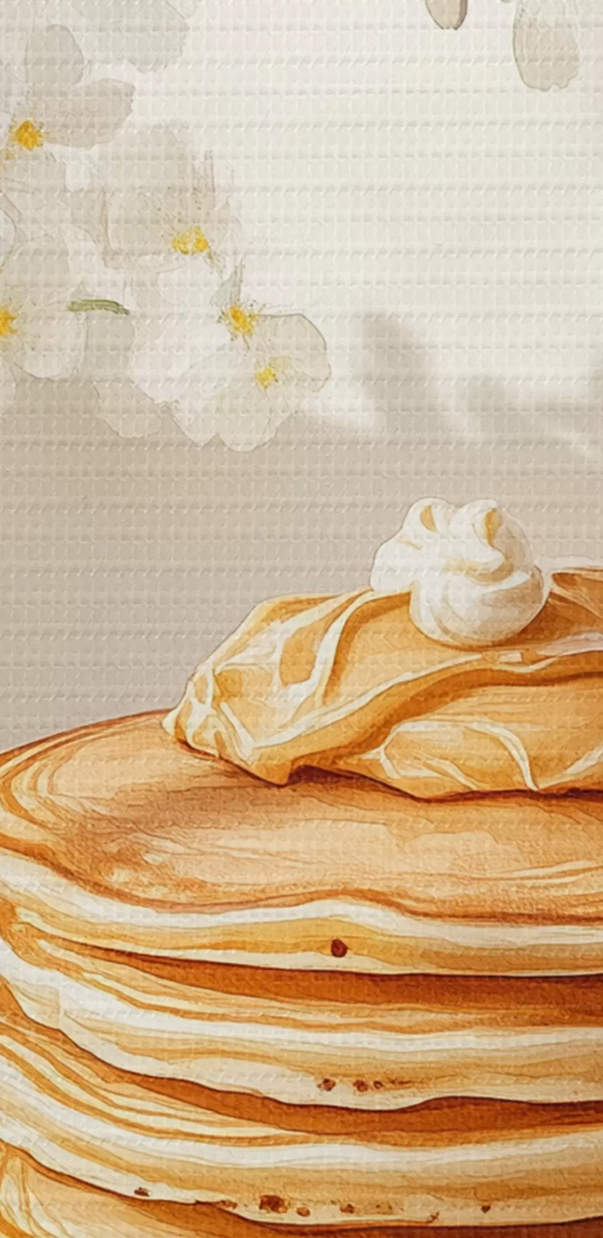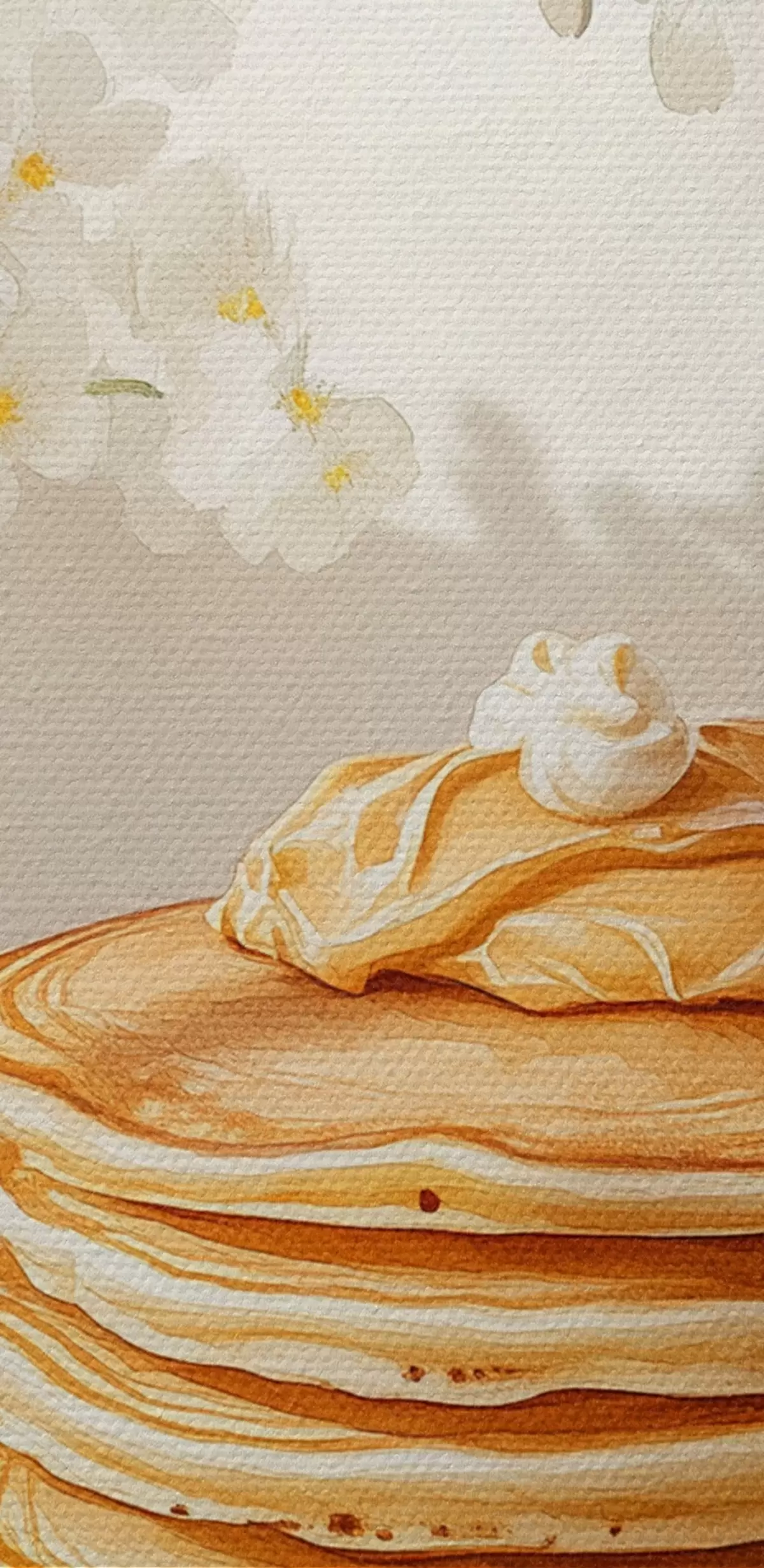 Nuotrauka Skanūs blyneliai su žemės riešutų sviestu, akvarelės stilius, vaza su baltomis gėlėmis Nr r43063